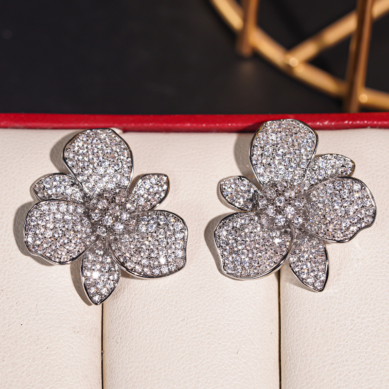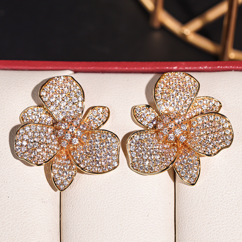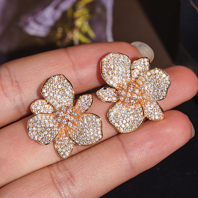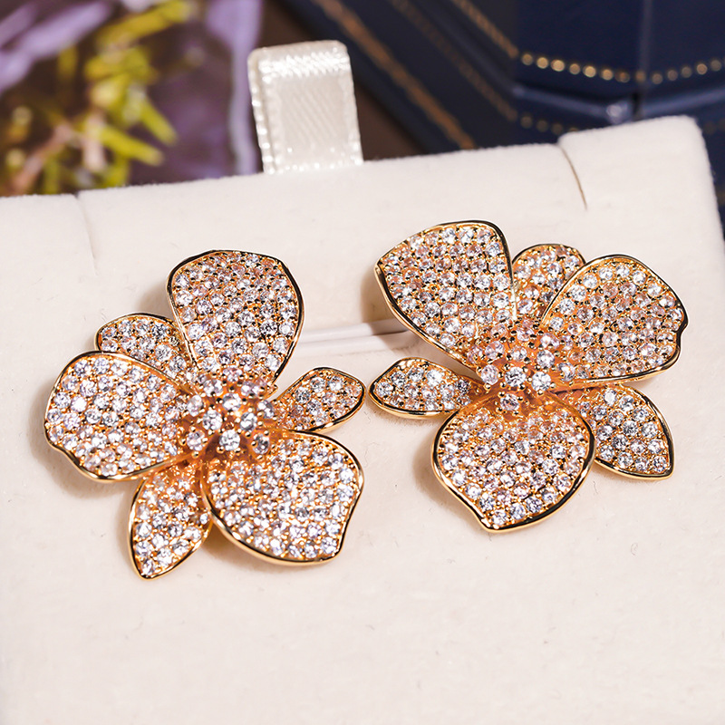 Boucles d'oreilles en laiton zircon cubique pavent, fleur, Plaqué d'or rose, pavé de micro zircon & pour femme Vendu par paire