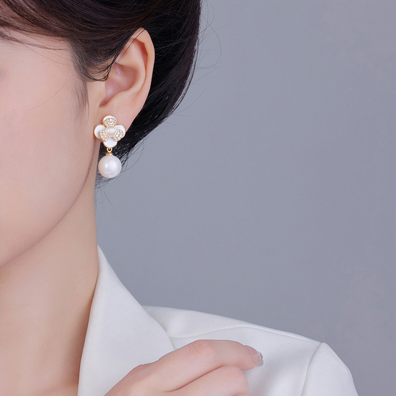 Boucles d'oreilles en laiton zircon cubique pavent, avec Plastique ABS perle, Placage de couleur d'or, bijoux de mode & pavé de micro zircon & émail, doré, 17x32mm, Vendu par paire