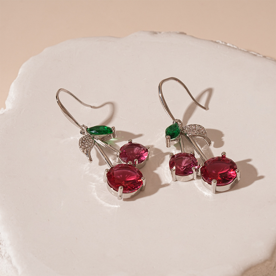Boucles d'oreilles en laiton zircon cubique pavent, cerise, Placage de couleur argentée, bijoux de mode & pavé de micro zircon, argent, 45x45mm, Vendu par paire