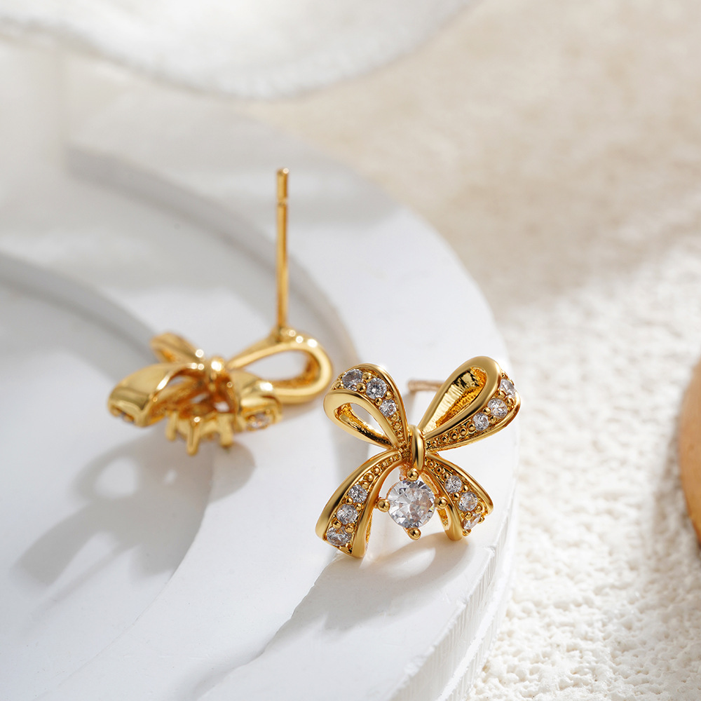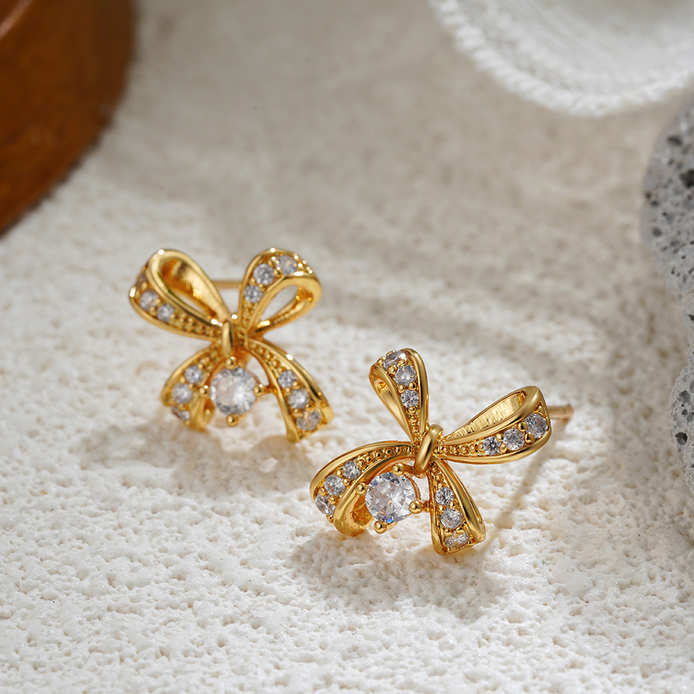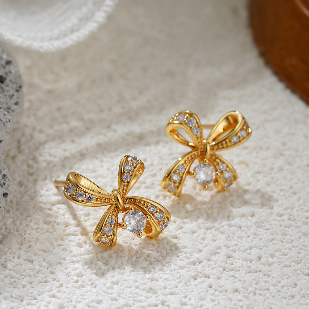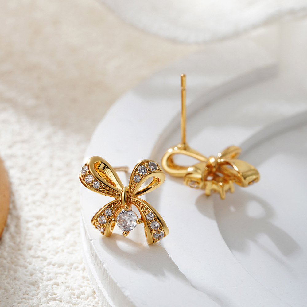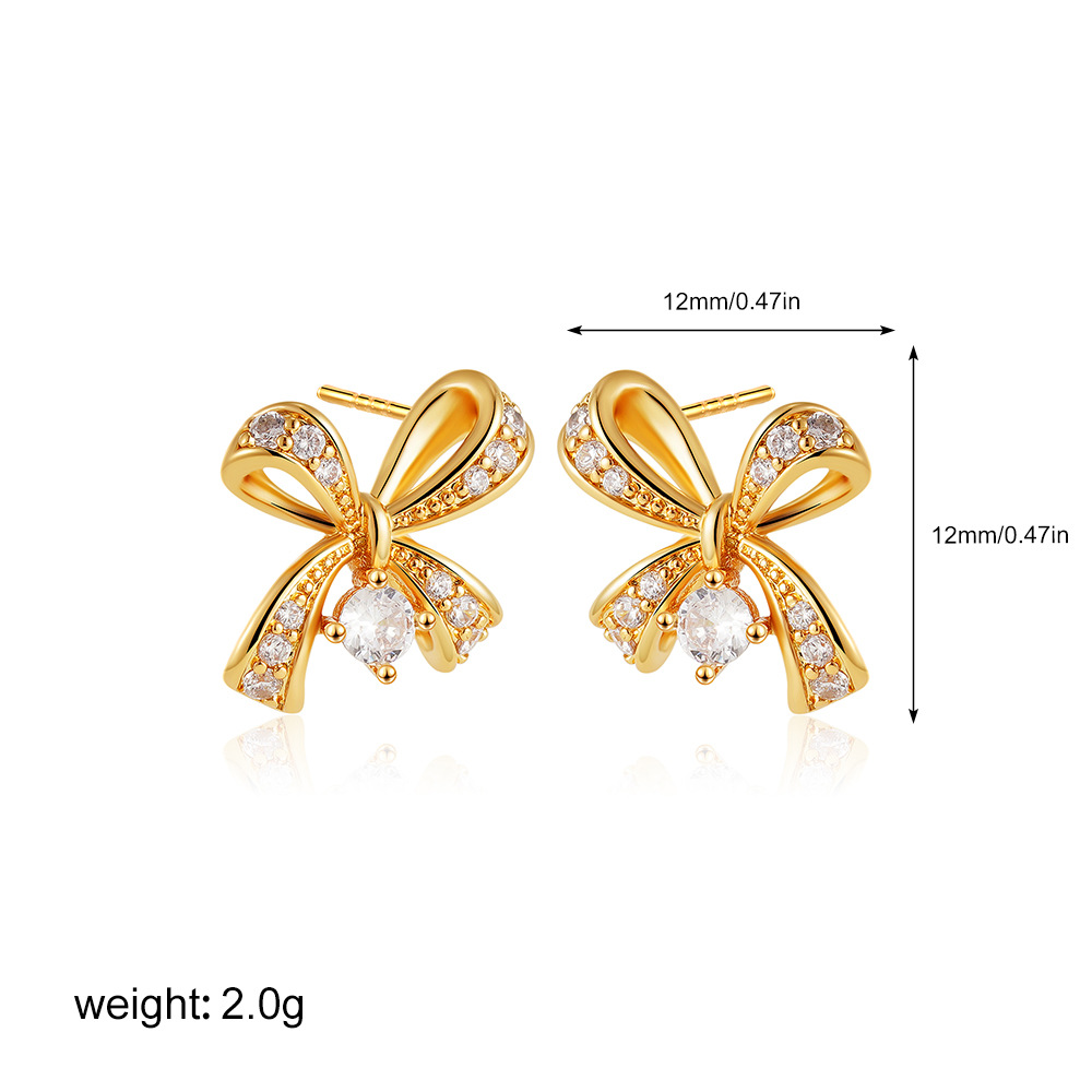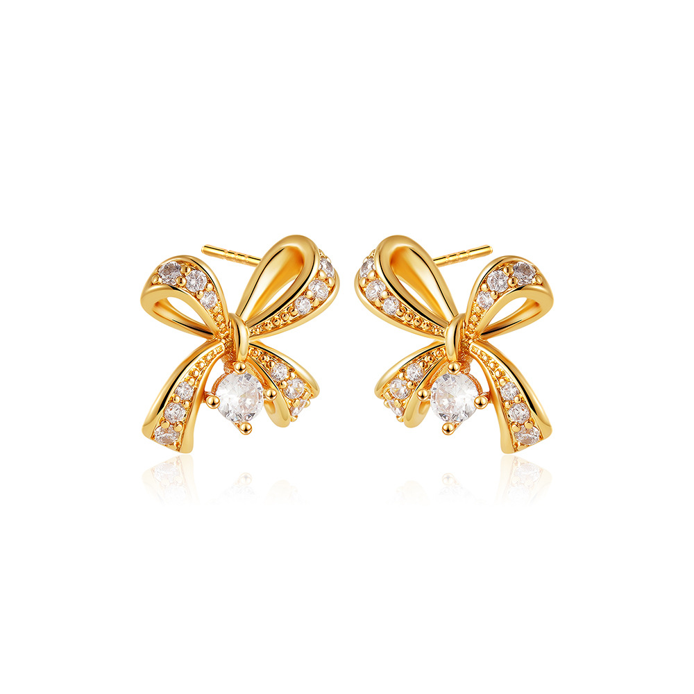 Boucles d'oreilles en laiton zircon cubique pavent, Noeud papillon, Plaqué or 18K, pavé de micro zircon & pour femme & creux, Vendu par paire