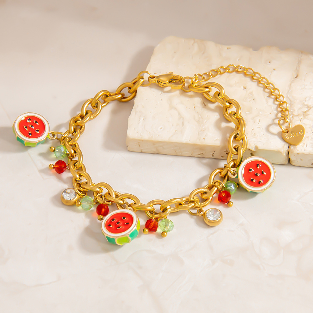 Bracelet en acier inoxydable, Acier titane, pastèque, Placage de couleur d'or, pour femme & émail & avec strass, couleurs mélangées, Vendu par PC