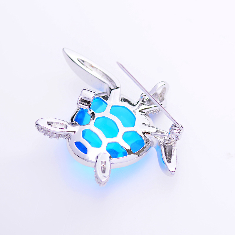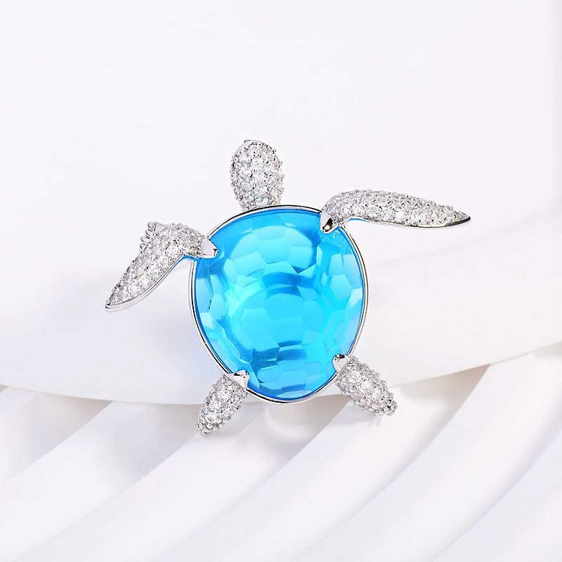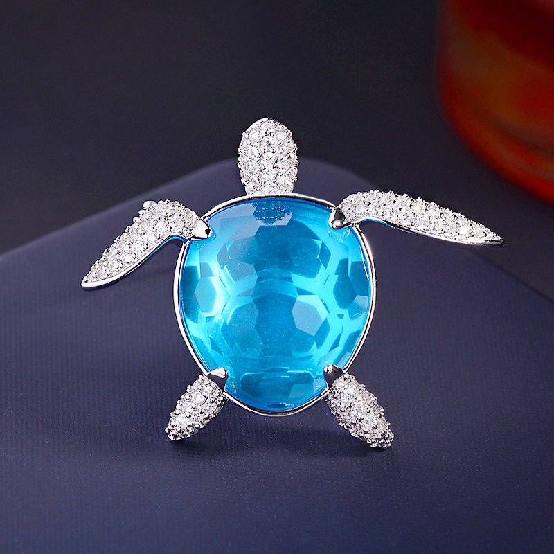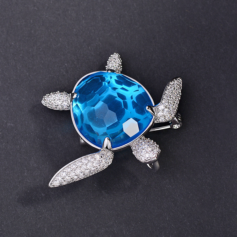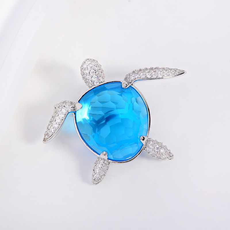 Broche de zircon cubique, laiton, tortue, Placage de couleur argentée, bijoux de mode & pavé de micro zircon, bleu, 42x32mm, Vendu par PC