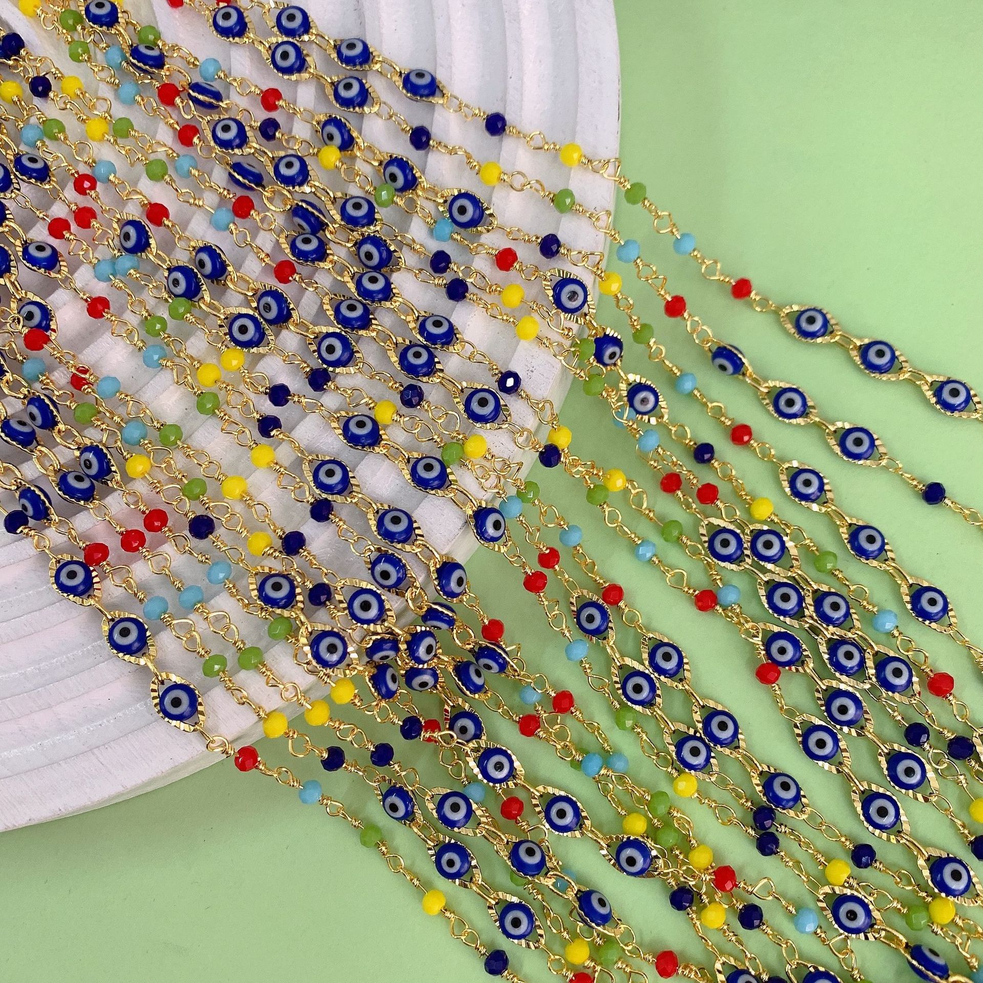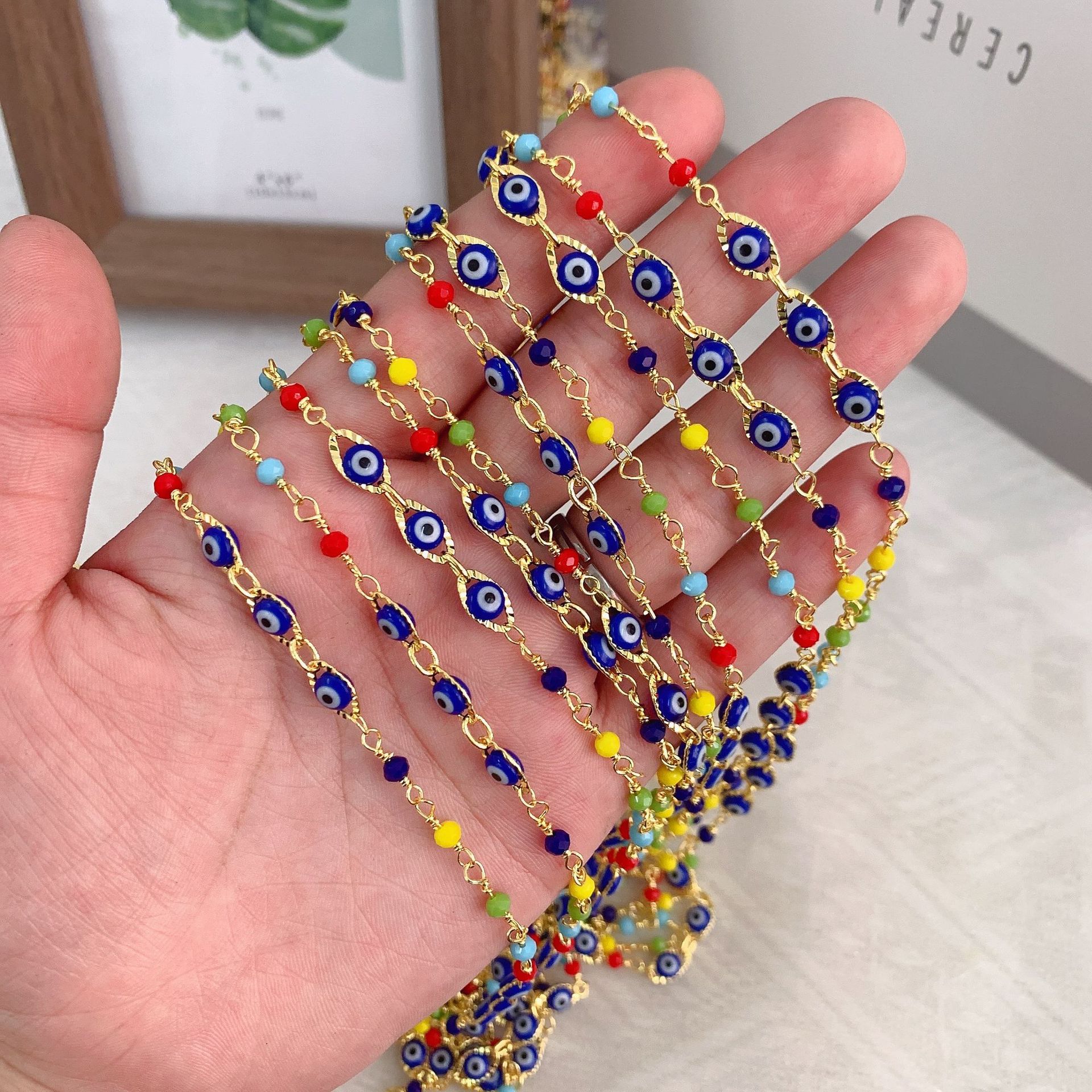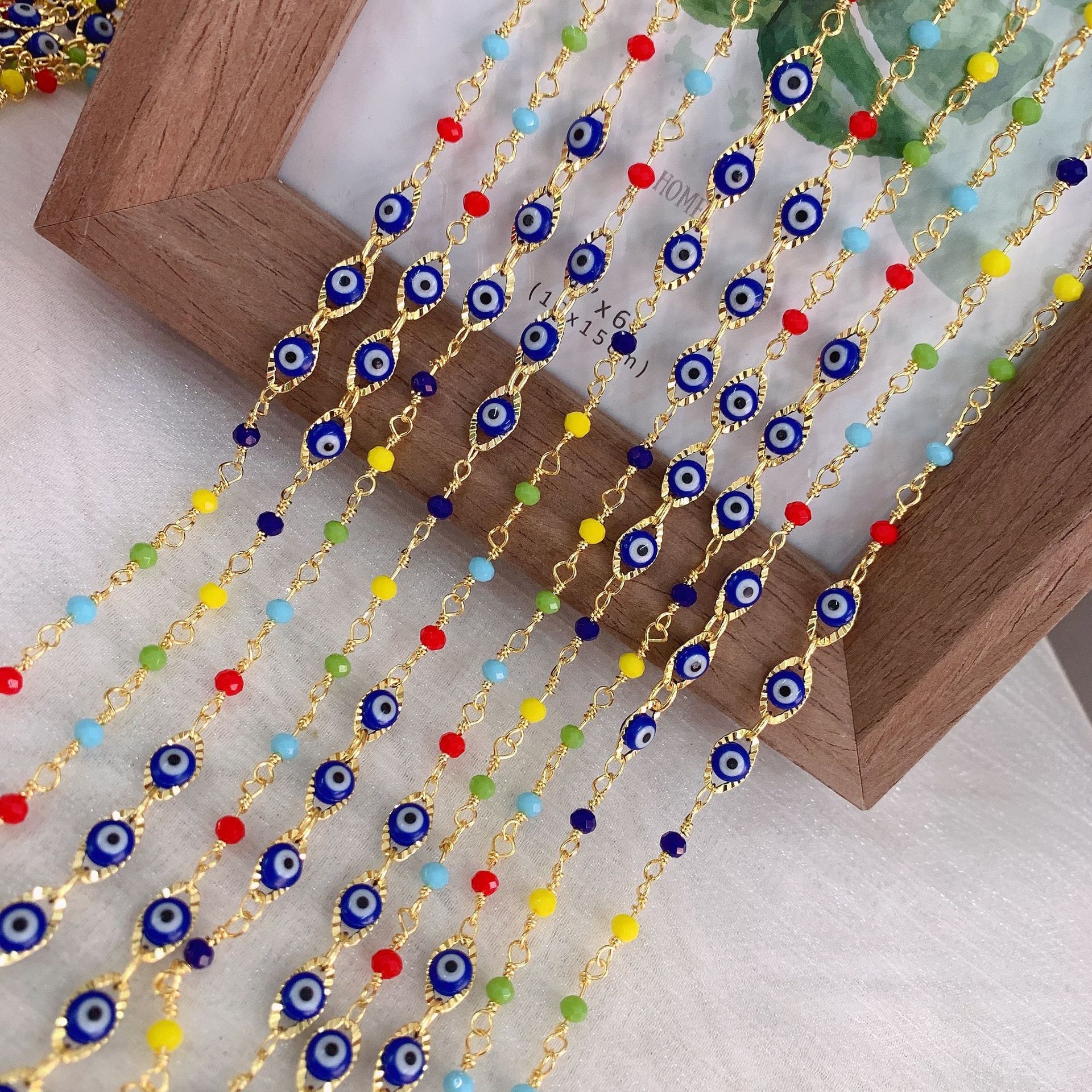 Chaînes de bijouterie de mauvais œil, laiton, avec Seedbead, Placage de couleur d'or, DIY & motif de mauvais œil & émail, couleurs mélangées, 10m/sac, Vendu par sac