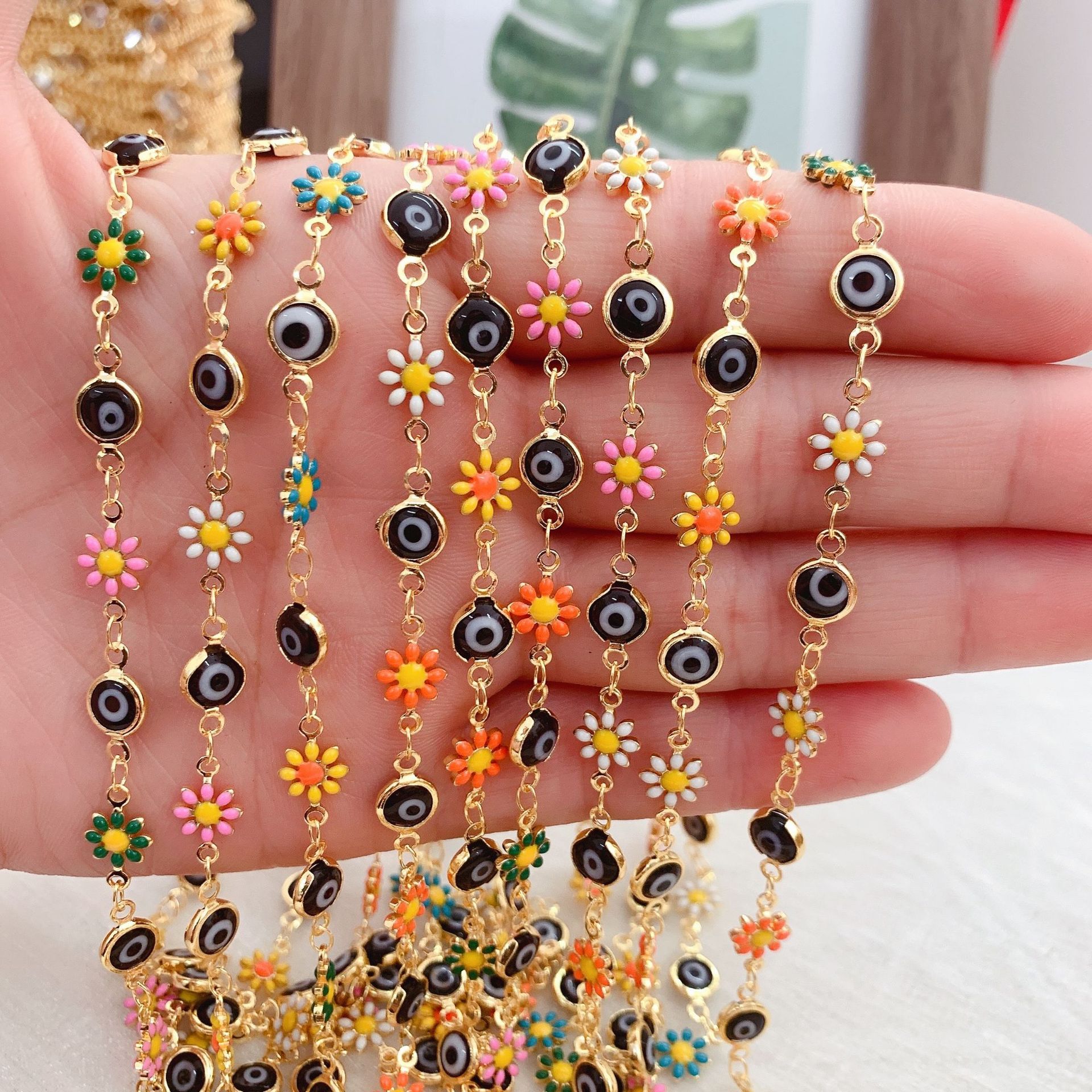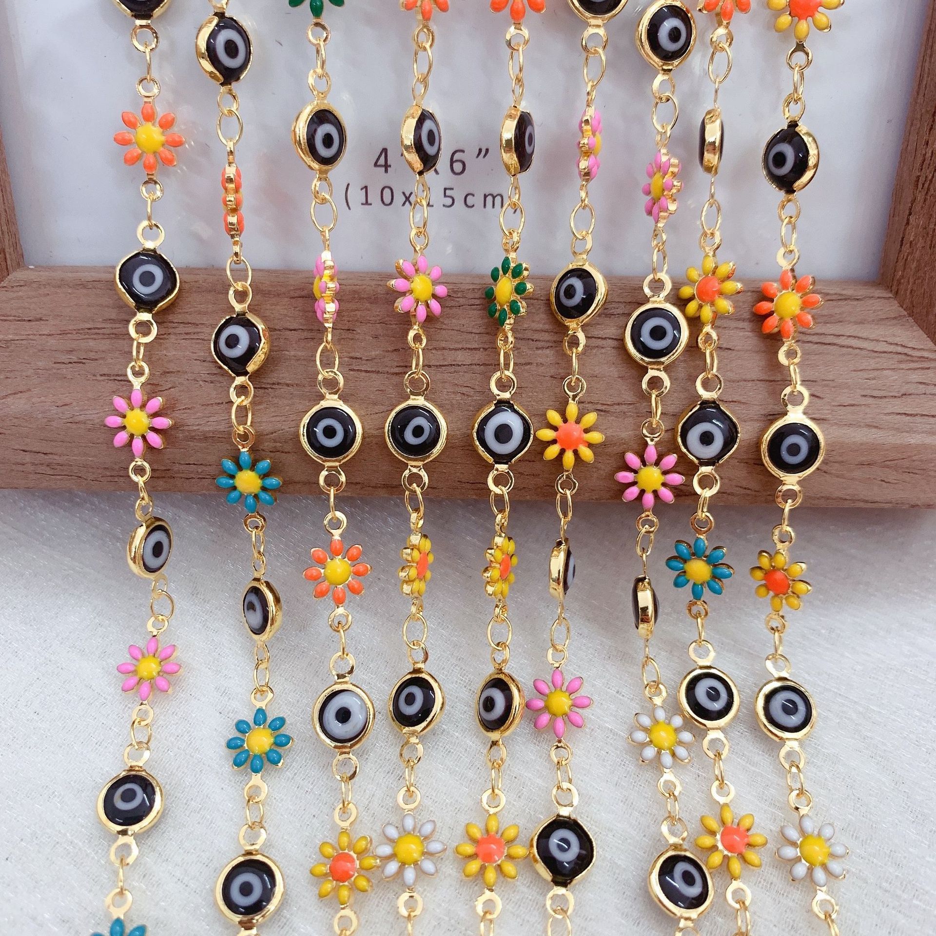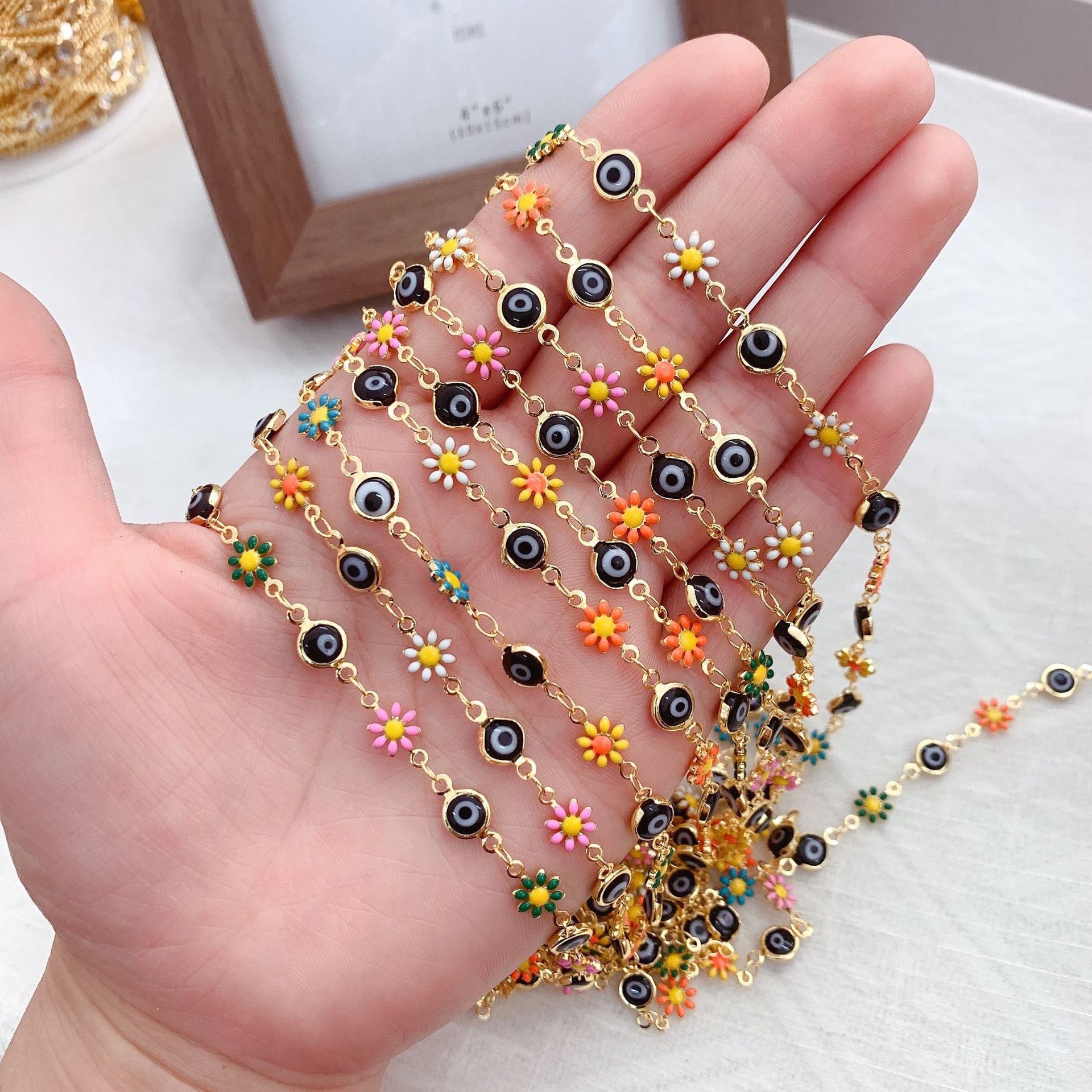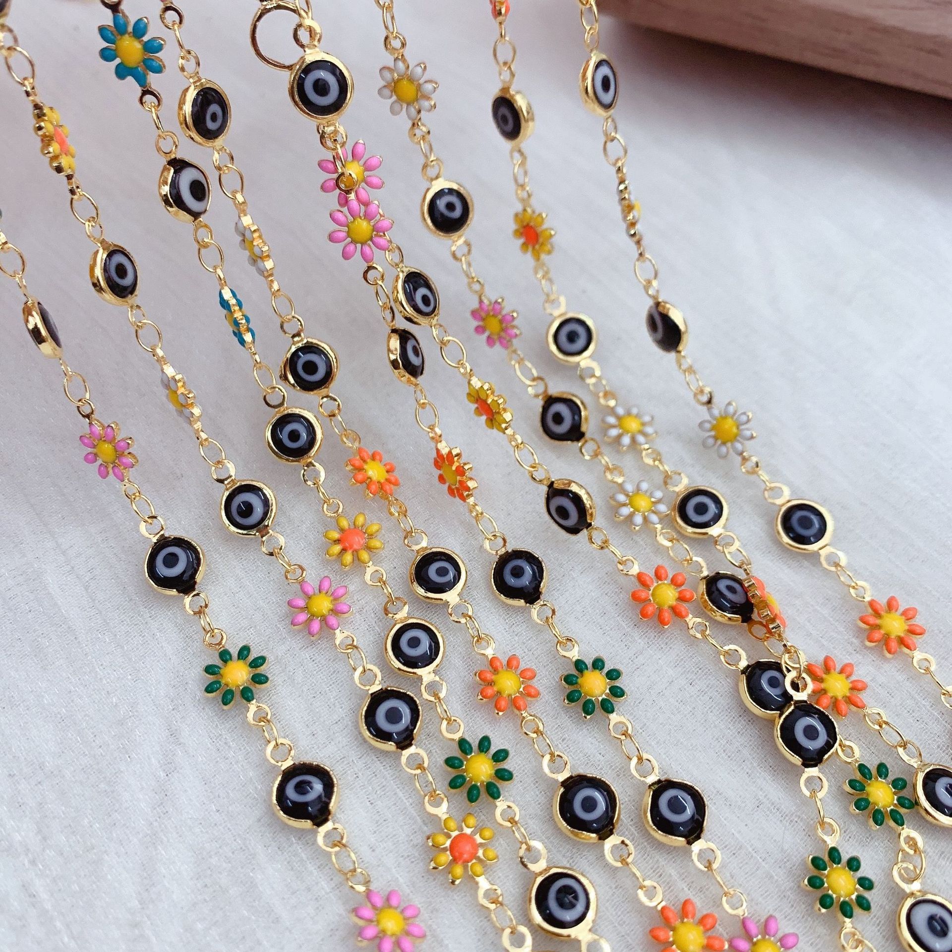 Chaînes de bijouterie de mauvais œil, laiton, fleur, motif de mauvais œil & émail, multicolore, protéger l'environnement, sans nickel, plomb et cadmium Vendu par m