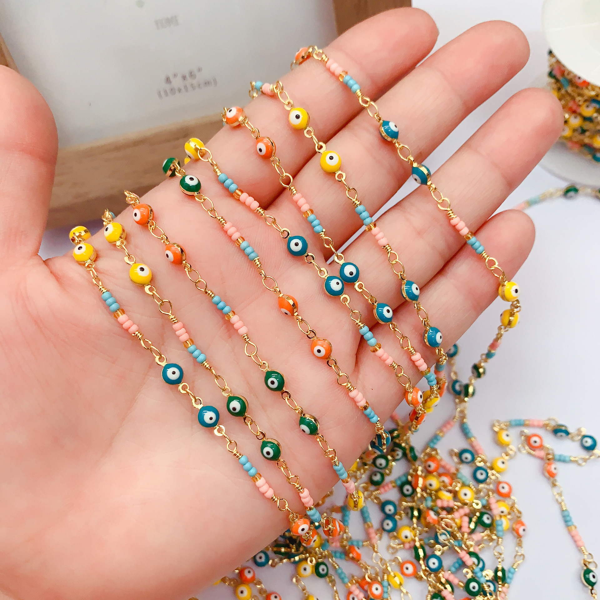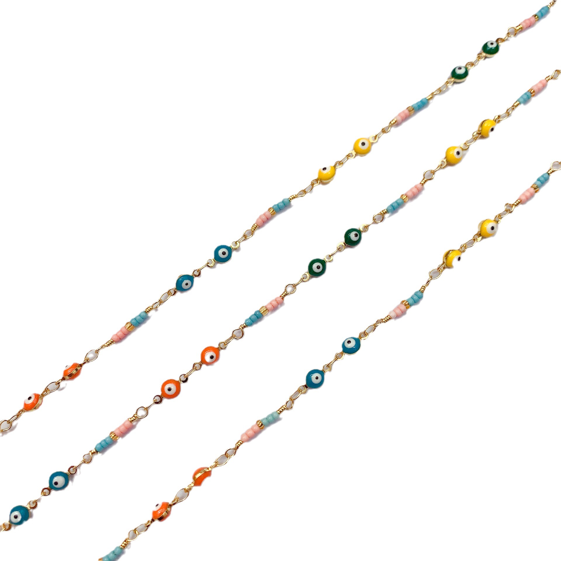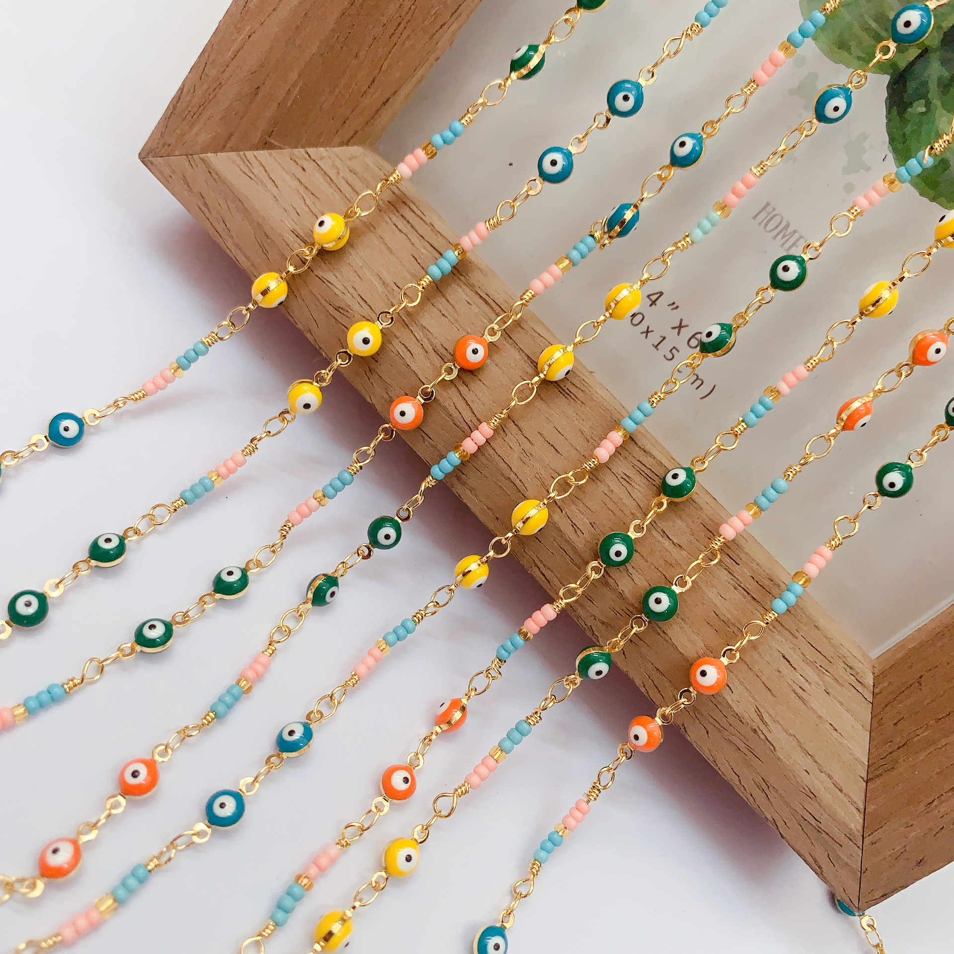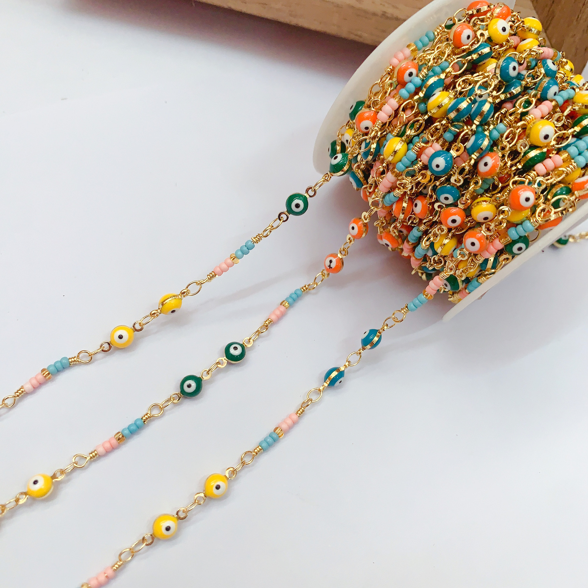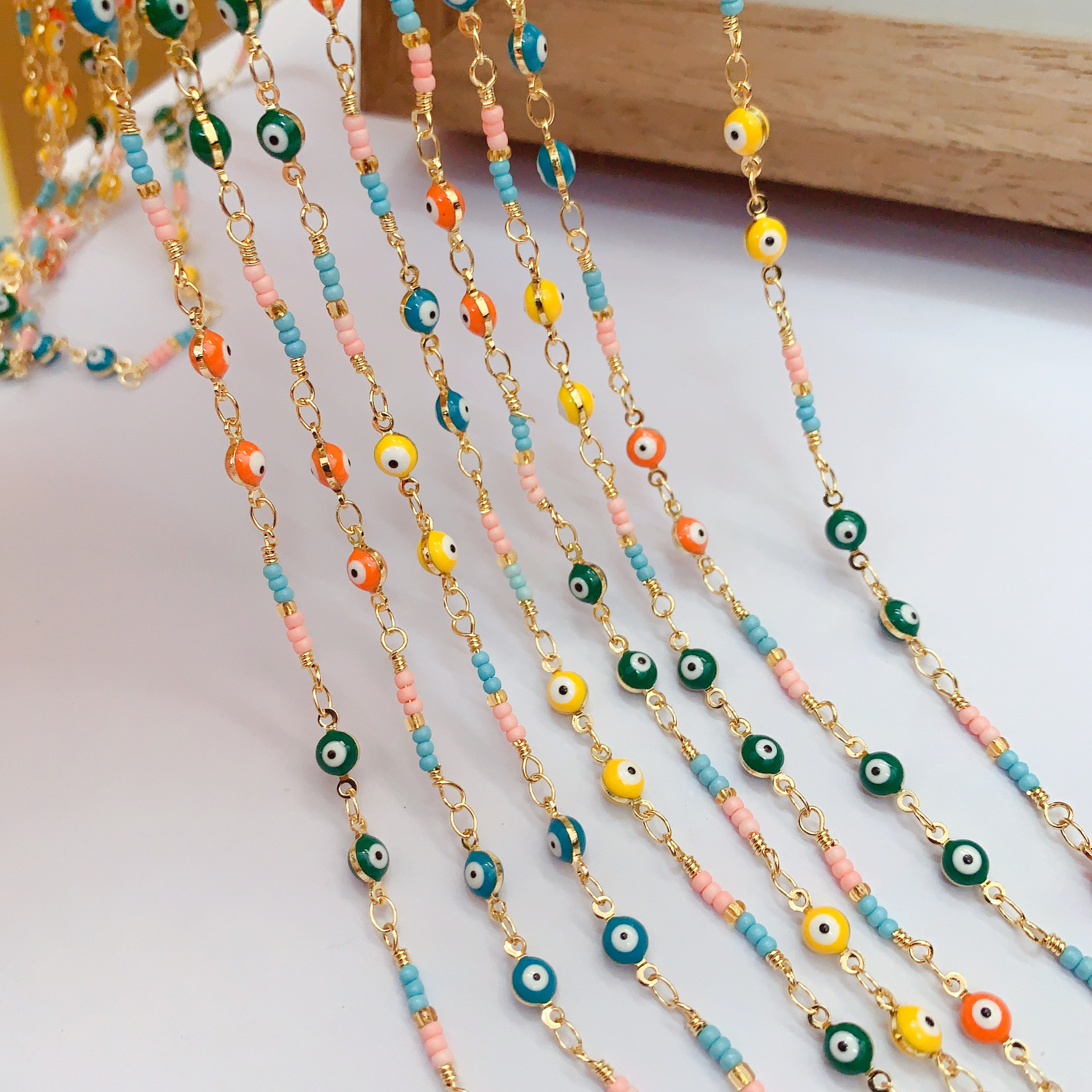 Chaînes de bijouterie de mauvais œil, laiton, avec Seedbead, Placage de couleur d'or, DIY & avec strass, couleurs mélangées, 10m/sac, Vendu par sac
