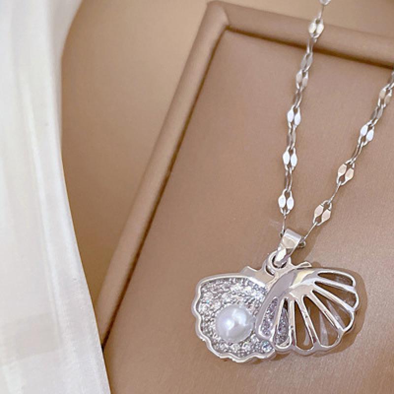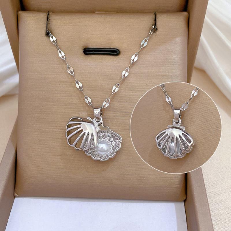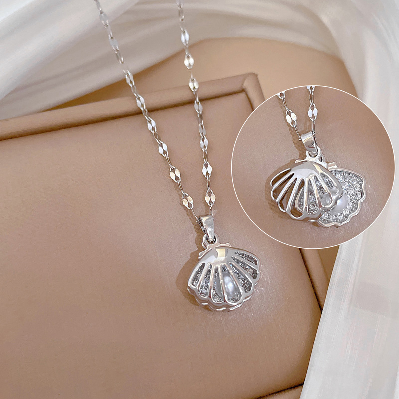 Collier de bijoux de titane, Acier titane, avec perle de plastique & laiton, coquille, pavé de micro zircon & pour femme & creux, argent, Vendu par PC