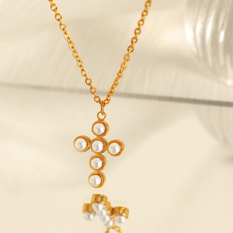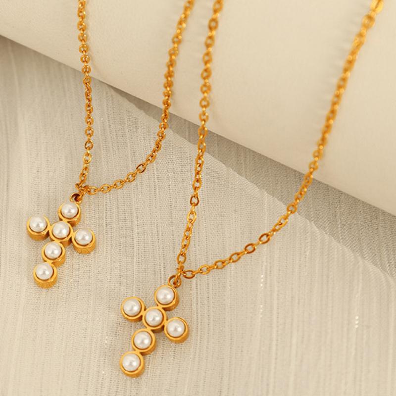 Collier de bijoux en acier inoxydable, Acier inoxydable 304, avec perle de plastique, avec 5cm chaînes de rallonge, croix, Placage de couleur d'or, bijoux de mode & pour femme, Longueur:40 cm, Vendu par PC