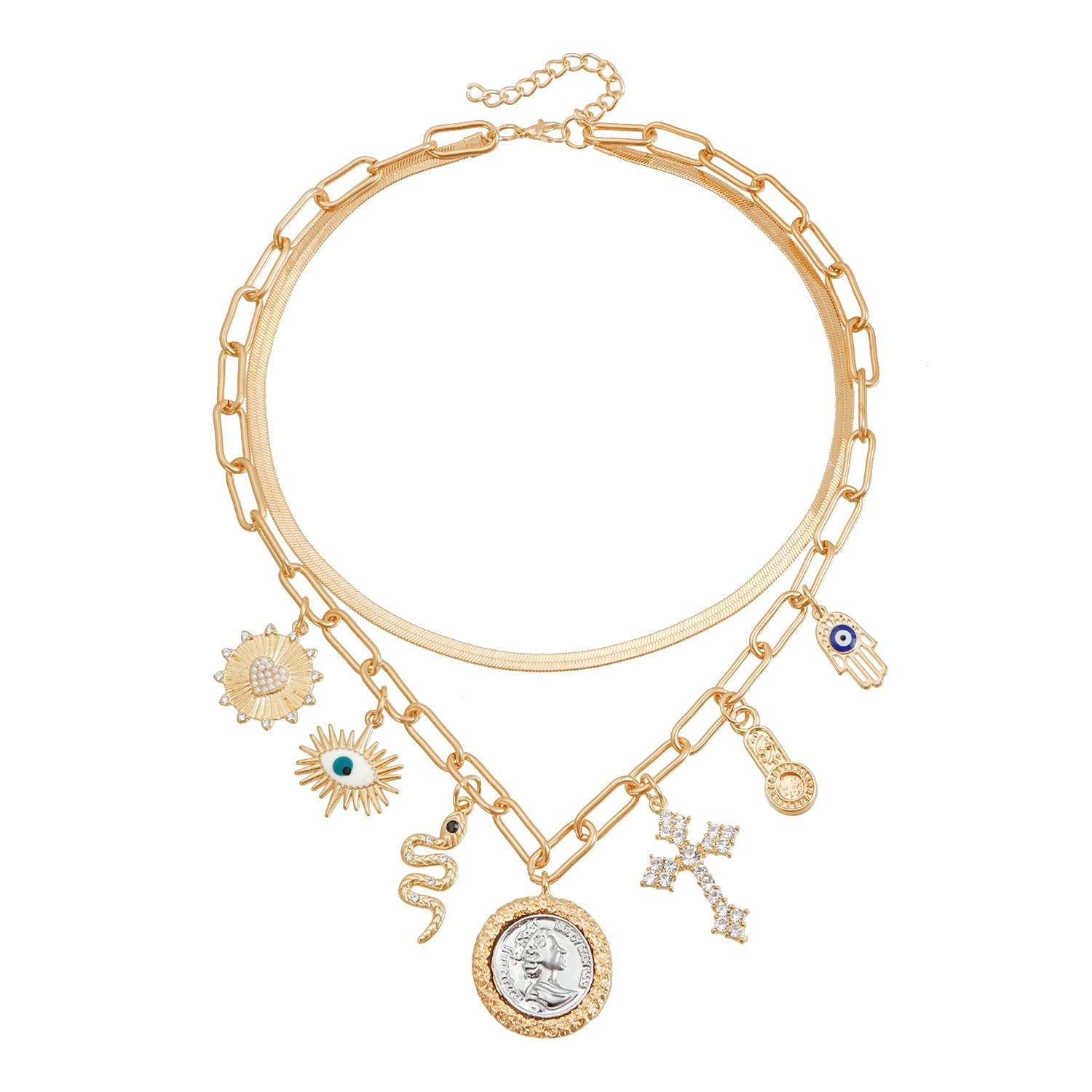 Collier de mode Multi couche, alliage de zinc, avec chaîne de fer, Plat rond, Plaqué d'or 18K, chaîne ovale & 2 fils, sans plomb et cadmium, 50cm Environ 19.5 pouce, Vendu par brin