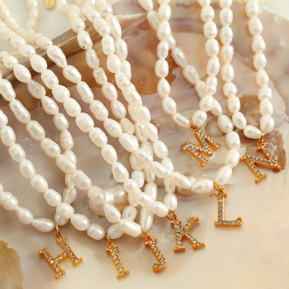 Collier de perles d'eau douce naturelles, alliage de zinc, avec chaîne de fer & perle, Placage de couleur platine, styles différents pour le choix & avec le motif de lettre & pour femme & creux, sans plomb et cadmium - Environ 17.5 pouce, Vendu par brin