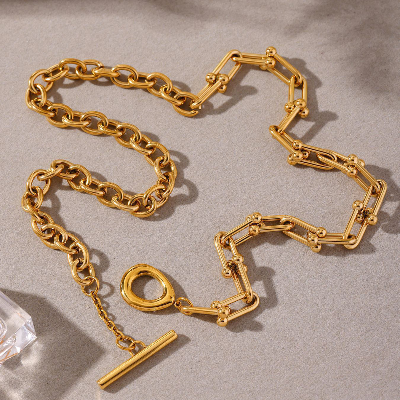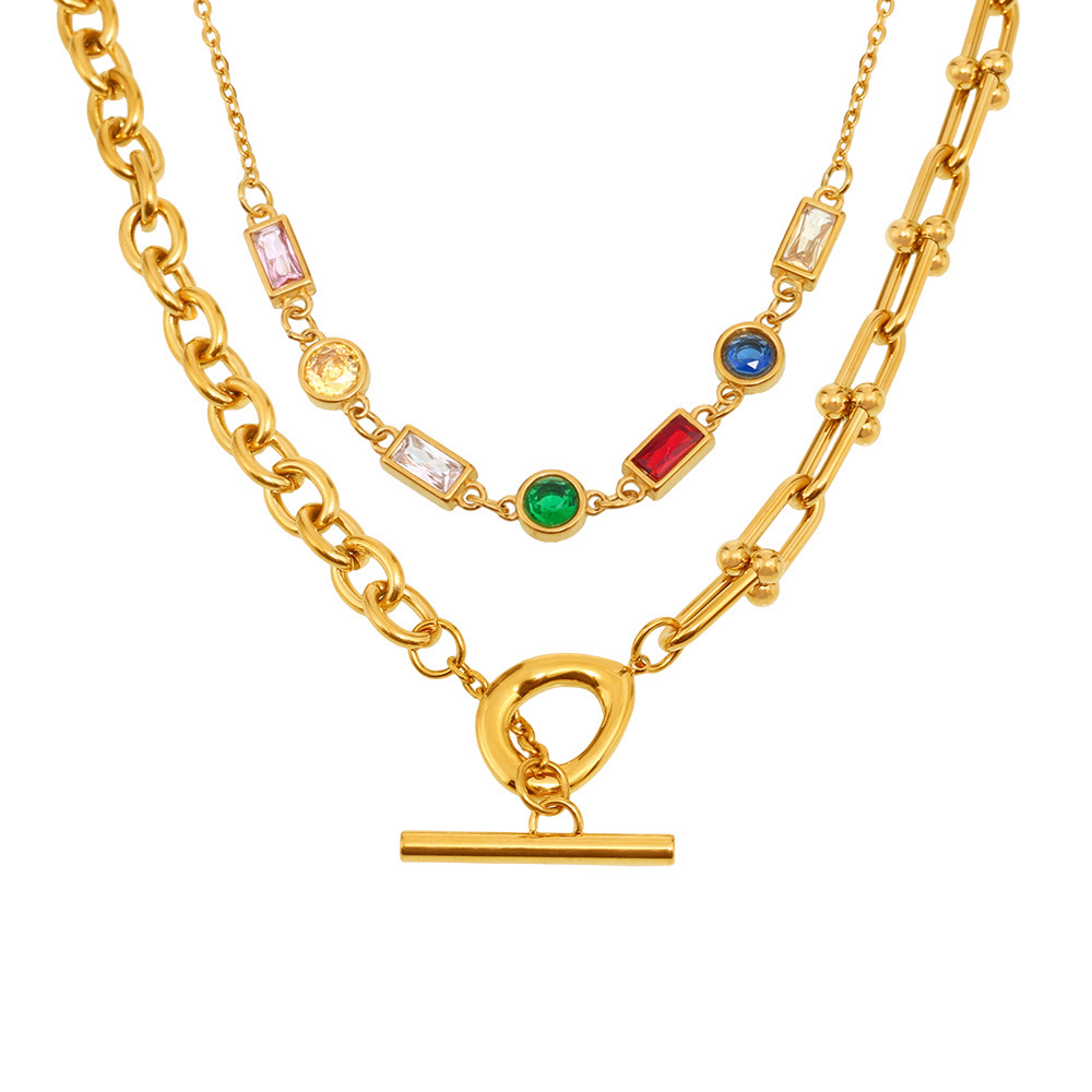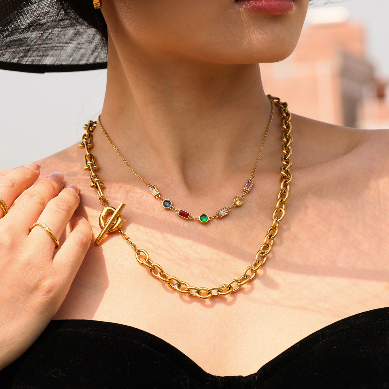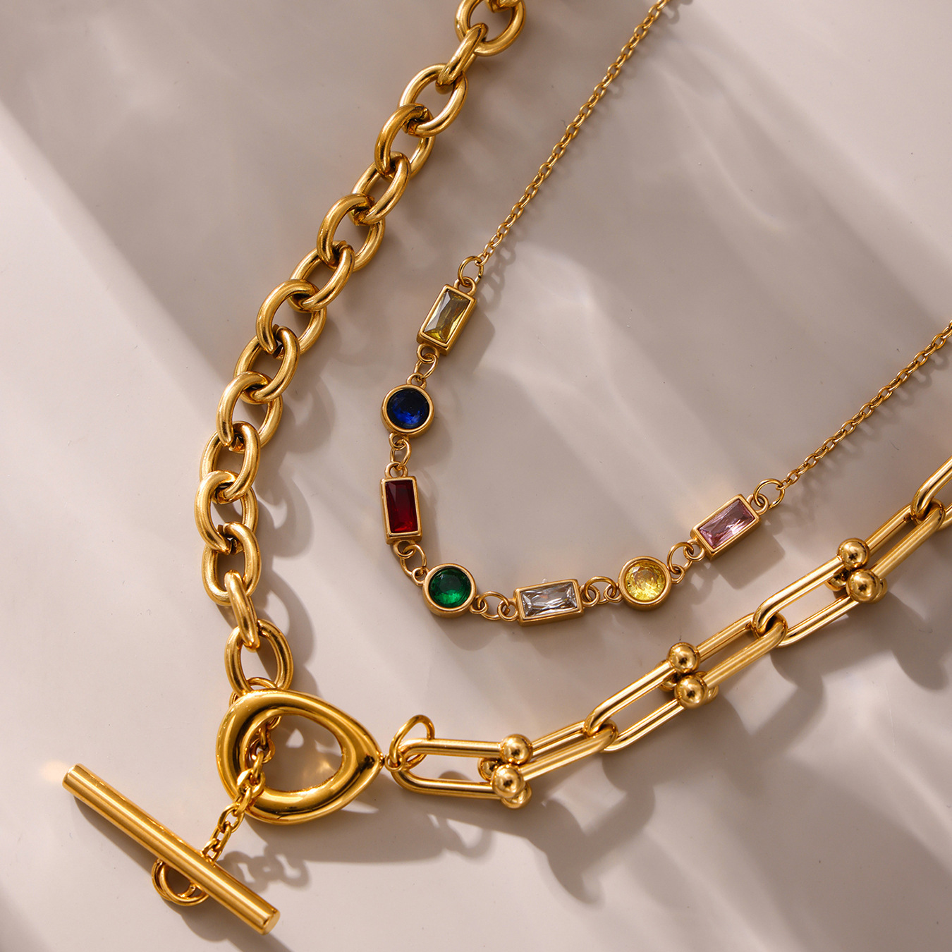Collier en acier inoxydable Zircon, Acier inoxydable 304, avec zircon cubique, Rond, Placage de couleur d'or, chaîne ovale & creux  Environ 18 pouce, Vendu par brin