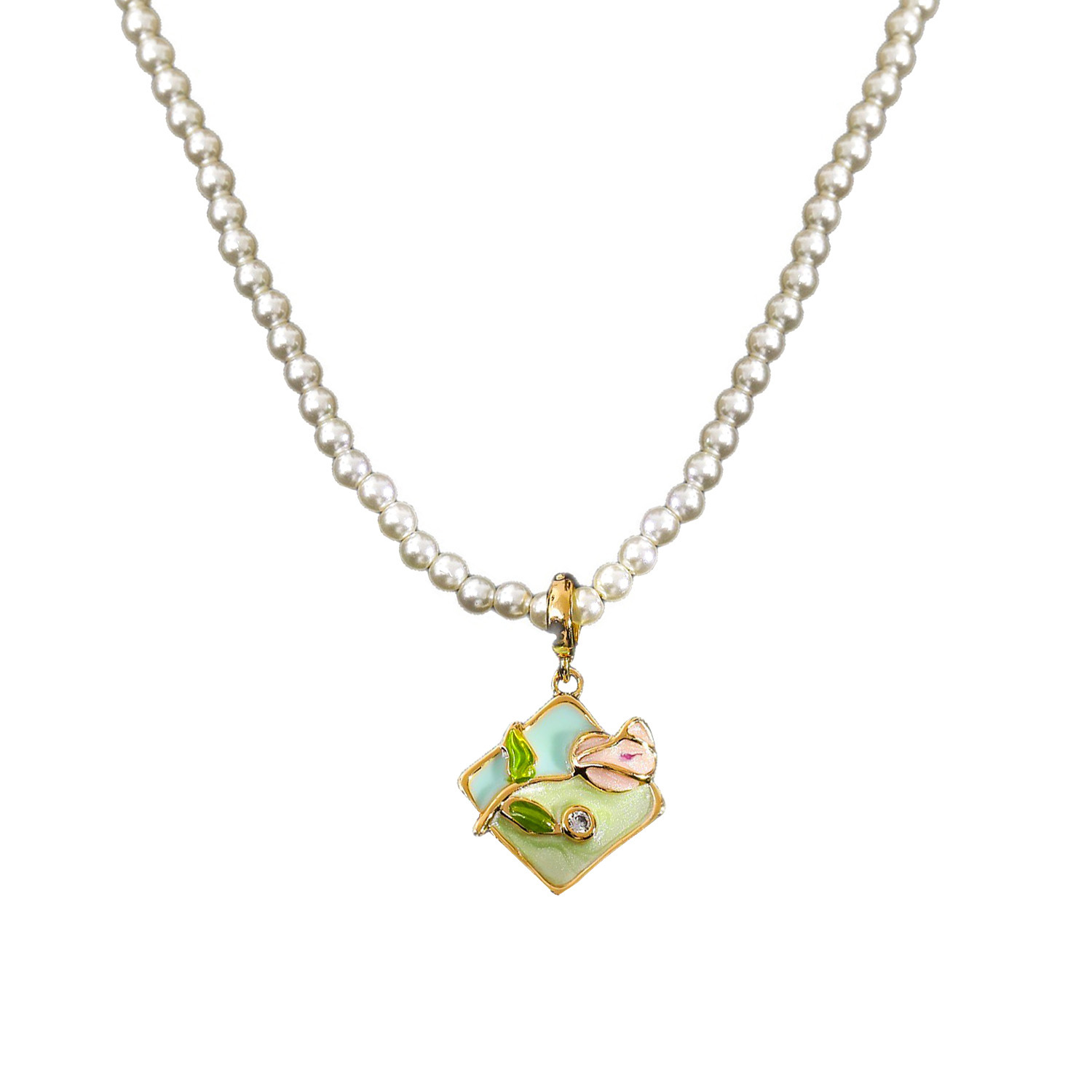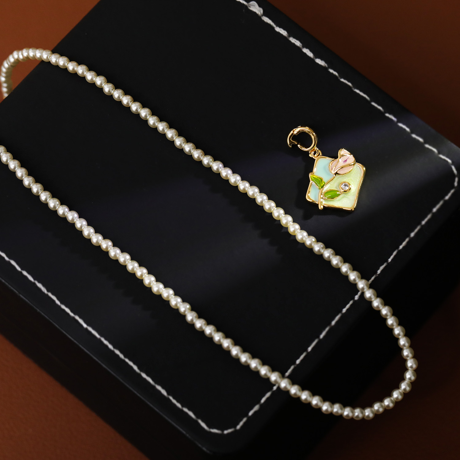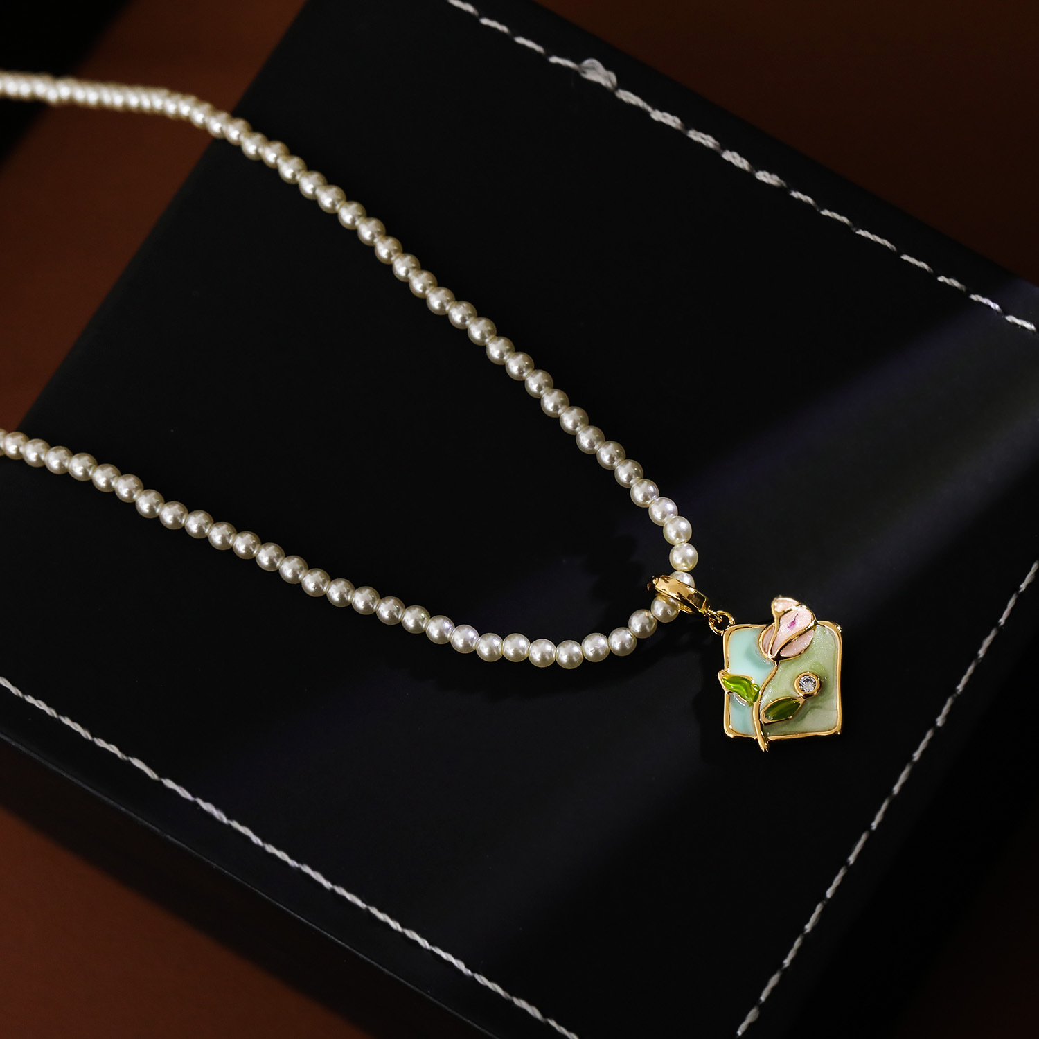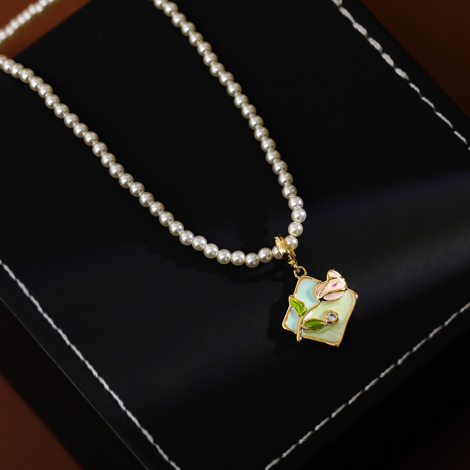 Collier en perles de verre Pull, laiton, avec Des billes de verre, avec 6cm chaînes de rallonge, Tulip, Plaqué or 18K, pavé de micro zircon & pour femme & émail, The pendant is 2.7cm long and 1.7cm wide, Longueur:39 cm, Vendu par PC
