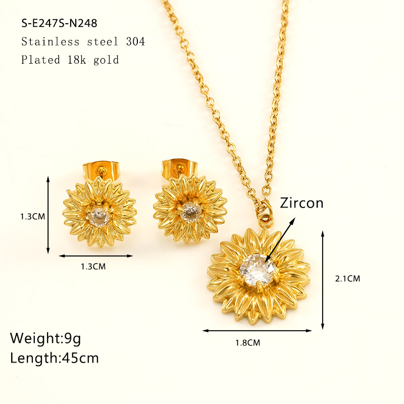 Cubic Zirconia Micro Pave Ensembles de bijoux en acier inoxydable, Acier inoxydable 304, Boucle d’oreille stud & collier, Tournesol, Plaqué or 18K, 2 pièces & pavé de micro zircon & pour femme, Vendu par PC