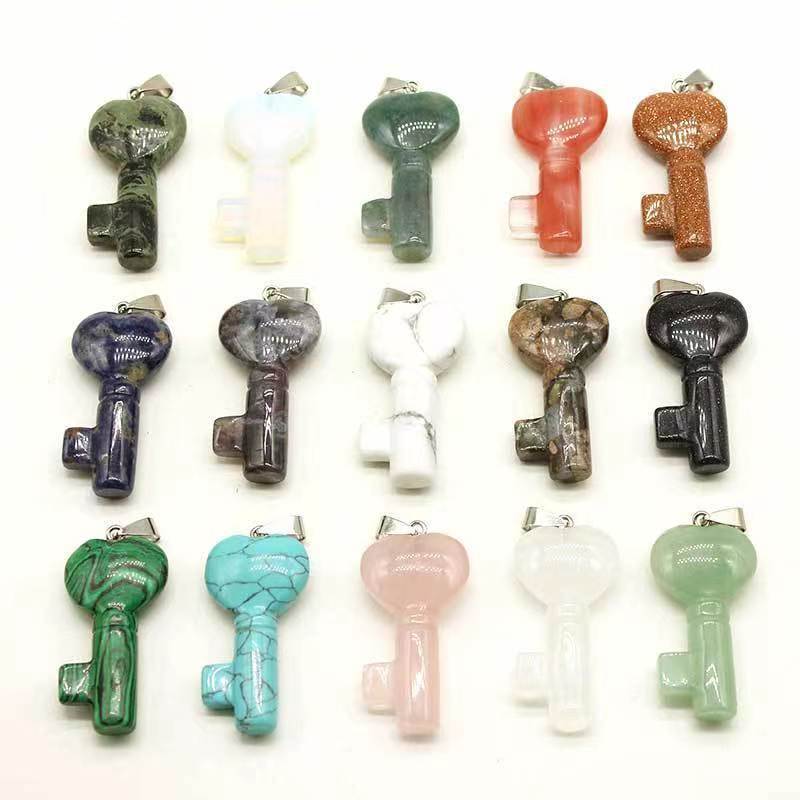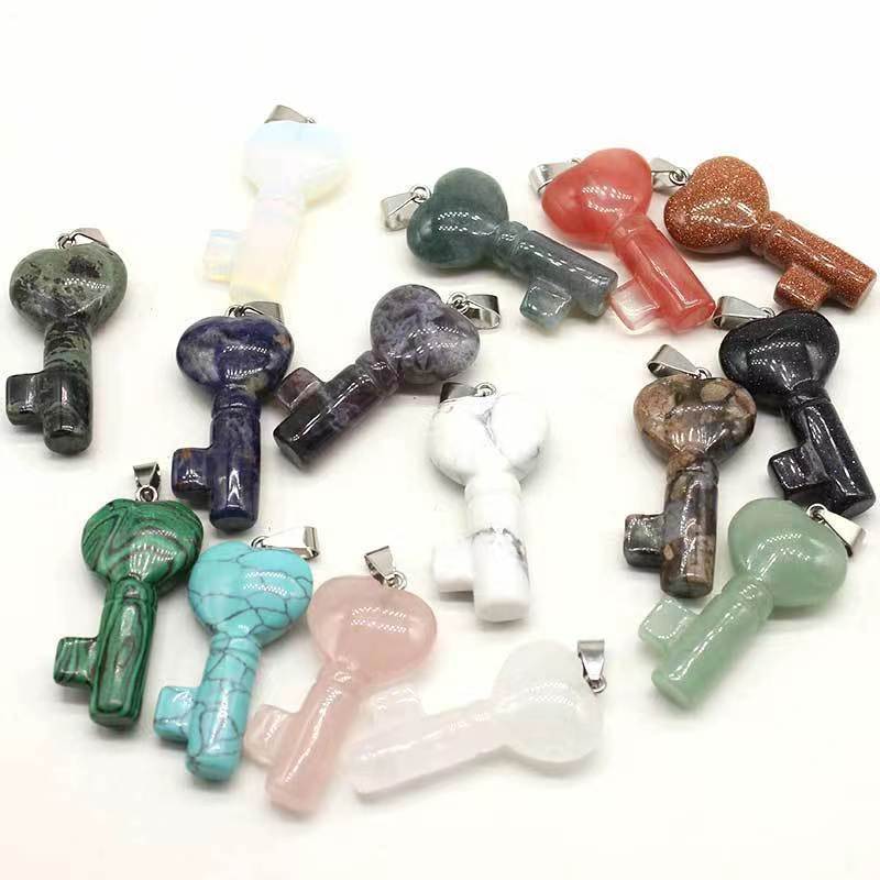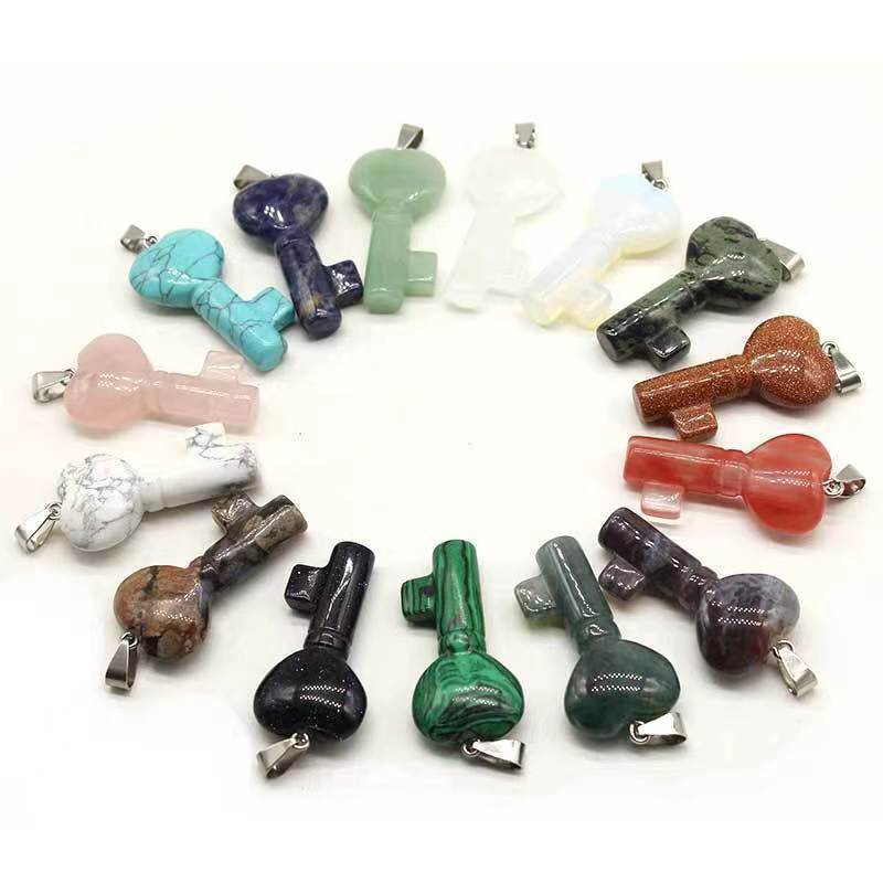 Pendentif bijoux de pierre gemme, avec fer & Acier inoxydable 304, clé, DIY, Couleur aléatoire, 20x40x10mm, Vendu par PC