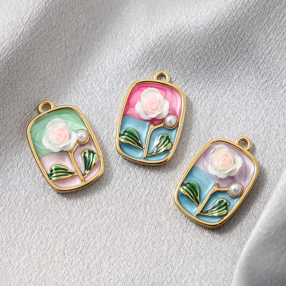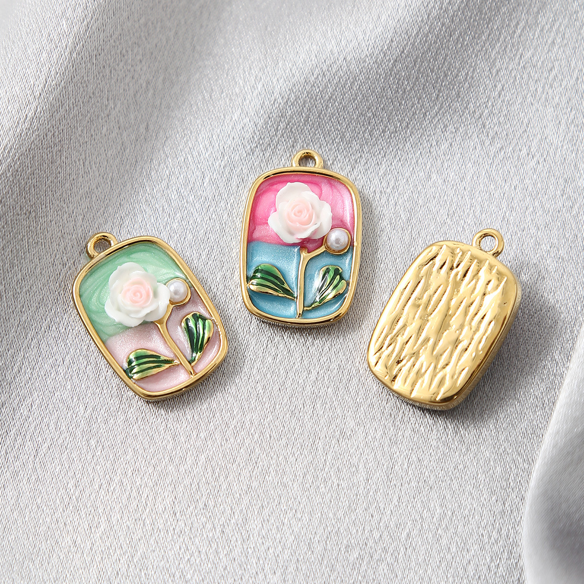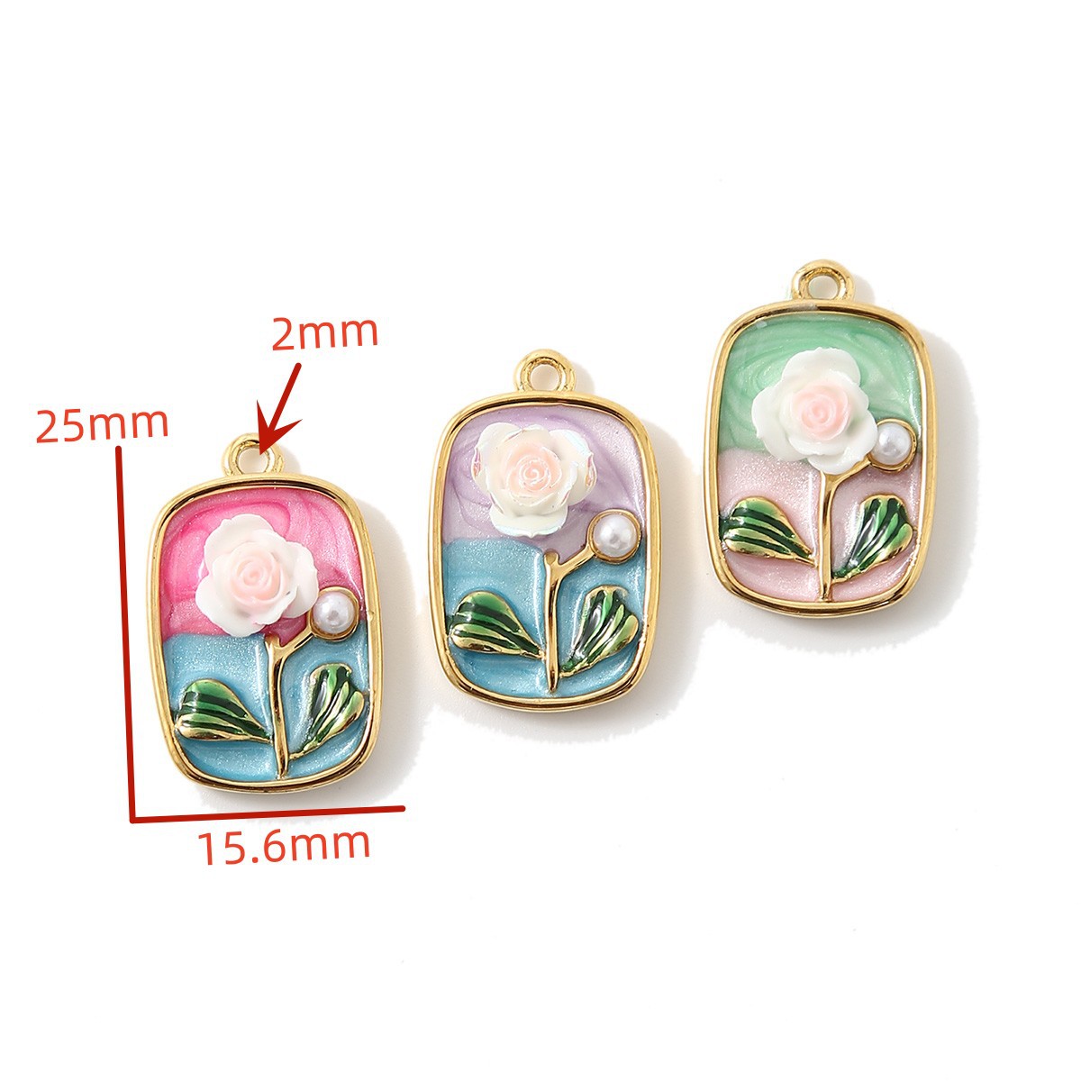 Pendentifs en acier inoxydable émail, Acier inoxydable 304, avec perle de plastique, rectangle, Placage de couleur d'or, DIY, plus de couleurs à choisir, Vendu par PC
