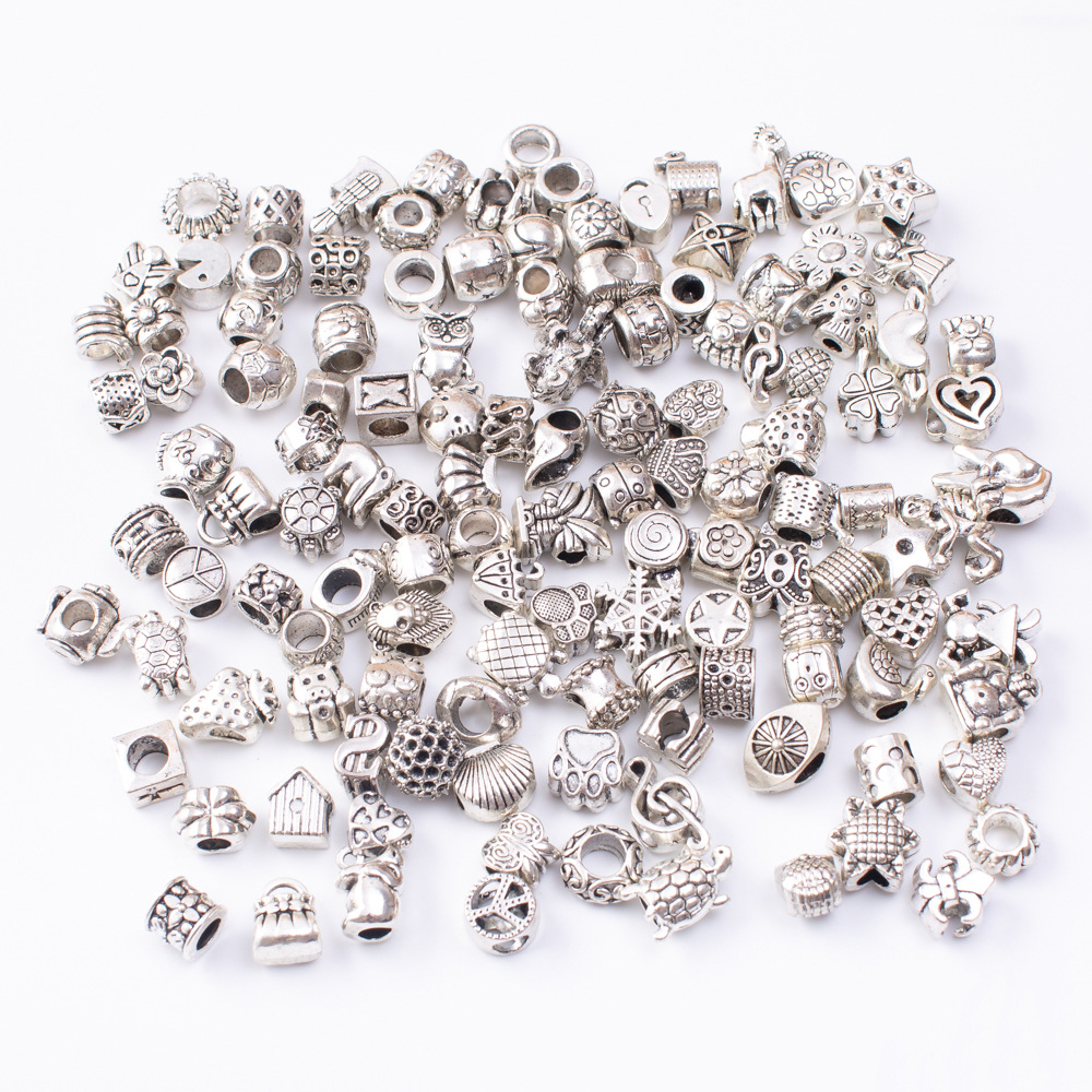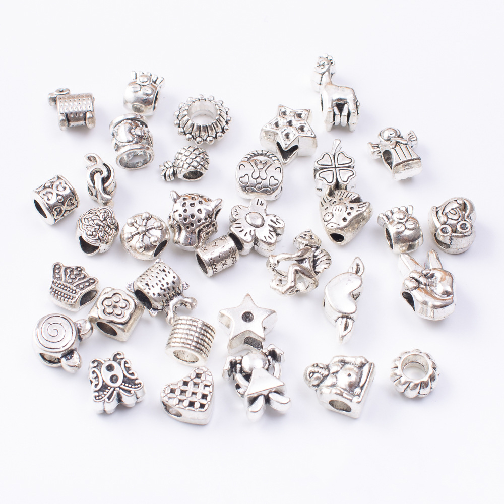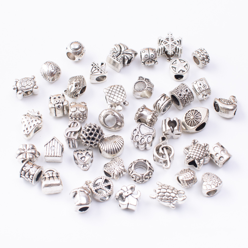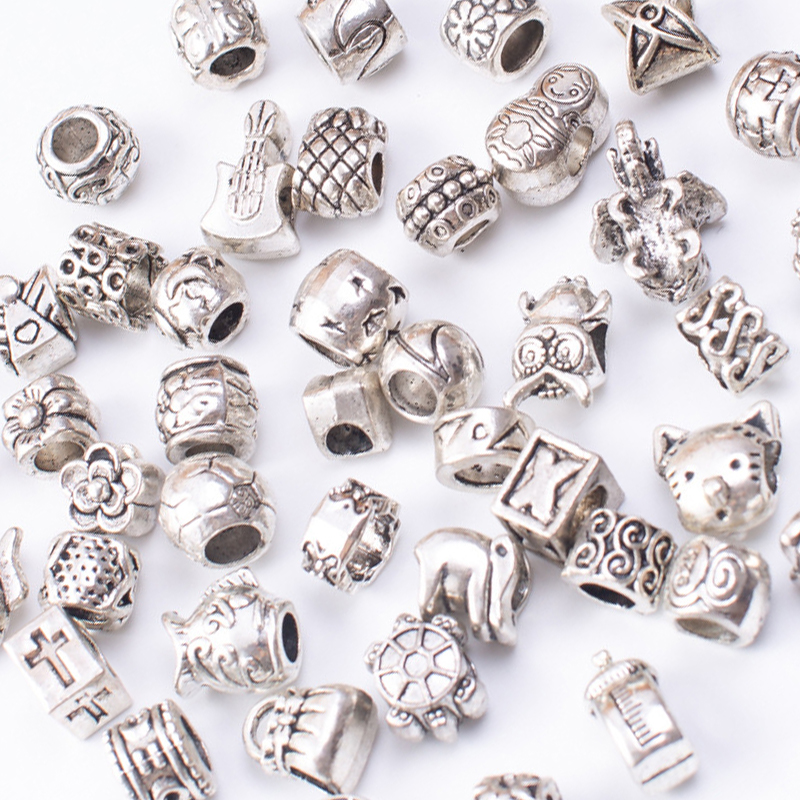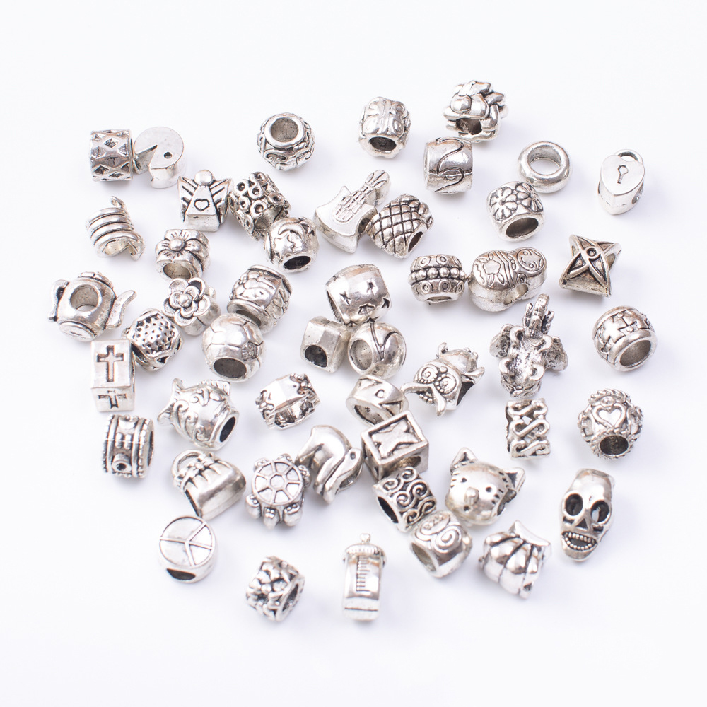 Perles de gros trou en alliage de zinc, Plaqué de couleur d'argent, quantité différente pour le choix & modèle mixte & DIY, beads length 10-30mm, Vendu par sac