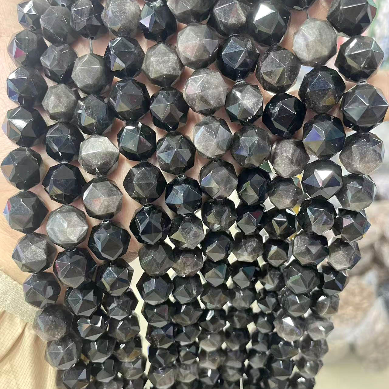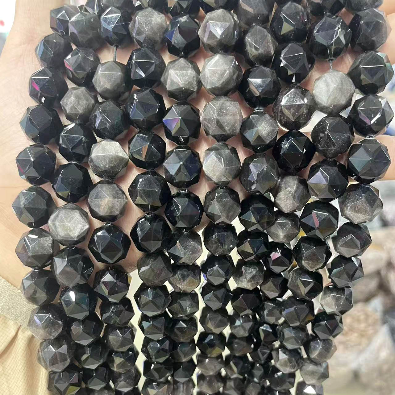 Perles de pierre gemme unique, Argent-Obsidienne, DIY, couleurs mélangées, 12mm, Longueur:38 cm, Vendu par brin