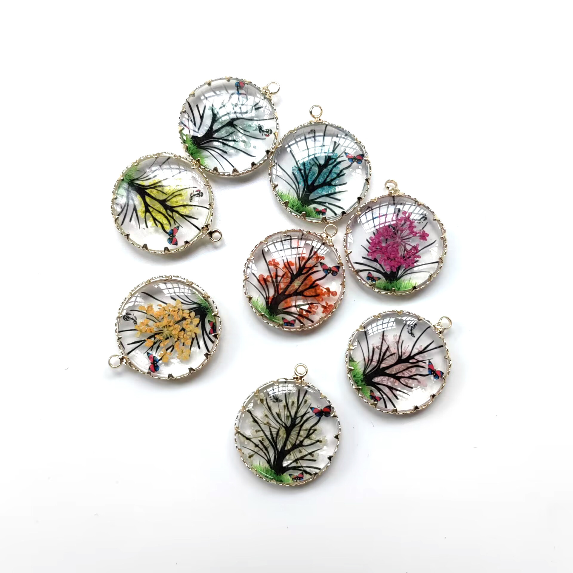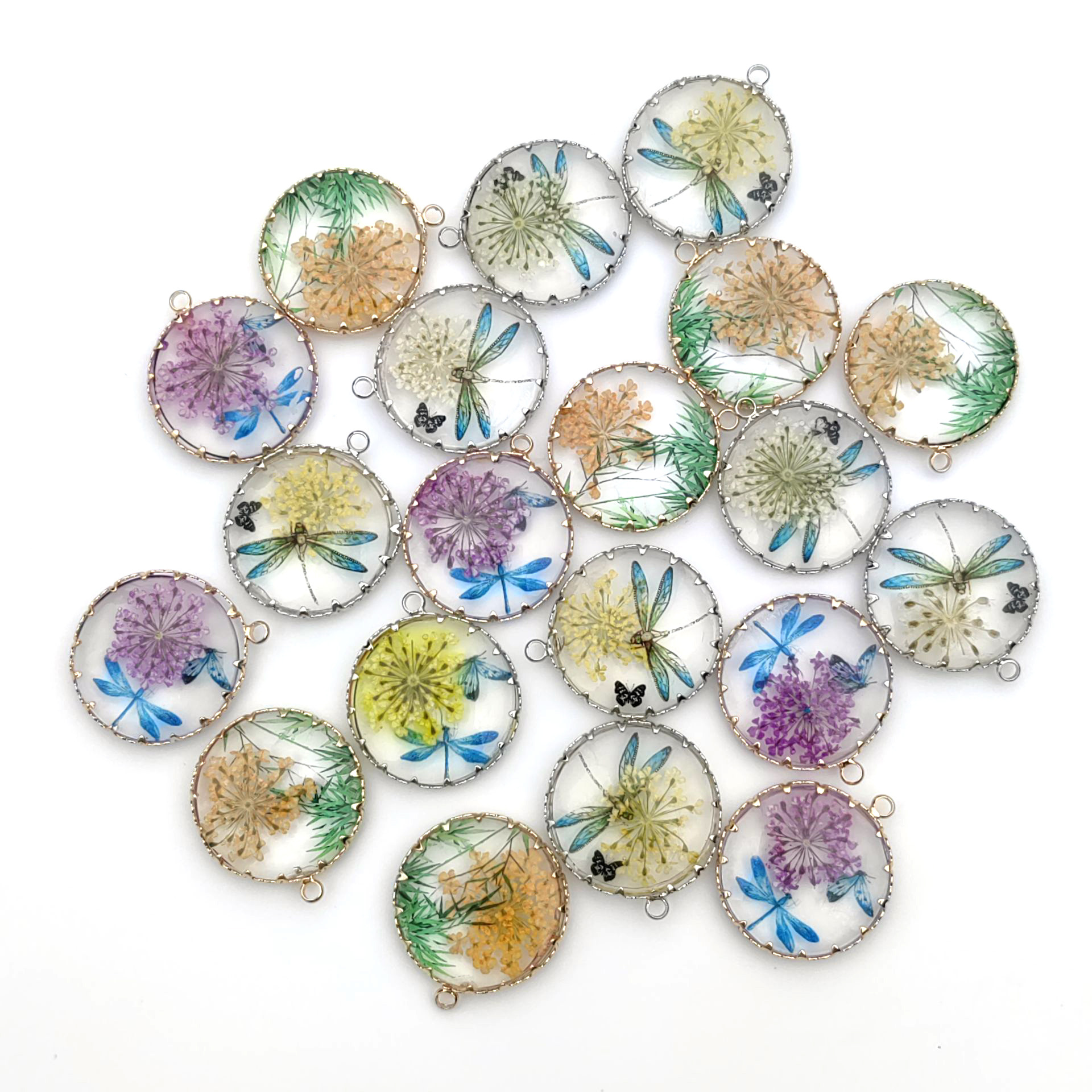 Résine Zinc Alloy pendentifs, avec Fleurs séchées & alliage de zinc, Rond, goutté d'époxy, envoyé au hasard & DIY, couleurs mélangées, 25x25mm, Vendu par PC