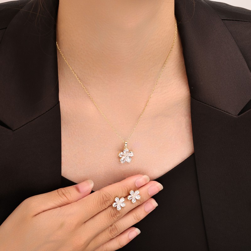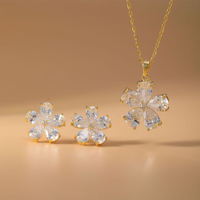 Zircon cubique Micro Pave parures de bijoux en laiton, Boucle d’oreille stud & collier, fleur, Placage, 2 pièces & pavé de micro zircon & pour femme, Or, Vendu par fixé