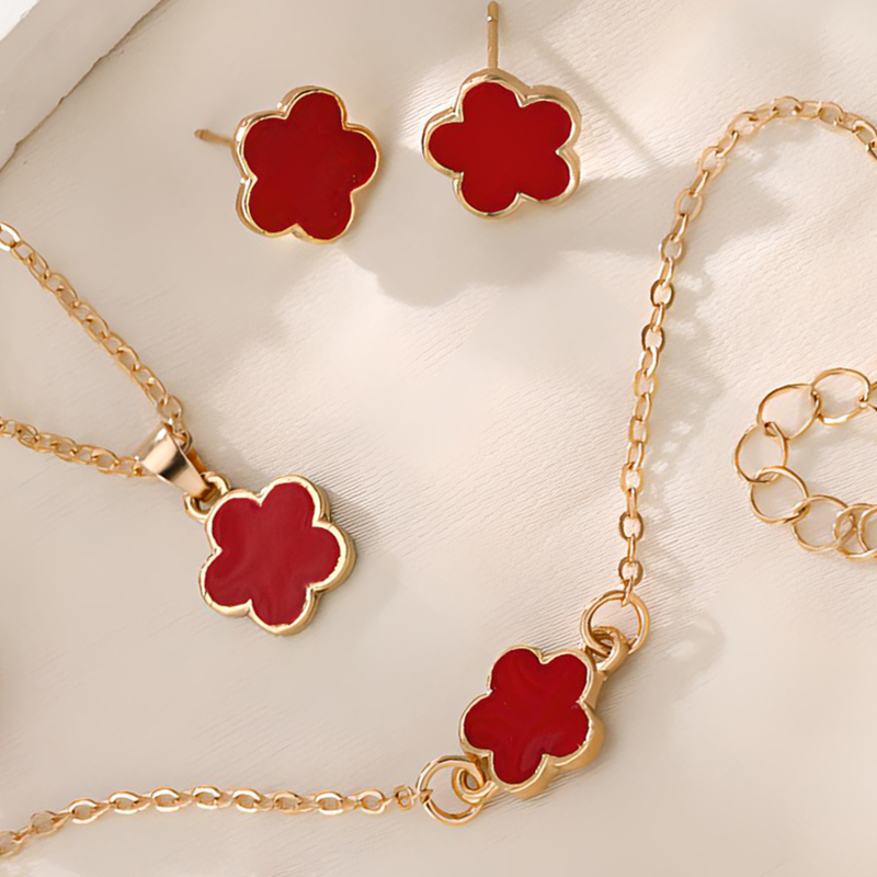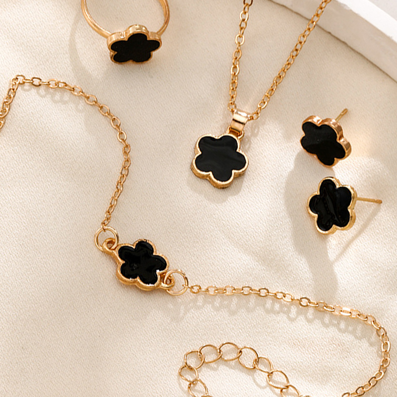 alliage de zinc parure de bijoux, Boucle d’oreille stud & bague, anneau & Bracelet & collier, fleur, Placage de couleur d'or, 4 pièces & pour femme & émail, plus de couleurs à choisir, necklace length 18-20inch, bracelet length 6-8inch, Vendu par fixé