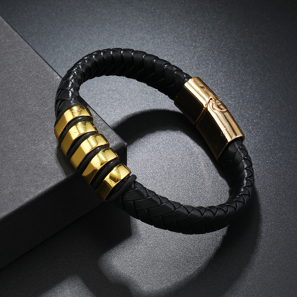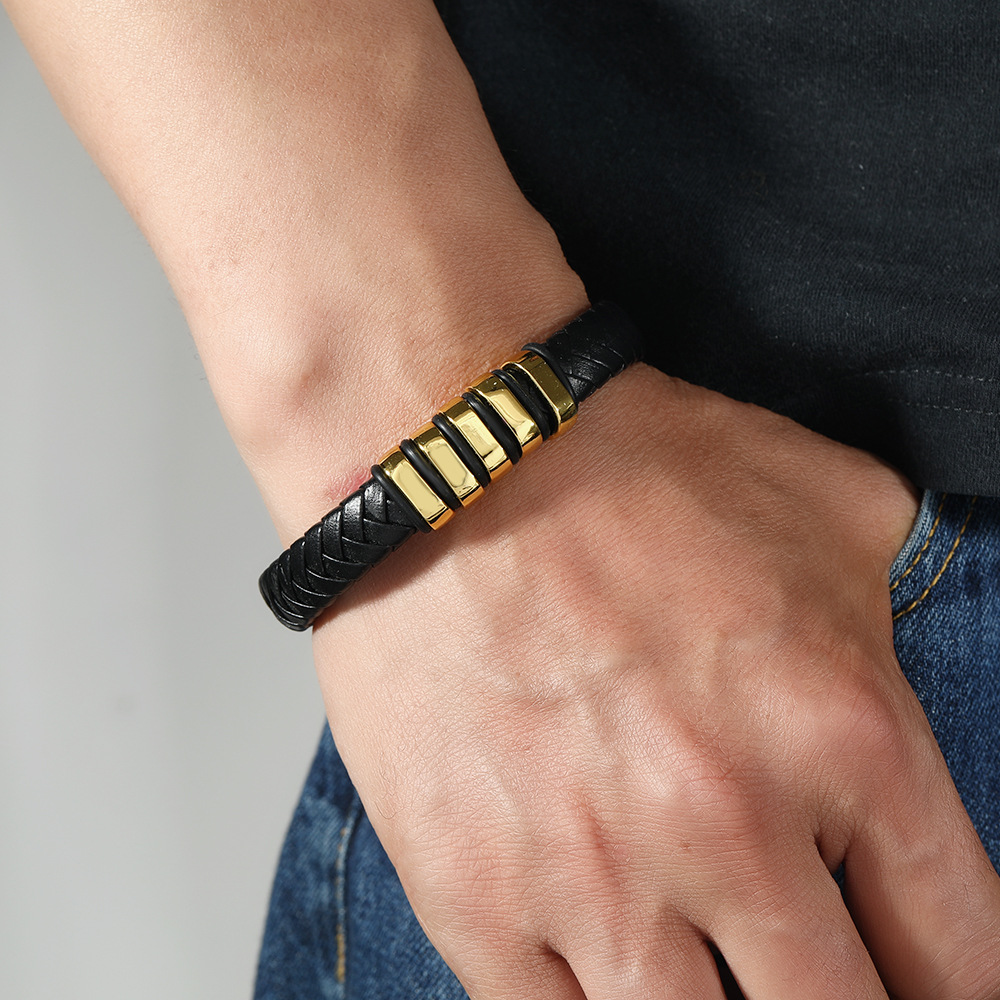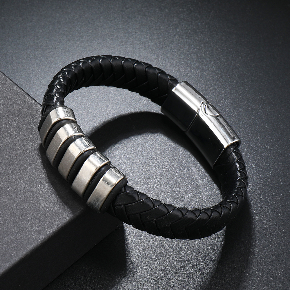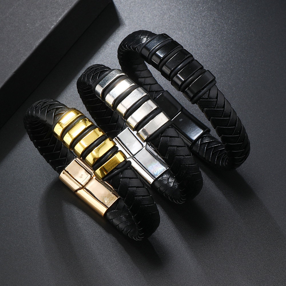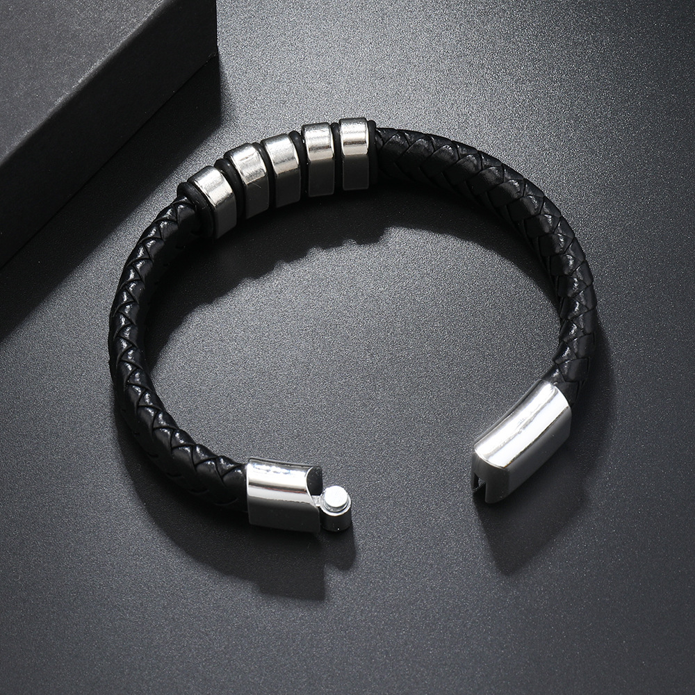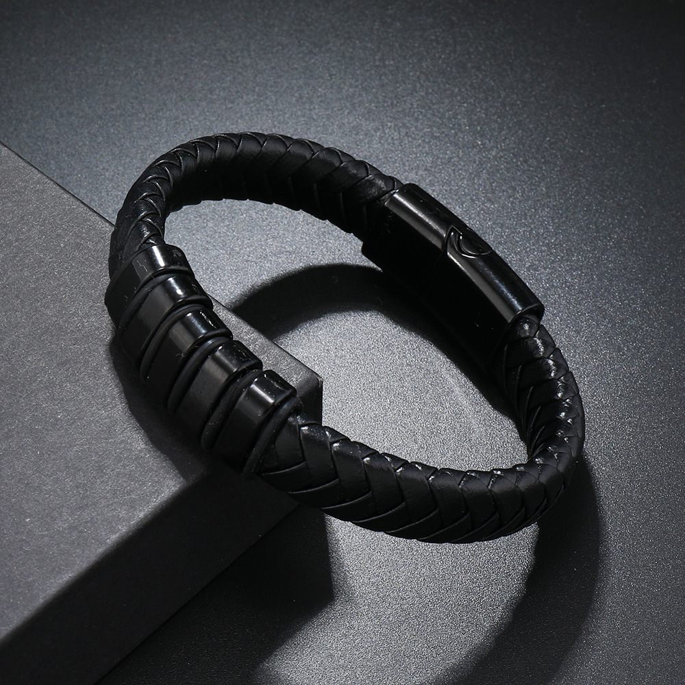 bracelet de cordon en PU , alliage de zinc, avec cuir PU & Acier inoxydable 304, fait à la main, pour homme, noire, Vendu par PC