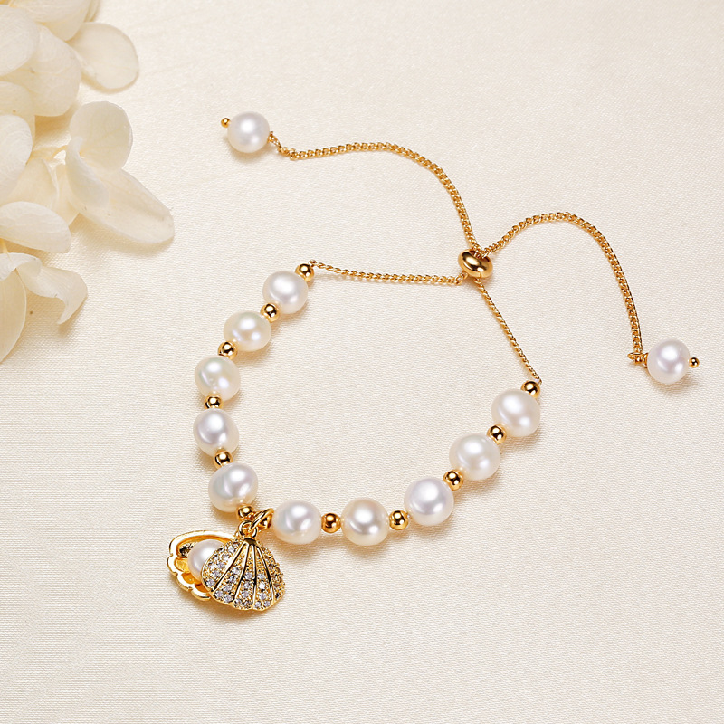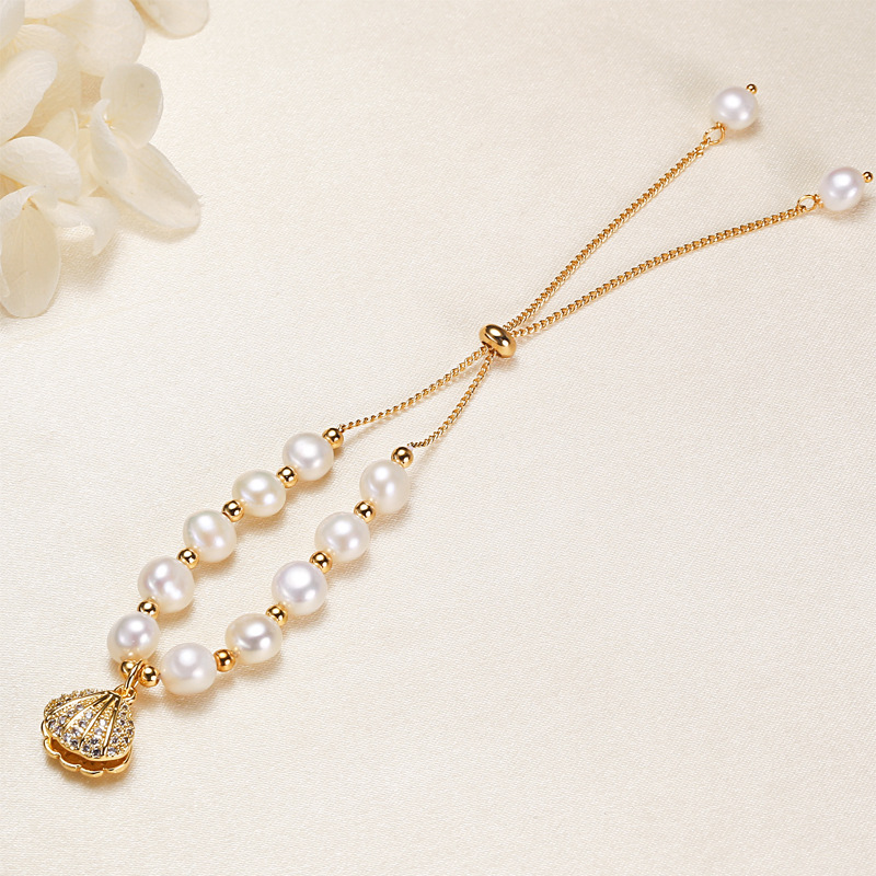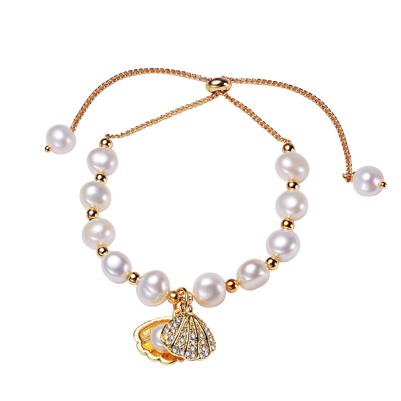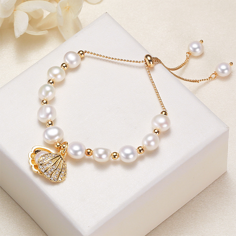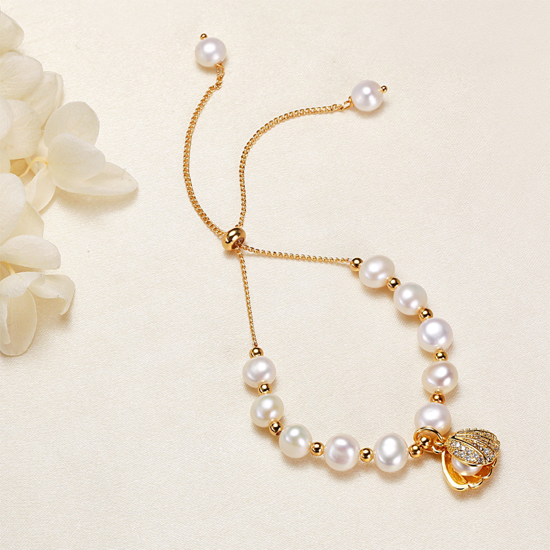 bracelet en laiton de perle d'eau douce cultivée, avec laiton, coeur, Placage, naturel & bracelet à breloques & avec strass, 6-7mm Environ 7 pouce, Vendu par brin