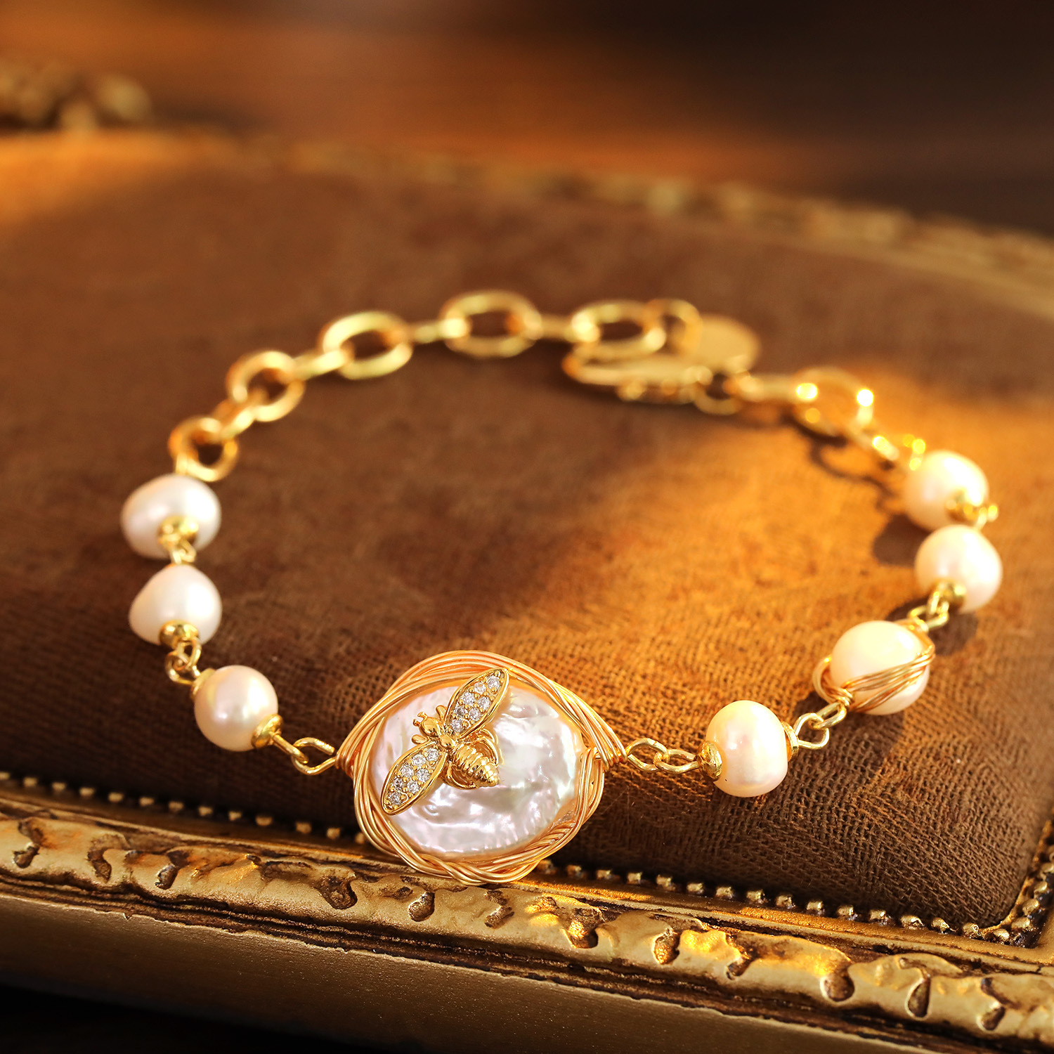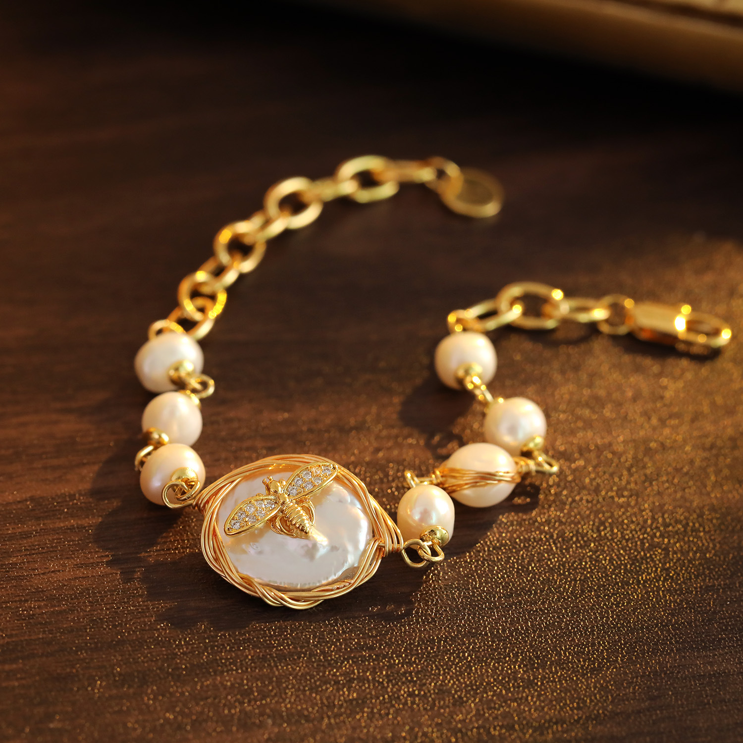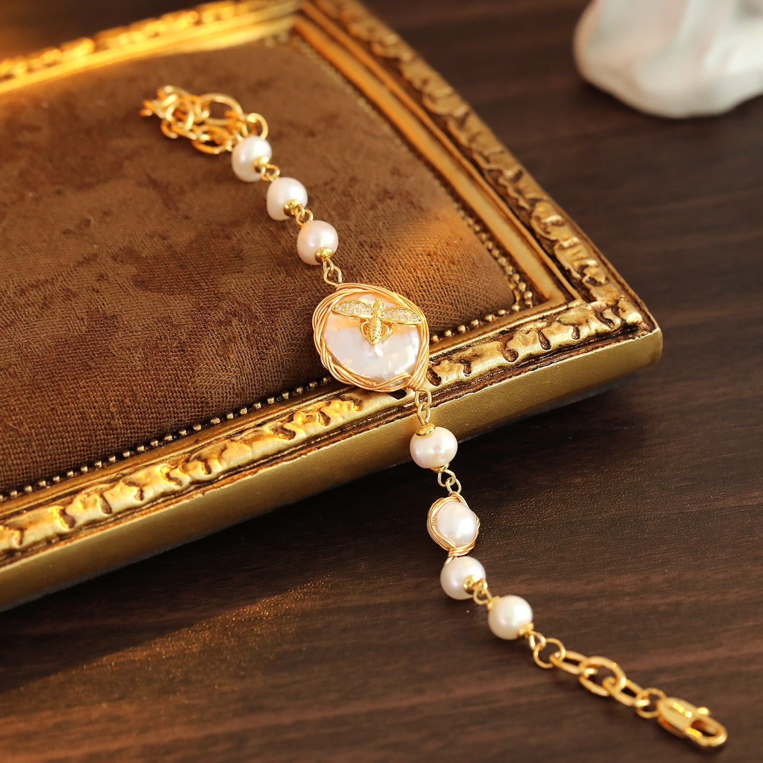 bracelet en laiton de perle d'eau douce cultivée, avec perle d'eau douce cultivée, avec 5cm chaînes de rallonge, abeille, Plaqué or 18K, bijoux de mode & pavé de micro zircon & pour femme, Pearl 5-6mm; The pendant is 1.9cm long and 1.7cm wide, Longueur:15.5 cm, Vendu par PC
