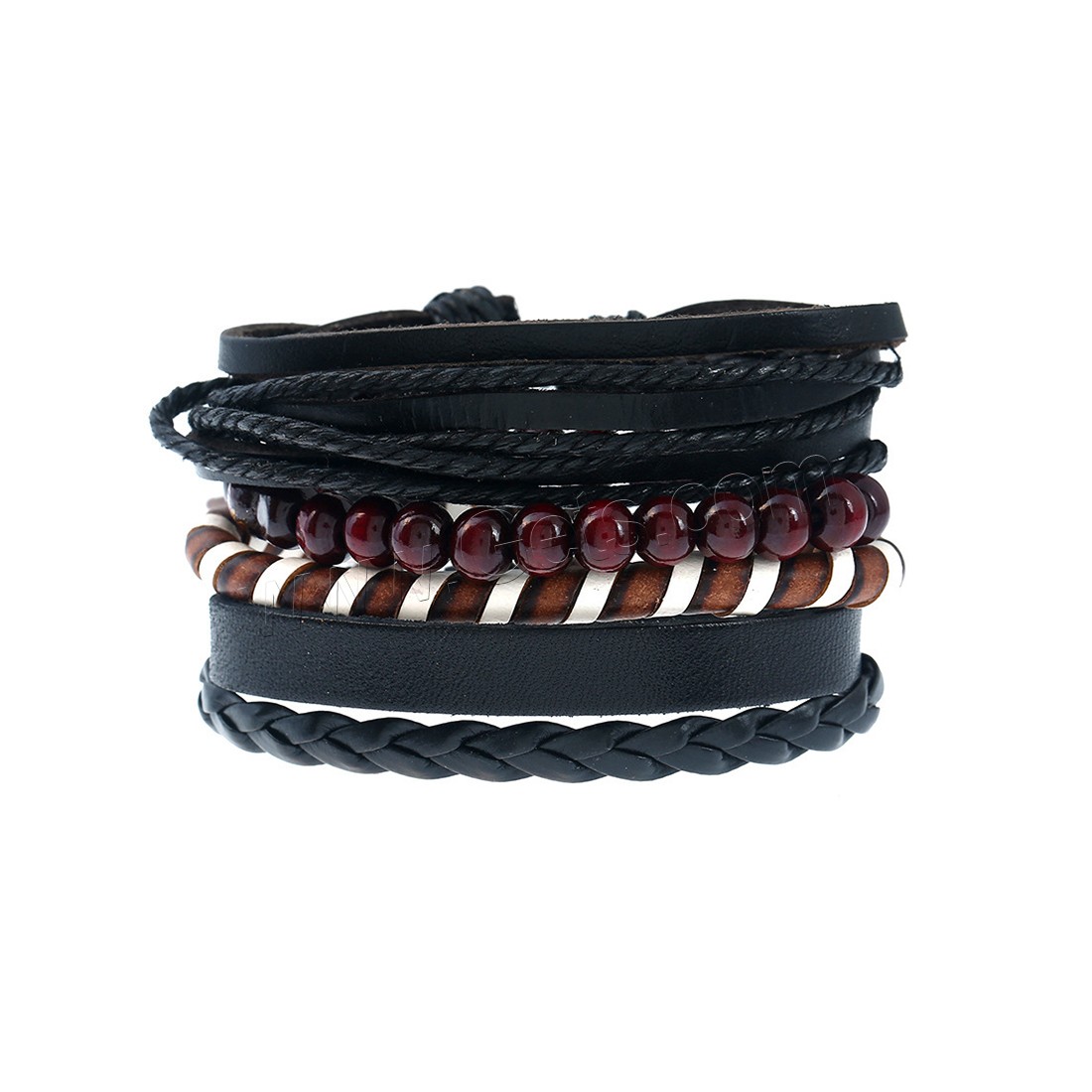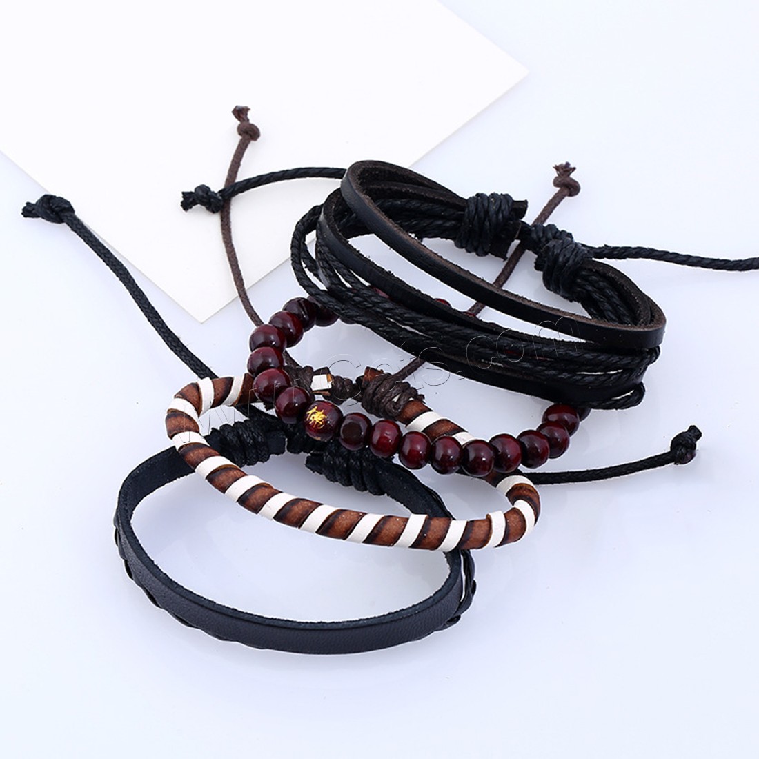 cuir de peau de vache Set de bracelet, Bracelet, avec Chanvre & bois, bracelet tressé & réglable & pour homme, Longueur:Environ 6.7-11.8 pouce, 4Strandstoron/fixé, Vendu par fixé