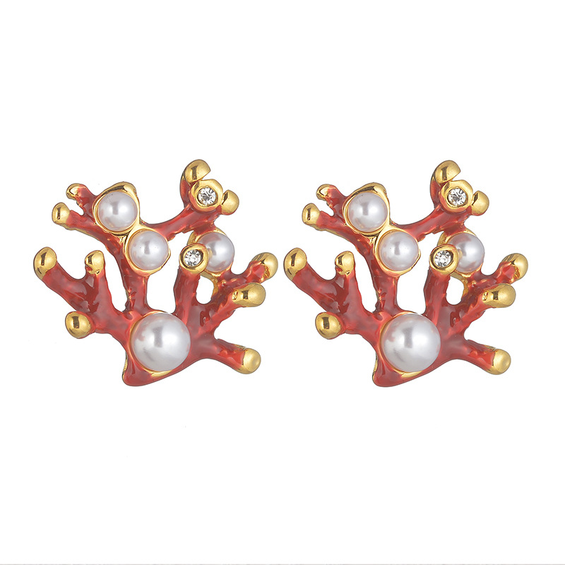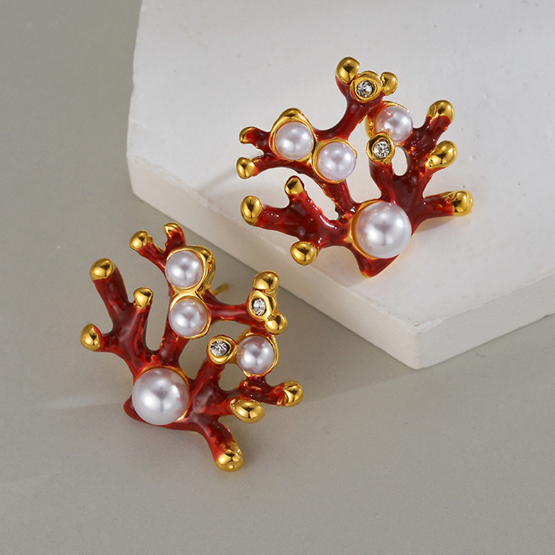 clou d'oreille en acier inoxydable avec stras, Acier inoxydable 304, avec perle de plastique, Placage de couleur d'or, pour femme & émail & avec strass, rouge, Vendu par paire