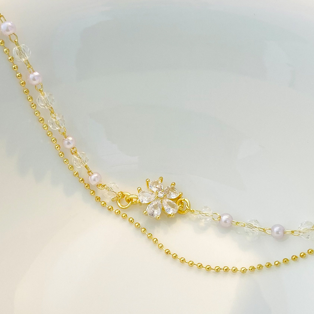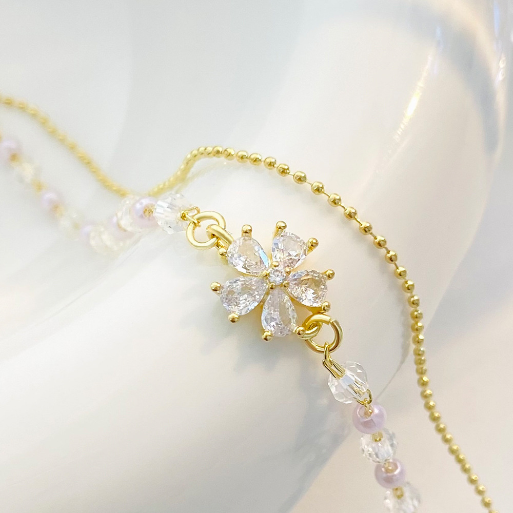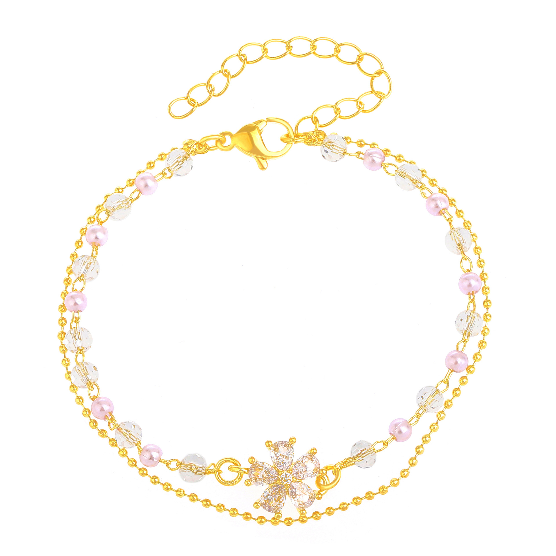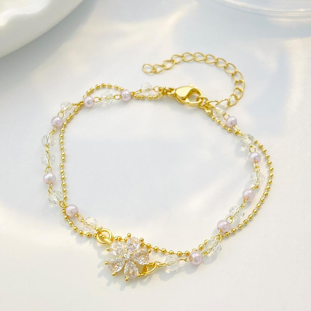 laiton bracelet, avec cristal, fleur, plaqué de couleur d'or KC, Double couche & pavé de micro zircon & pour femme, Longueur:Environ 6-7 pouce, Vendu par PC