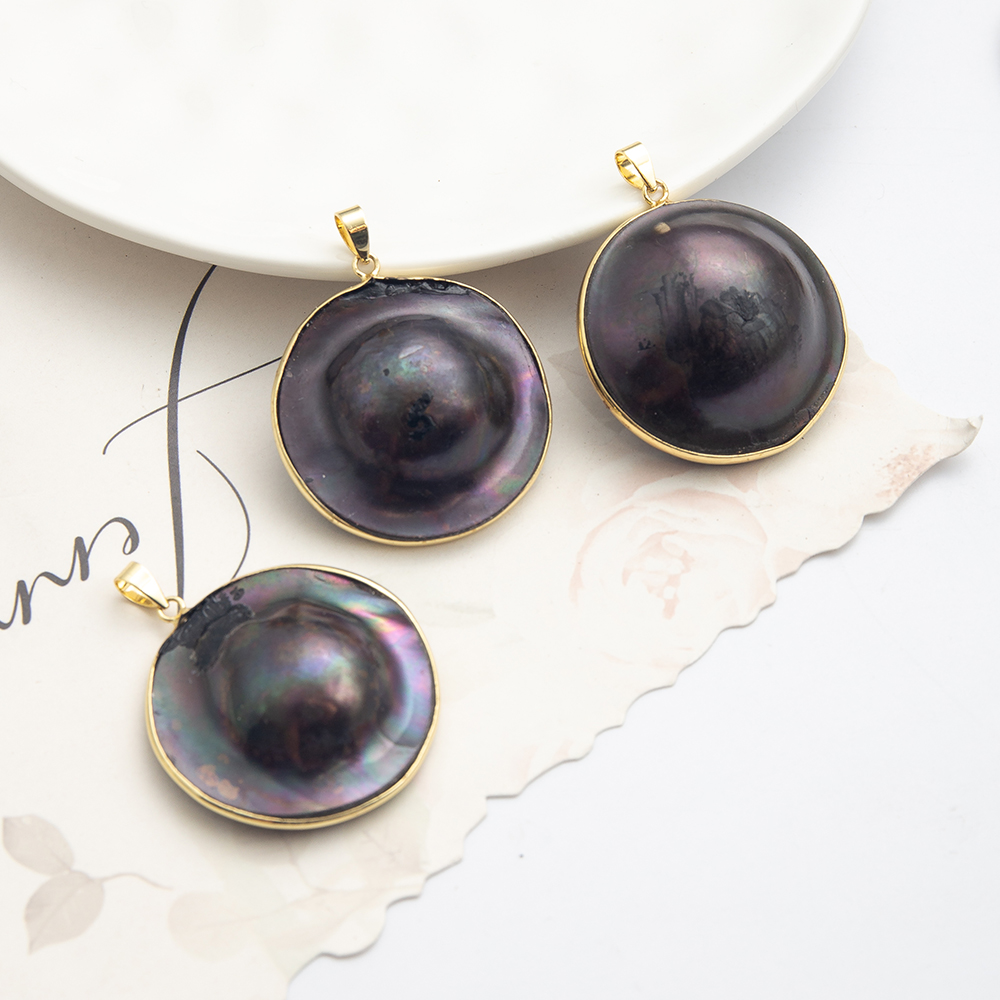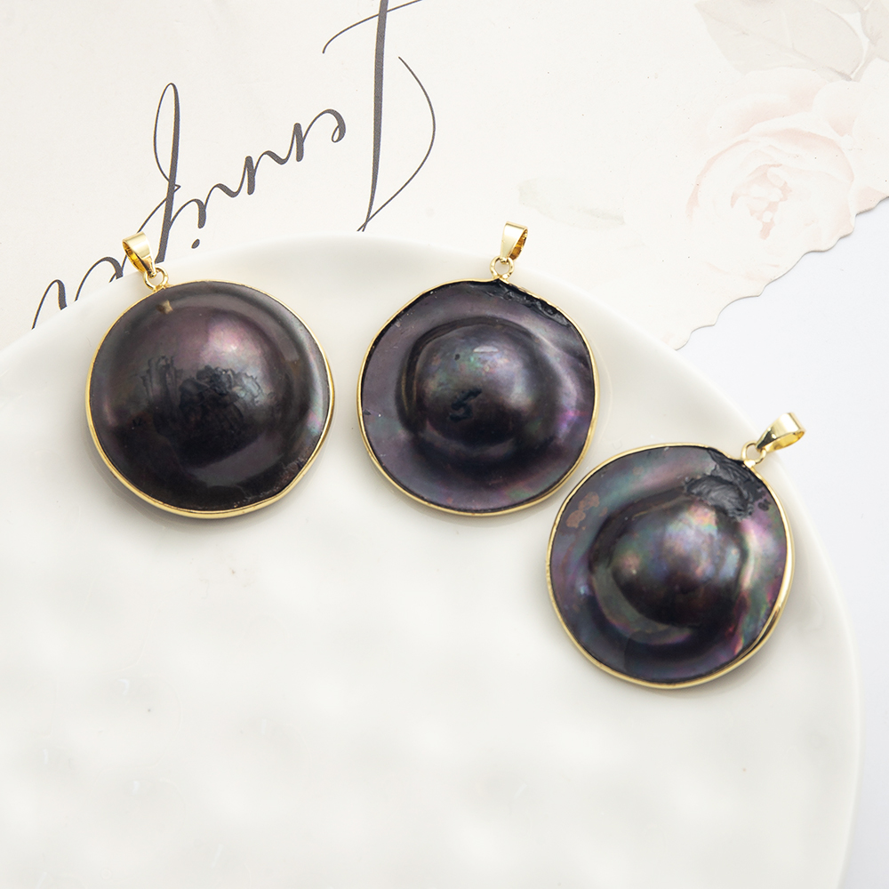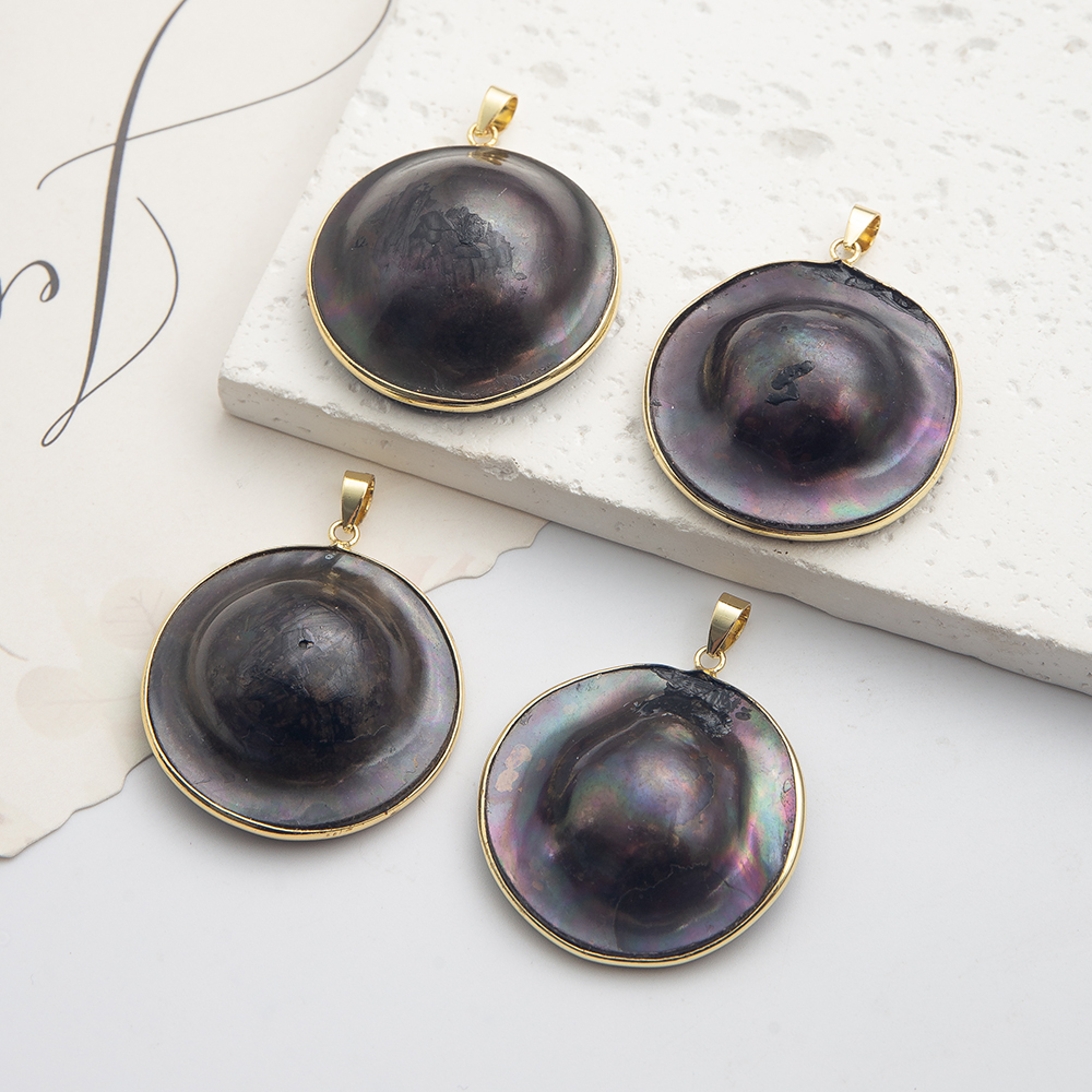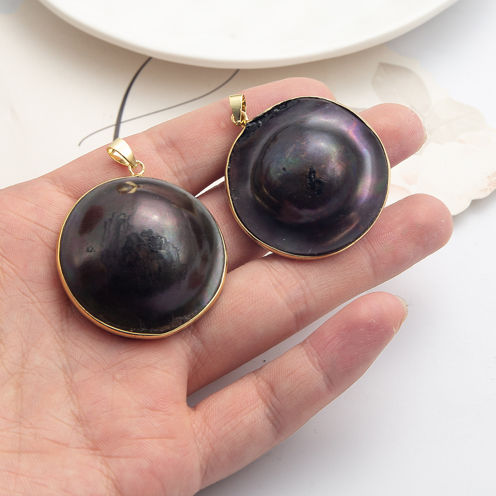 perle d'eau douce cultivée Pendentif, avec Alliage & coquille noire, Rond, Placage de couleur d'or, bijoux de mode, noire, 37x37mm, Vendu par PC