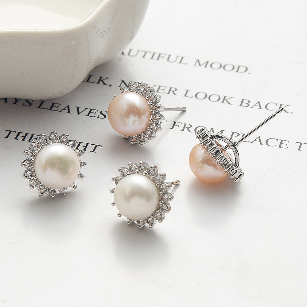 perle d'eau douce cultivée boucle d oreille dormeuse, laiton puce boucle d'oreille, dôme, avec strass, plus de couleurs à choisir, 11--12mm, Vendu par paire