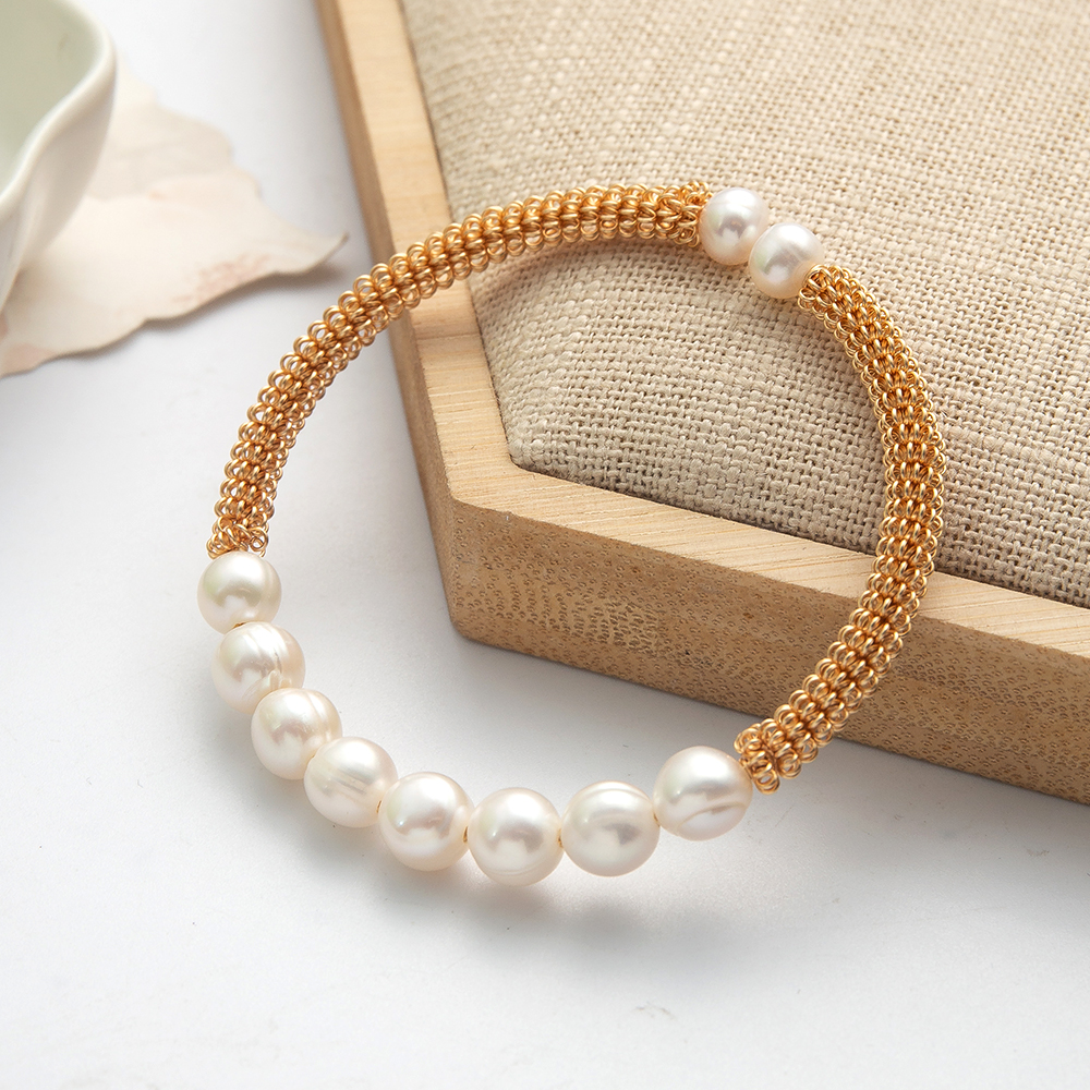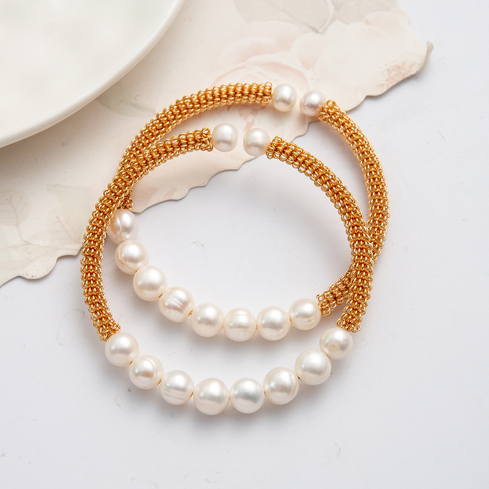 perle d'eau douce cultivée bracelet manchette, avec Alliage, Rond, Placage de couleur d'or, bijoux de mode, blanc, Diamètre intérieur:Environ 60mm, Vendu par PC