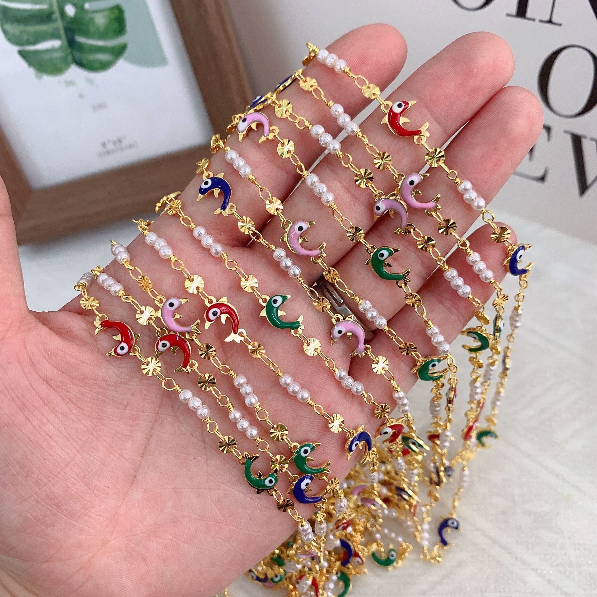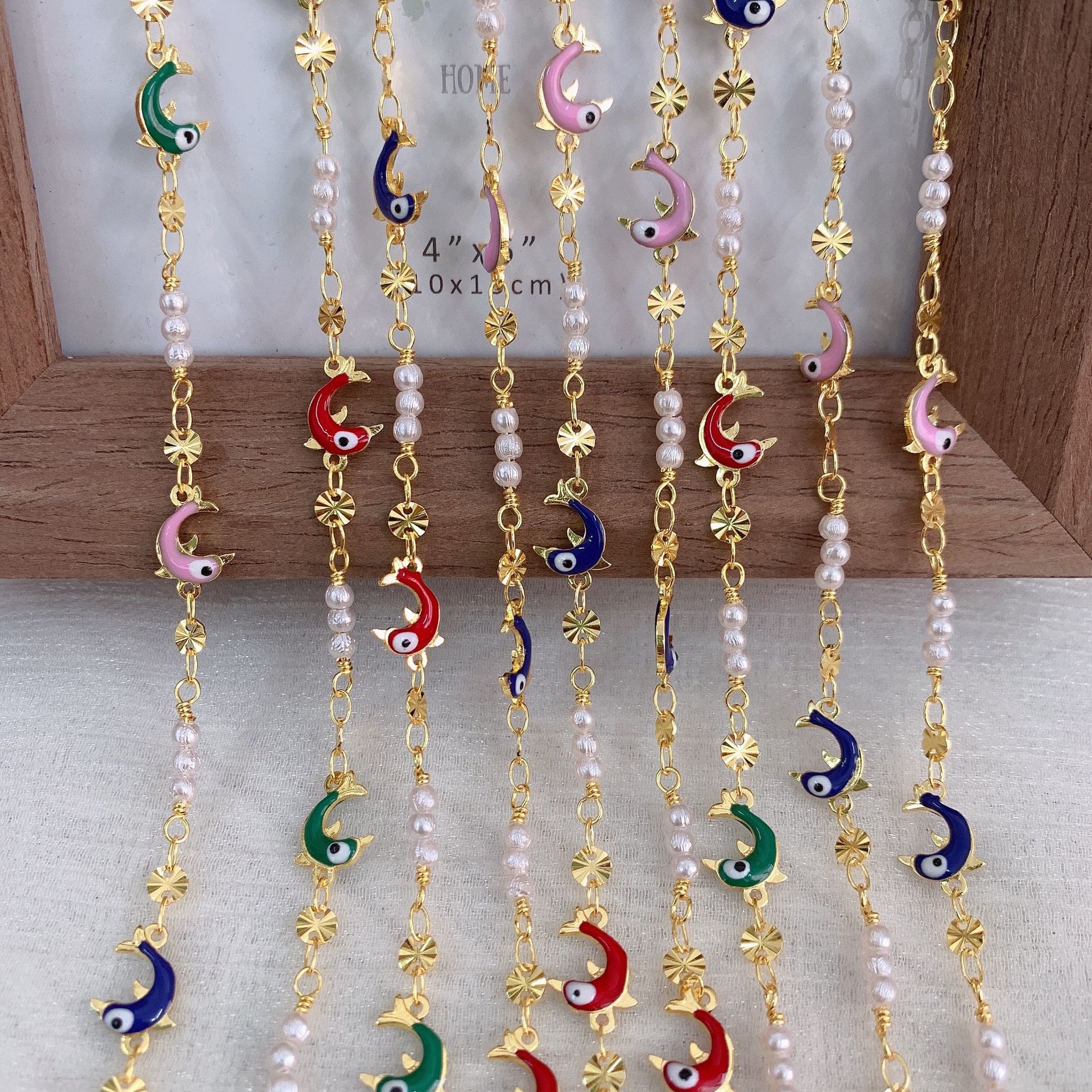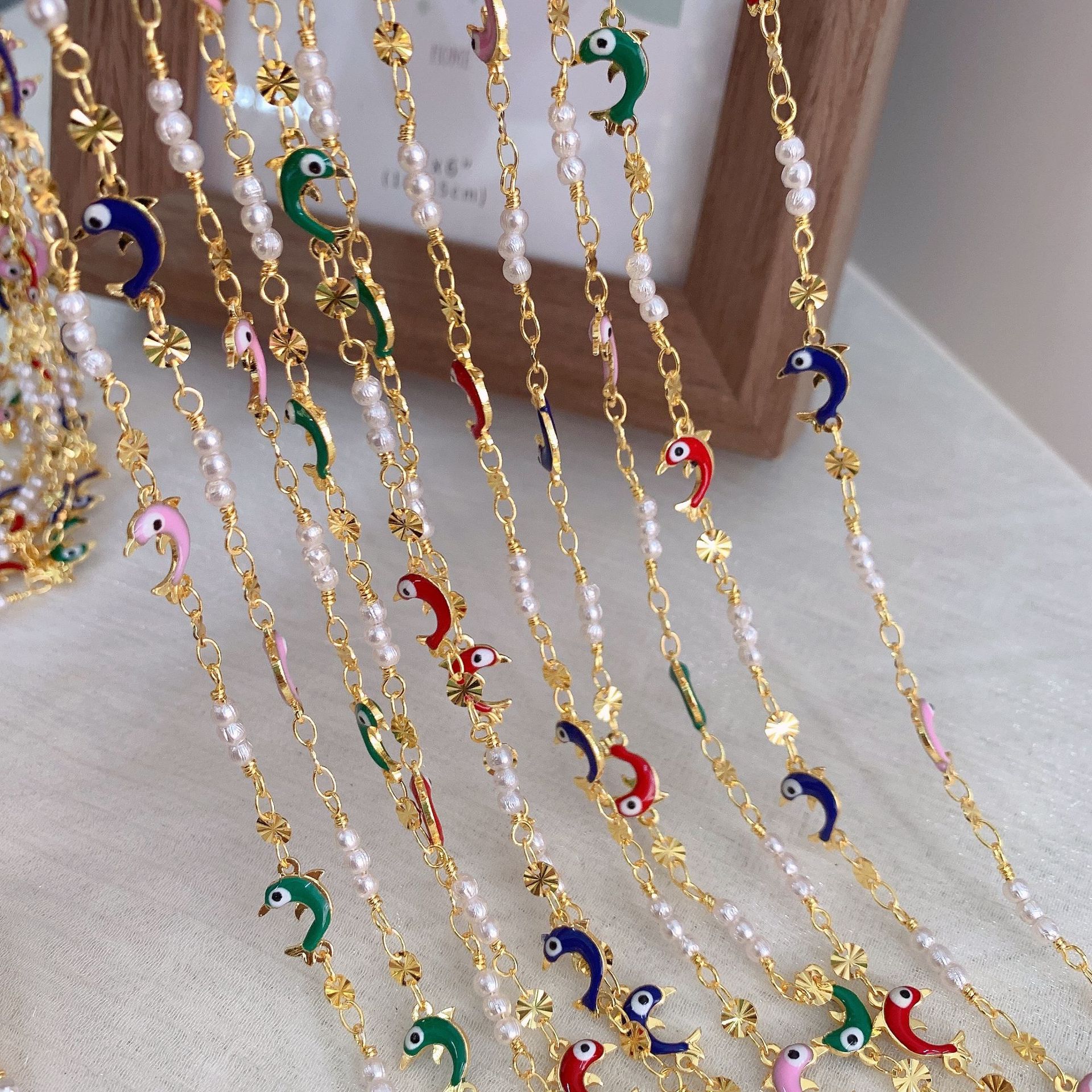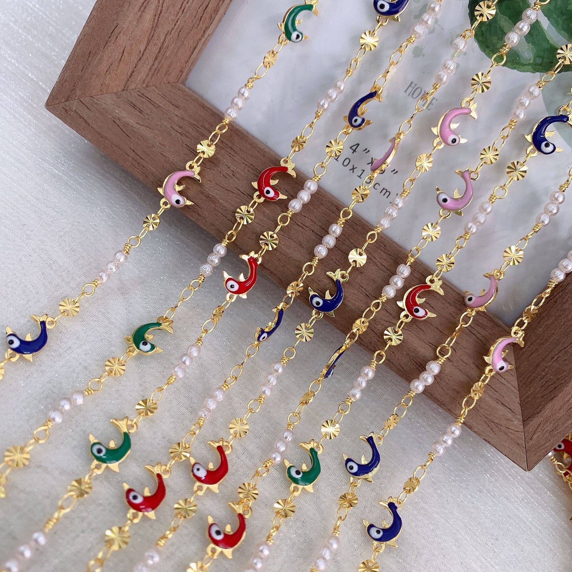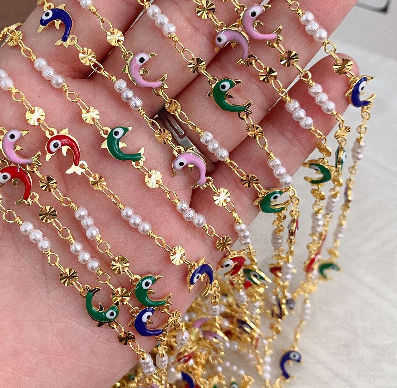 宝石用原石ビーズチェーン, 銅, とともに プラスチック製パール, イルカ, ゴールドメッキ, DIY & エナメル, ミックスカラー, 10M/バッグ, 売り手 バッグ