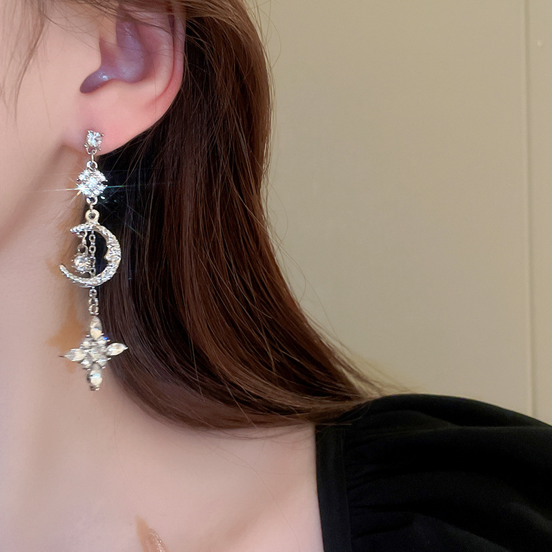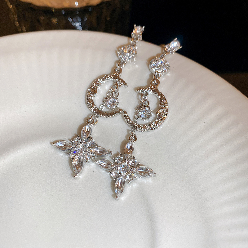 亜鉛合金ラインス トーン ドロップ イヤリング, 亜鉛合金, 月とスター, 女性用 & ライン石のある & くり抜き, シルバー, 65x22mm, 売り手 ペア