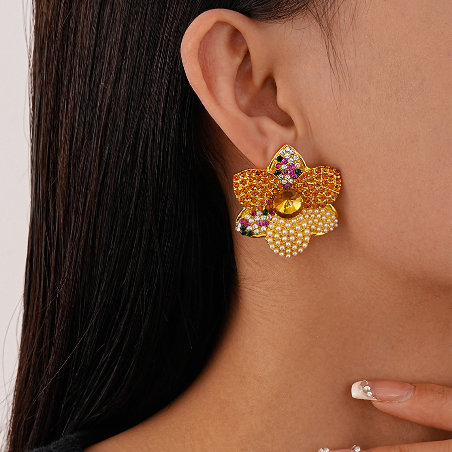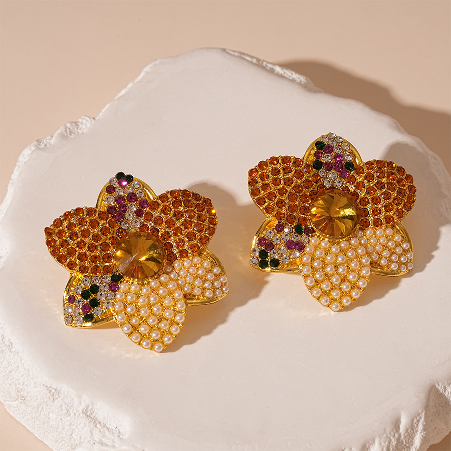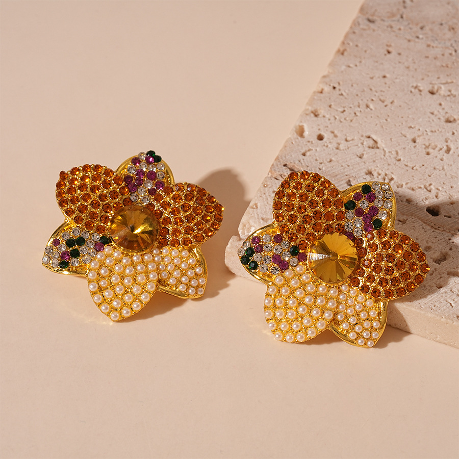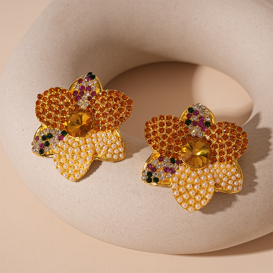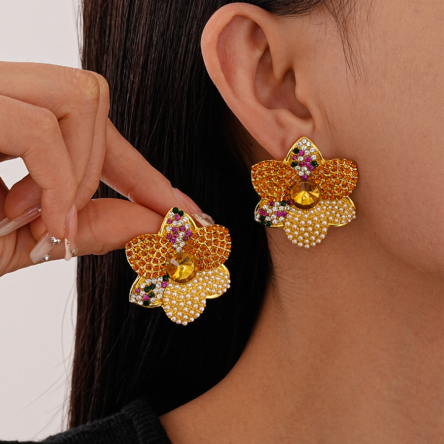 亜鉛合金ラインス トーン スタッド ピアス, 亜鉛合金, とともに プラスチック製パール, 花形, ゴールドメッキ, ファッションジュエリー & ライン石のある, 金色, 35x40mm, 売り手 ペア