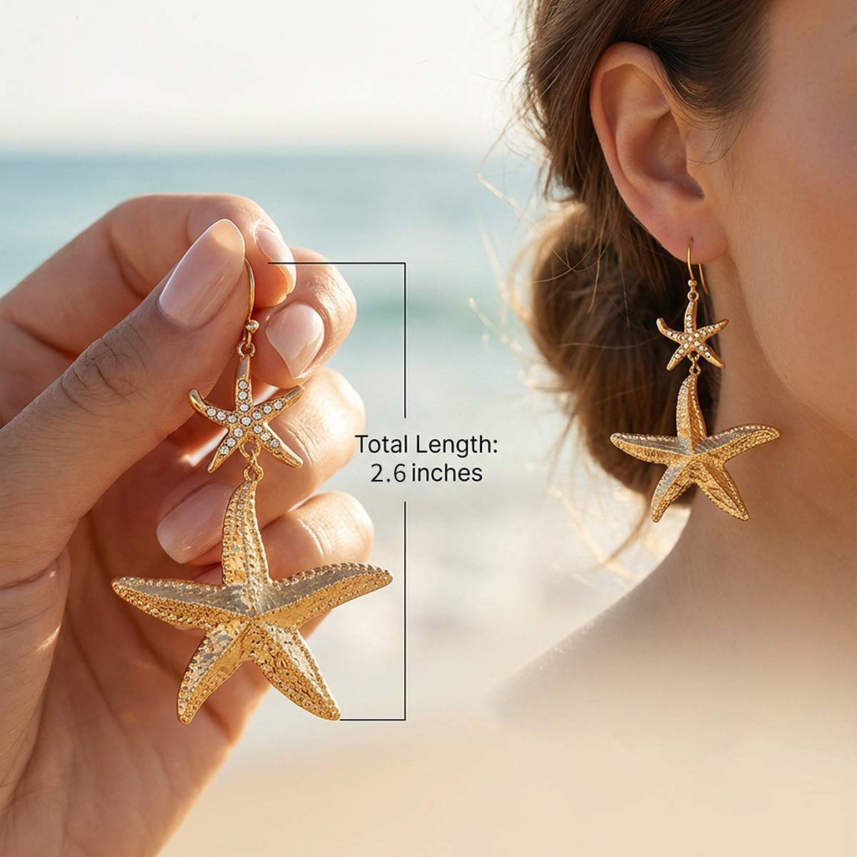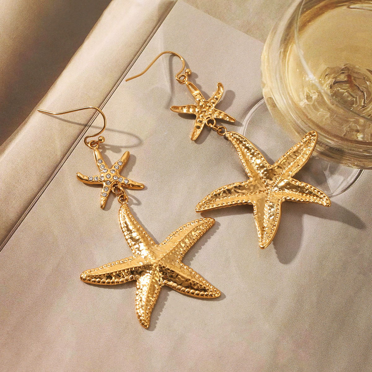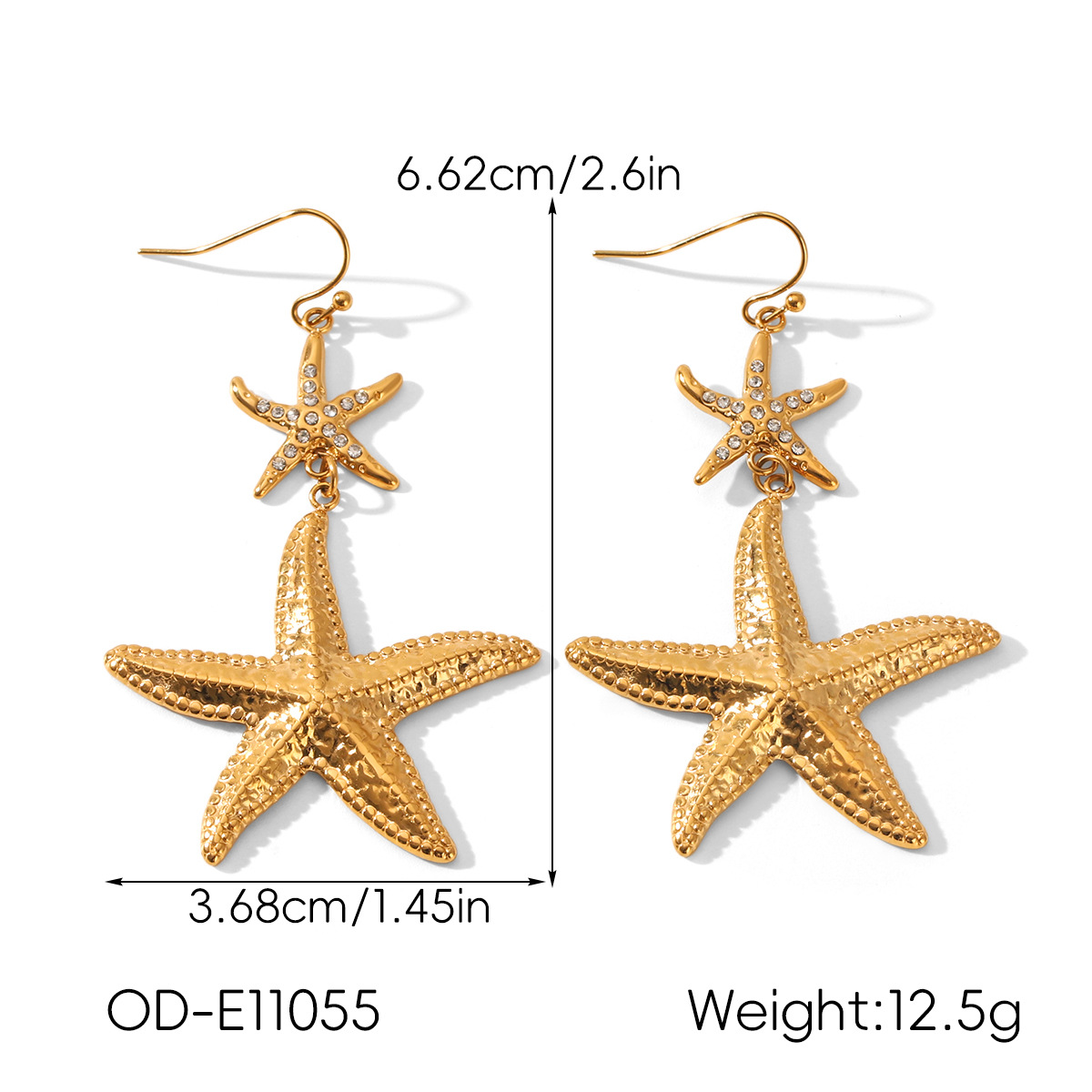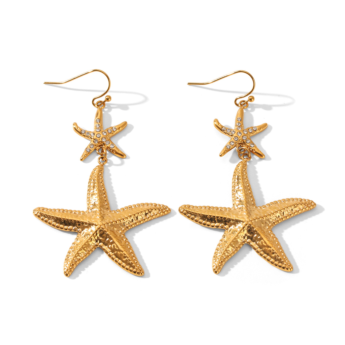 304 Stainless Steel Drop Earring, Starfish, gold color plated, for woman & with rhinestone, 36.8x66.2mm, Sold By Pair