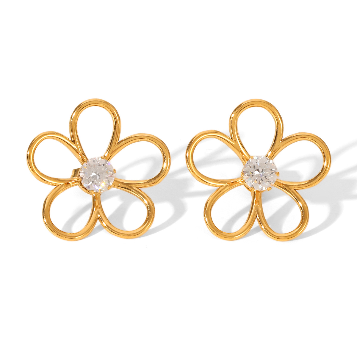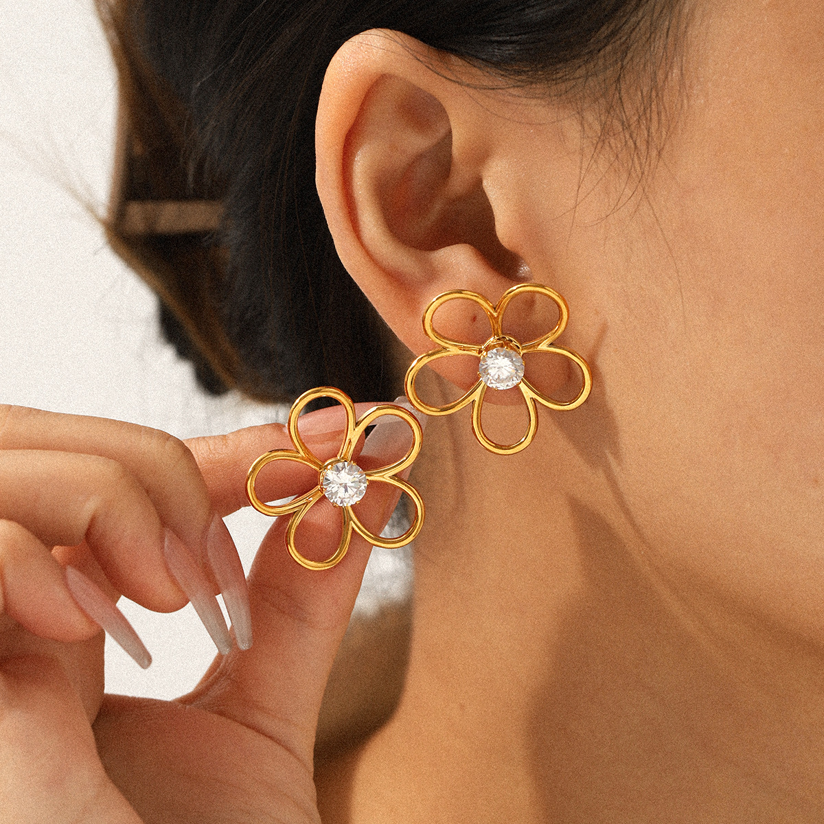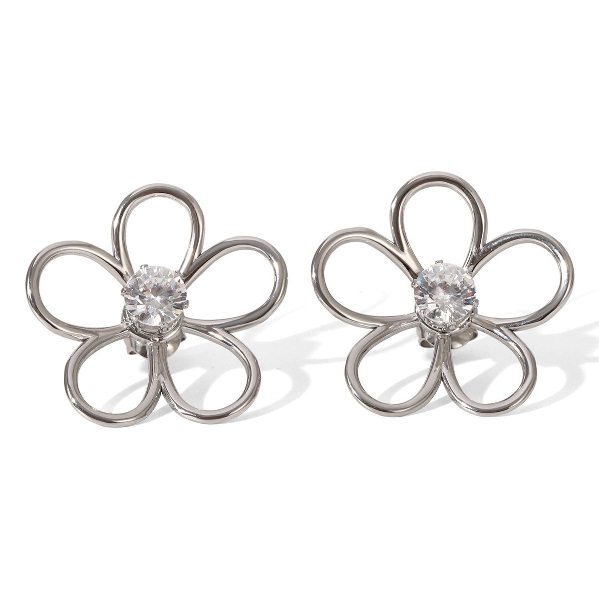 304 Stainless Steel Stud Earring, Flower, plated, for woman & with cubic zirconia & hollow, more colors for choice, 29.6x28.7mm, Sold By Pair