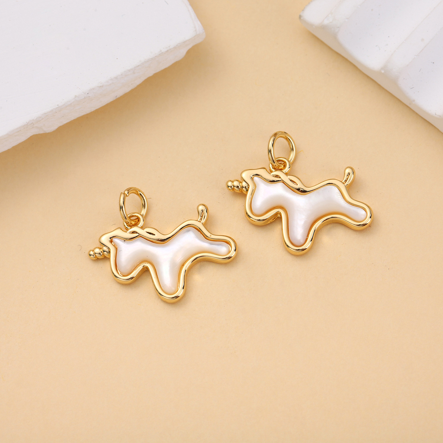 Brass Shell Pendants, with White Shell, Flat Round, 18K gold plated, four leaf clover design & DIY