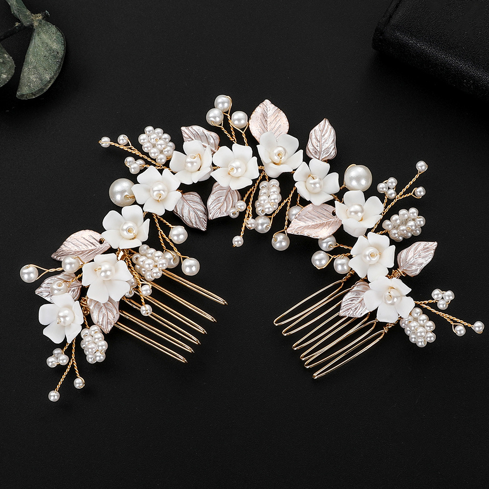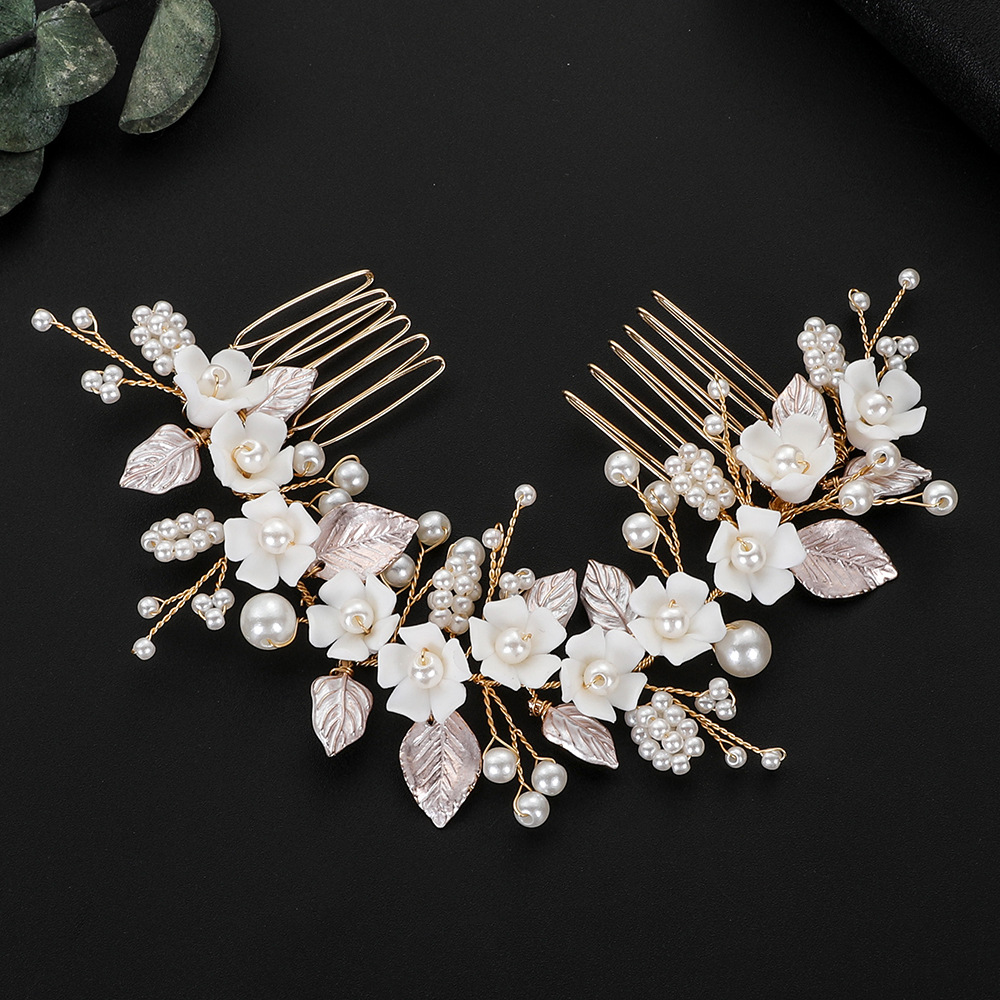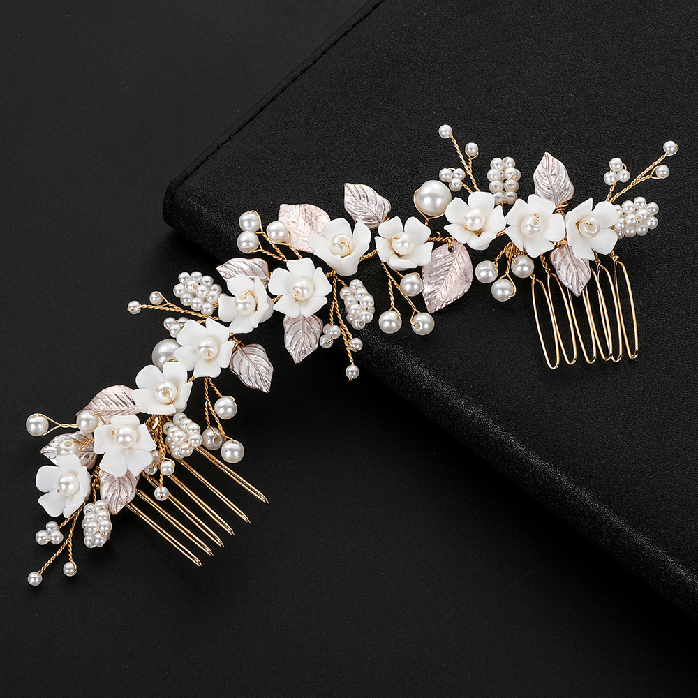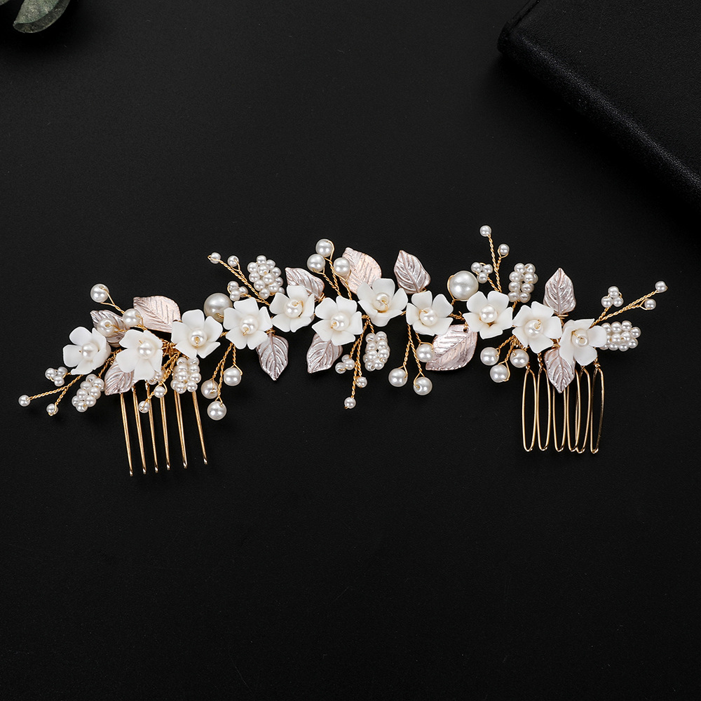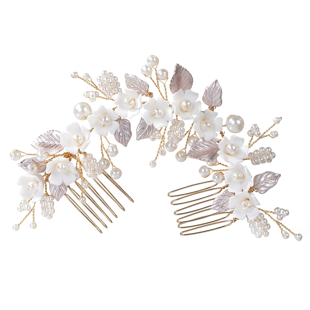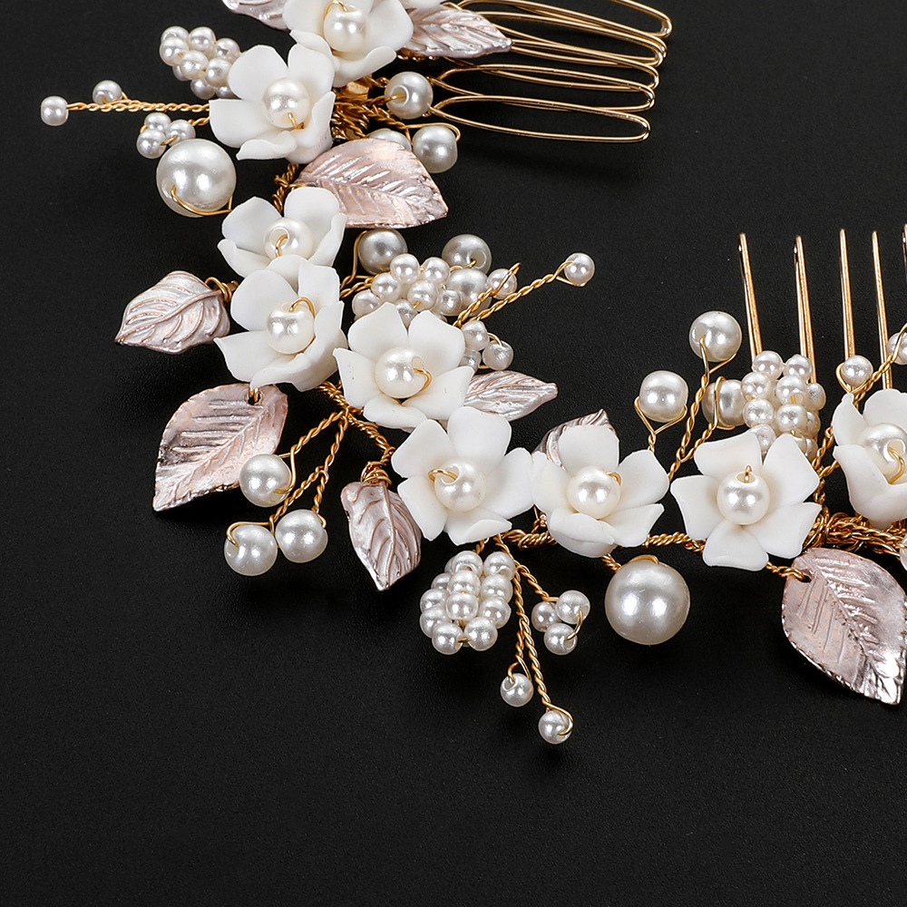 Bridal Decorative Hair Comb, Zinc Alloy, with brass wire & Polymer Clay & Plastic Pearl, handmade, fashion jewelry & for woman, golden, 160x80x15mm, Sold By PC