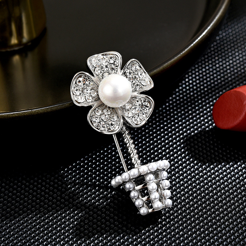 Cubic Zirconia Brooch, Brass, with Shell Pearl, plated, micro pave cubic zirconia & for woman, silver color, 40x19mm, Sold By PC