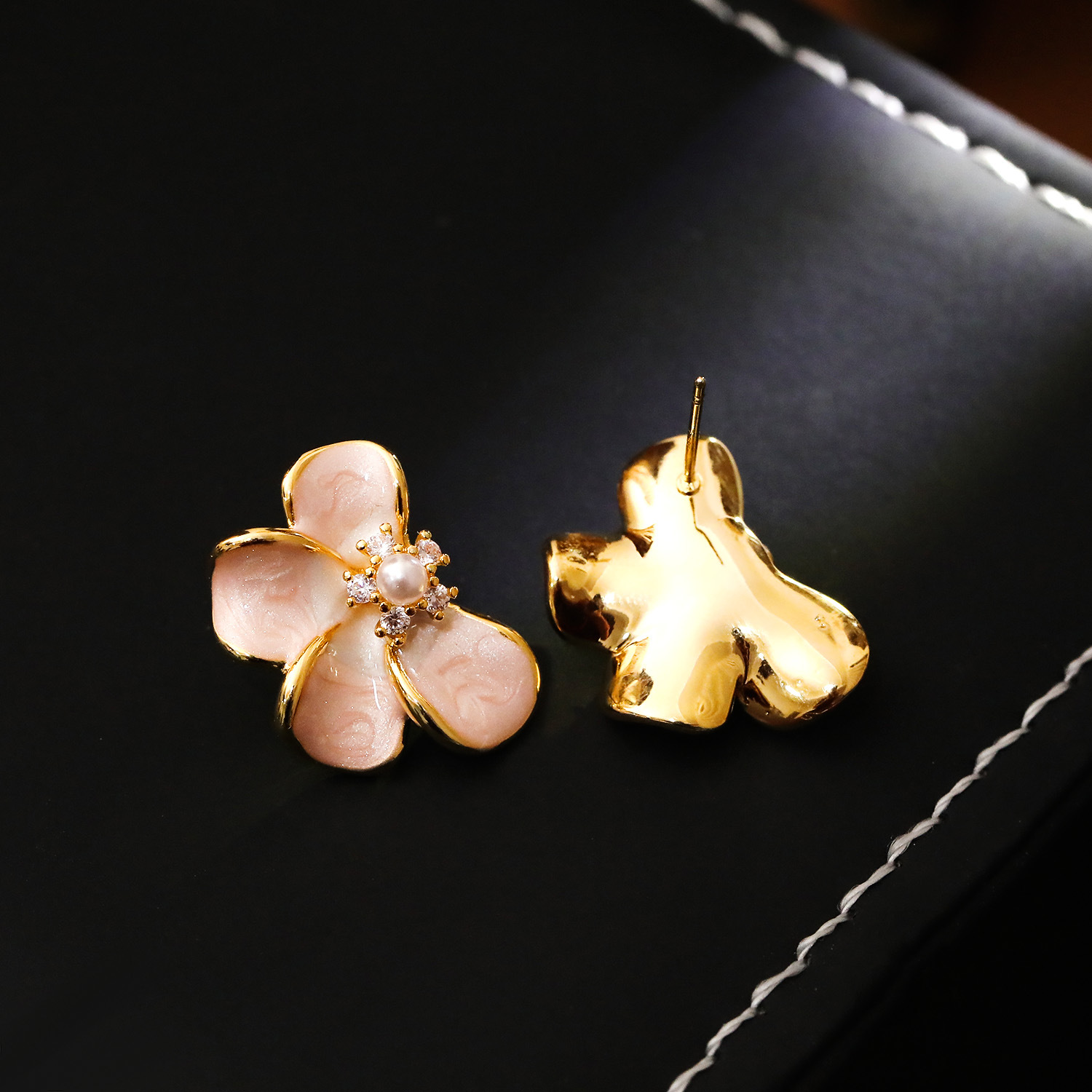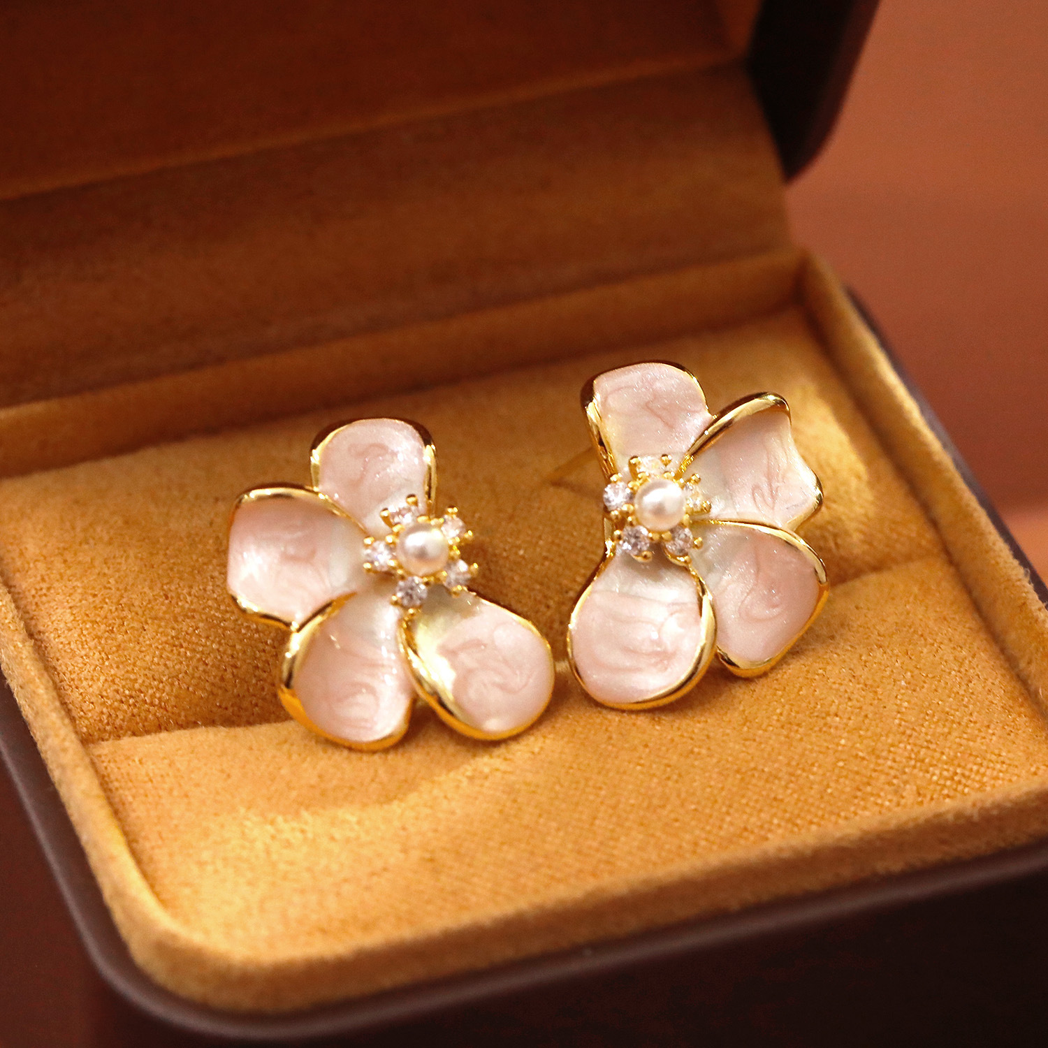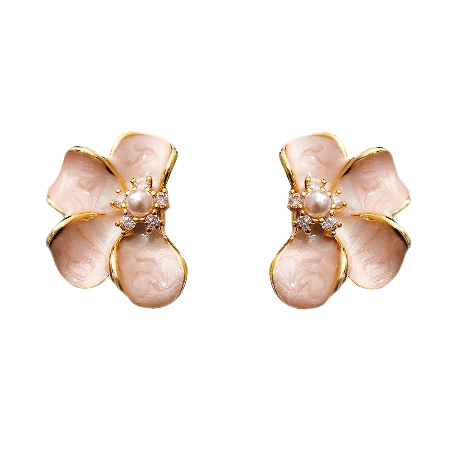 Cubic Zirconia Micro Pave Brass Earring, with Plastic Pearl, Flower, plated, micro pave cubic zirconia & for woman & enamel, golden, 21x15mm, Sold By Pair