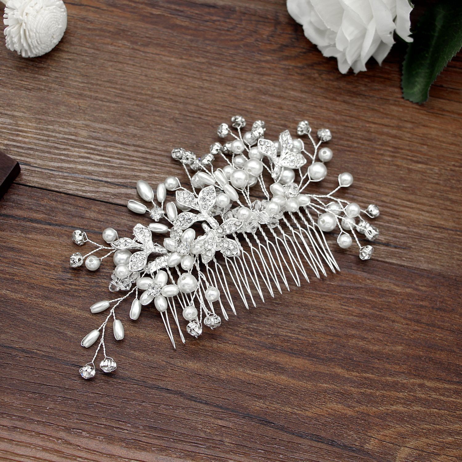 Decorative Hair Combs, Zinc Alloy, with Resin & Plastic Pearl & for woman & with rhinestone, white