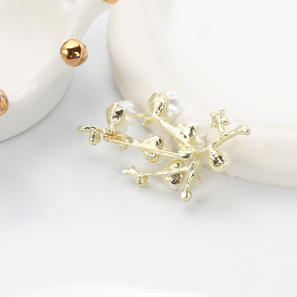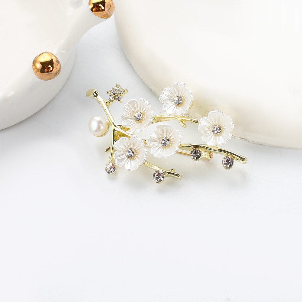 Freshwater Pearl Brooch, Zinc Alloy, with Freshwater Pearl & Acrylic, Plum Blossom, gold color plated, fashion jewelry & with rhinestone