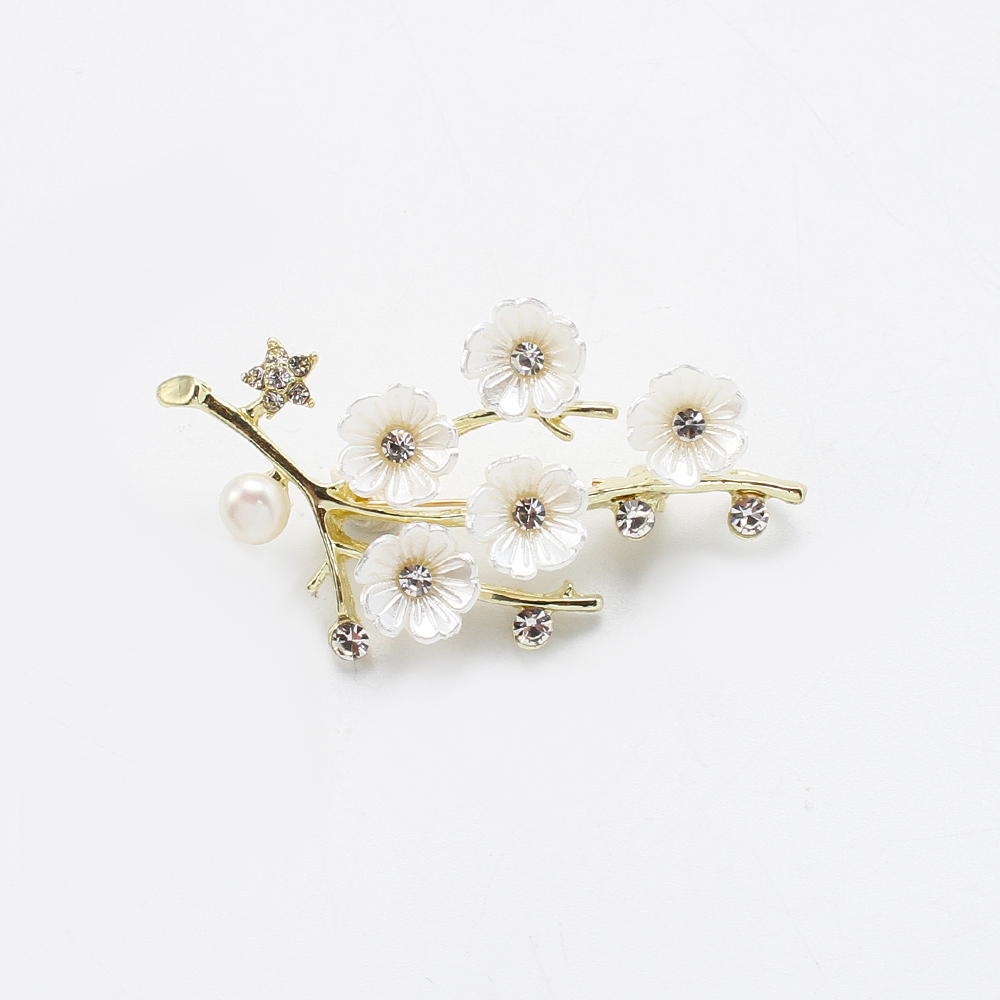 Freshwater Pearl Brooch, Zinc Alloy, with Freshwater Pearl & Acrylic, Plum Blossom, gold color plated, fashion jewelry & with rhinestone, more colors for choice, 59.12x13.56x33.8mm, Sold By PC