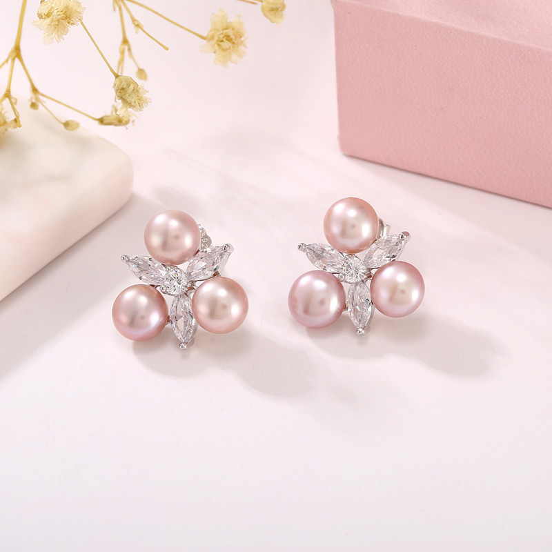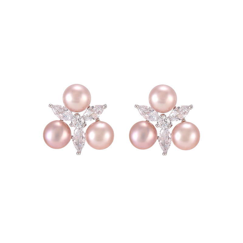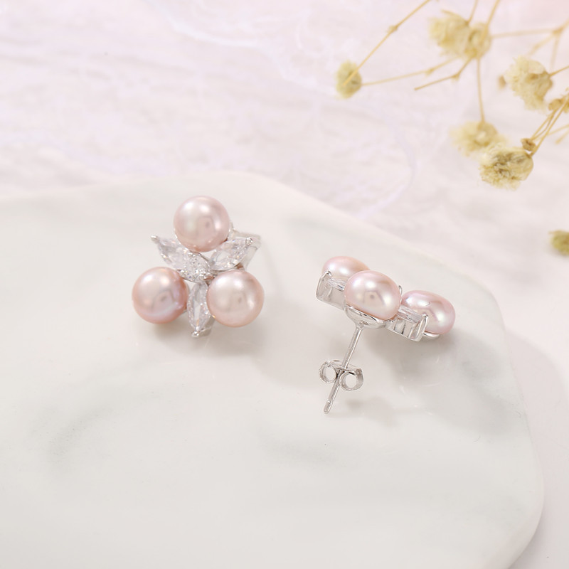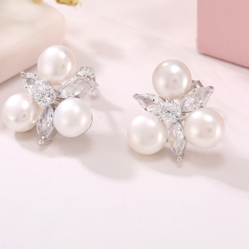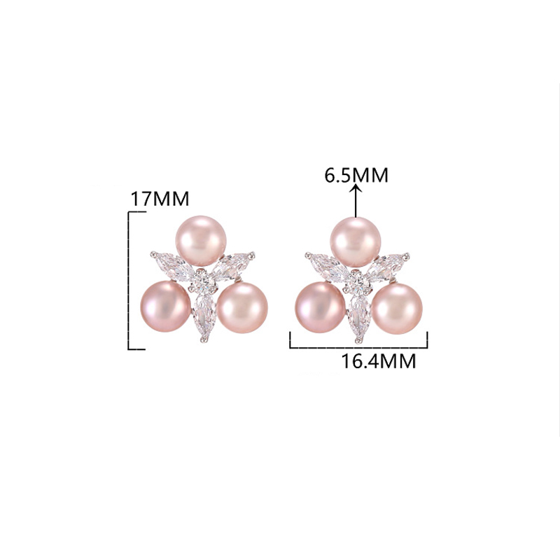 Freshwater Pearl Stud Earring, 925 Sterling Silver, with Freshwater Pearl, Geometrical Pattern, platinum plated, for woman & with rhinestone, more colors for choice, 16.4x17mm, 6.5mm, Sold By Pair