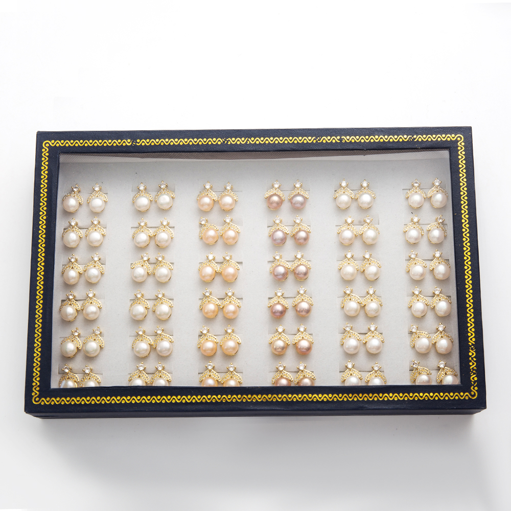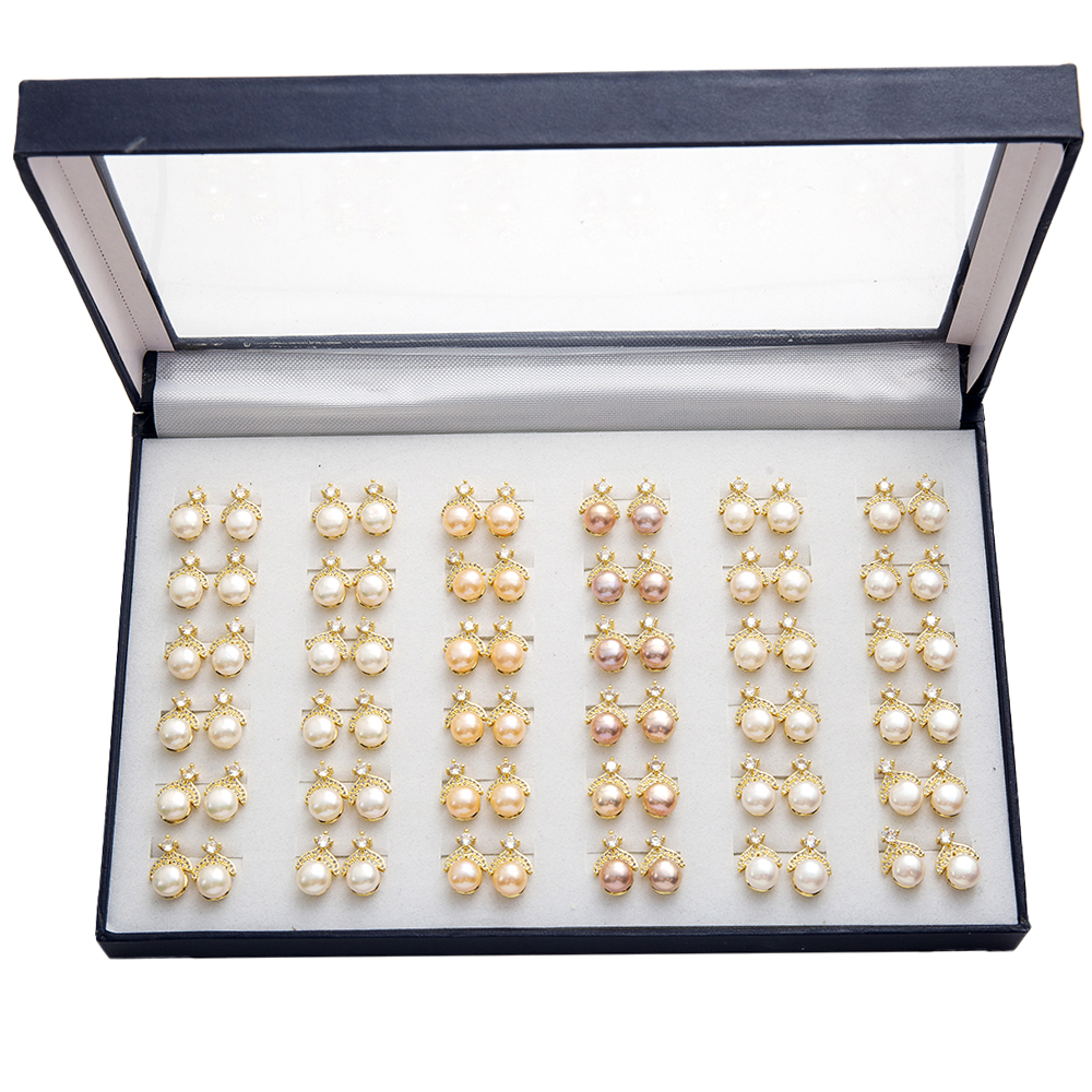 Freshwater Pearl Stud Earring, brass post pin, Dome, with rhinestone 11--12mm