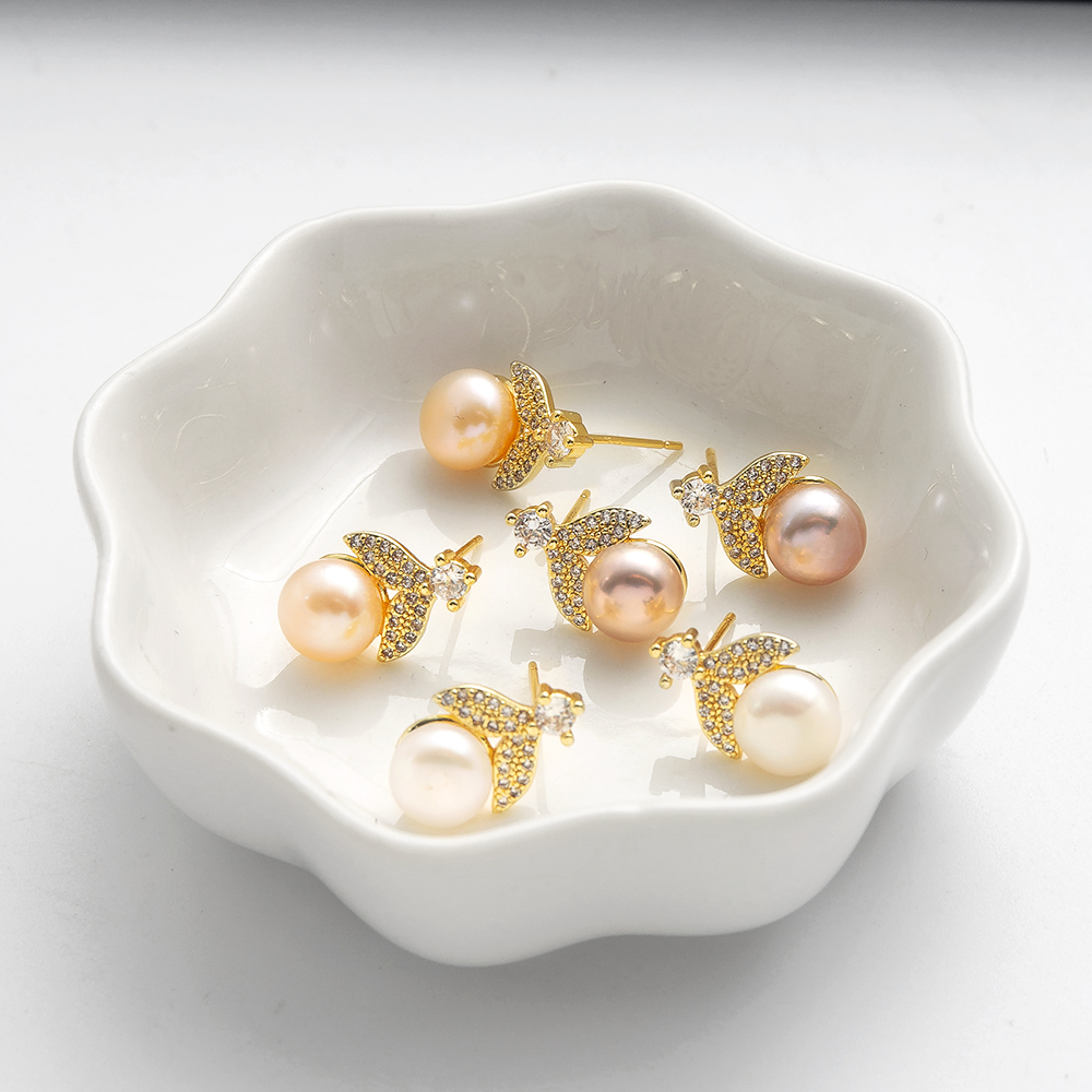 Freshwater Pearl Stud Earring, brass post pin, Dome 5--6mm