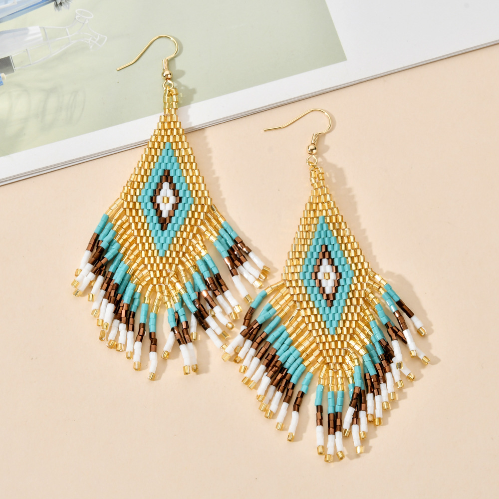Glass Seed Beads Earring, Iron, with Glass Seed Beads, Triangle, gold color plated, multi-colored