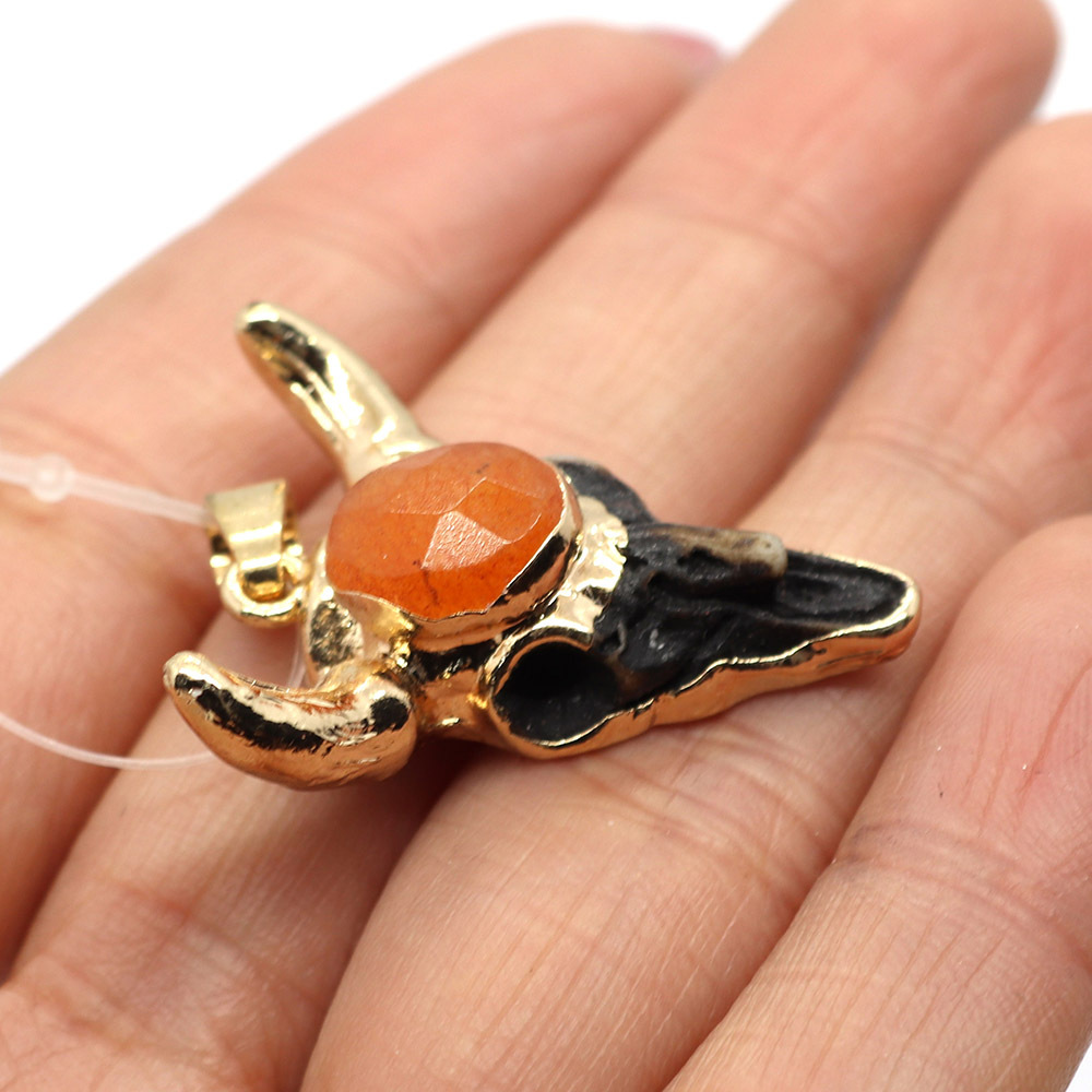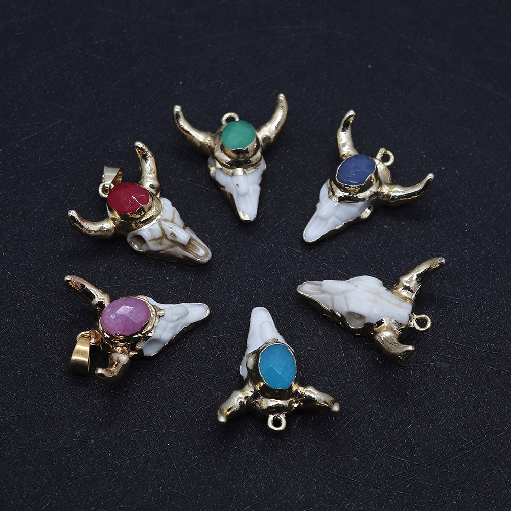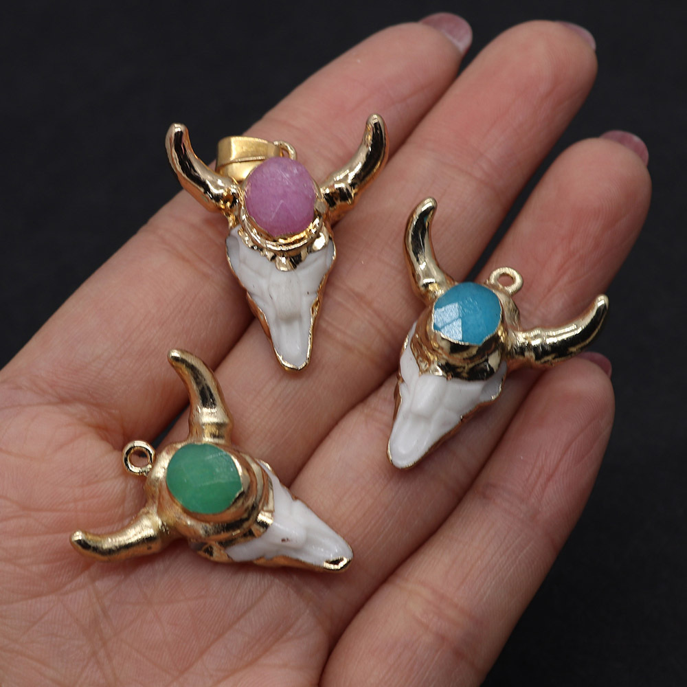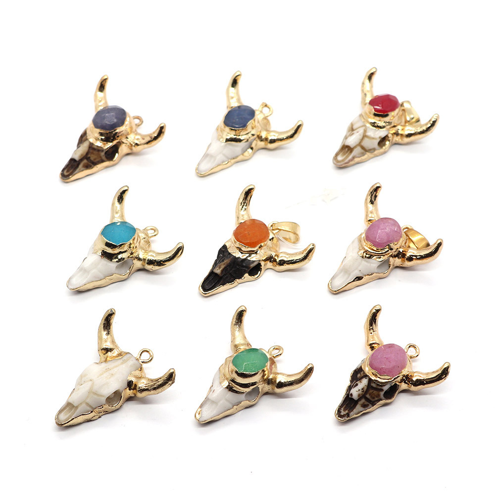Resin Brass Pendants, with Gemstone & Brass, Bull, gold color plated, DIY, more colors for choice, 31x26mm, Sold By PC