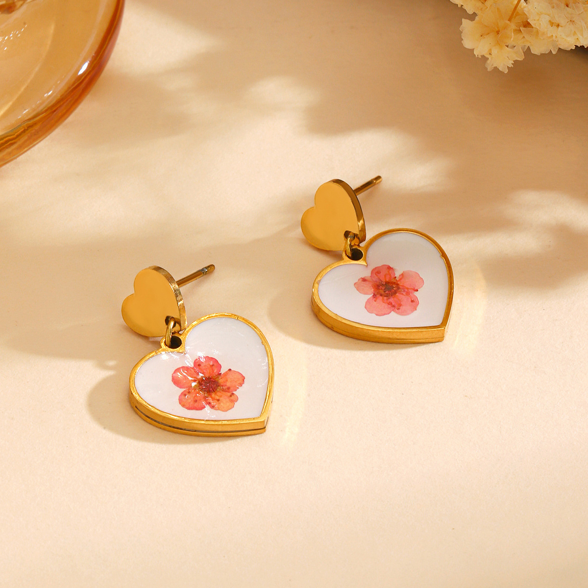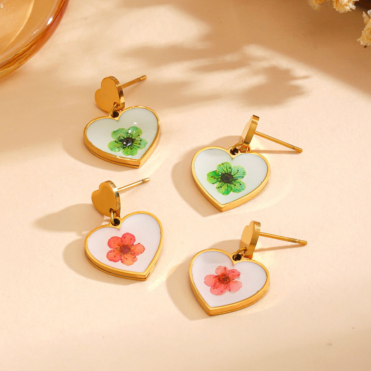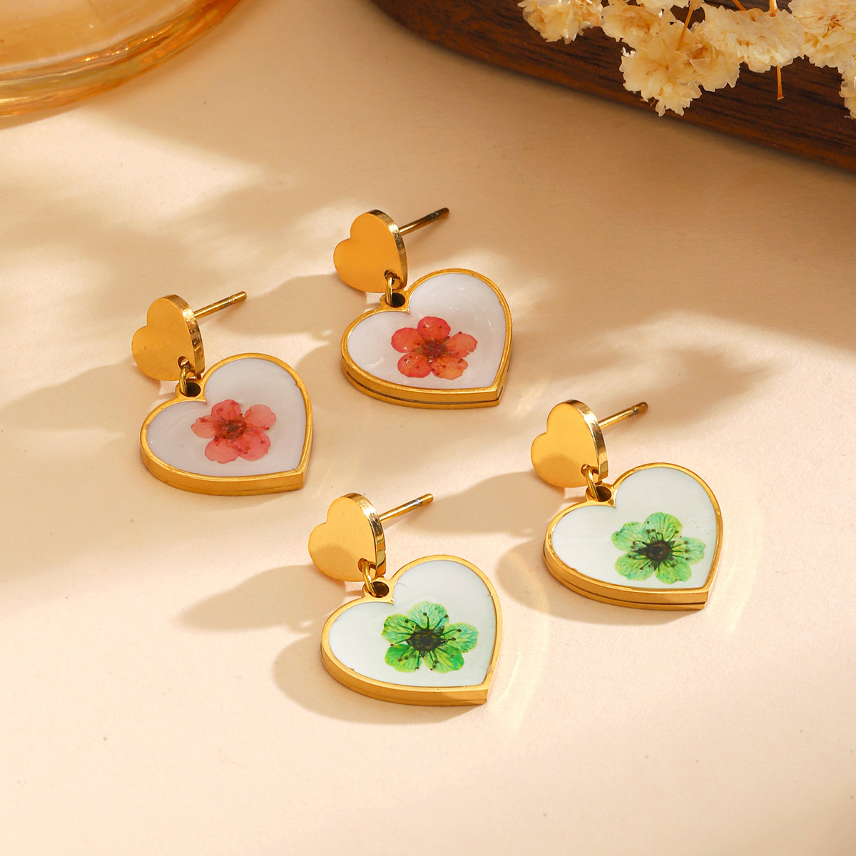 Resin Drop Earring, 304 Stainless Steel, with Dried Flower & Resin, Heart, 18K gold plated, fashion jewelry & different designs for choice & for woman, Sold By Pair